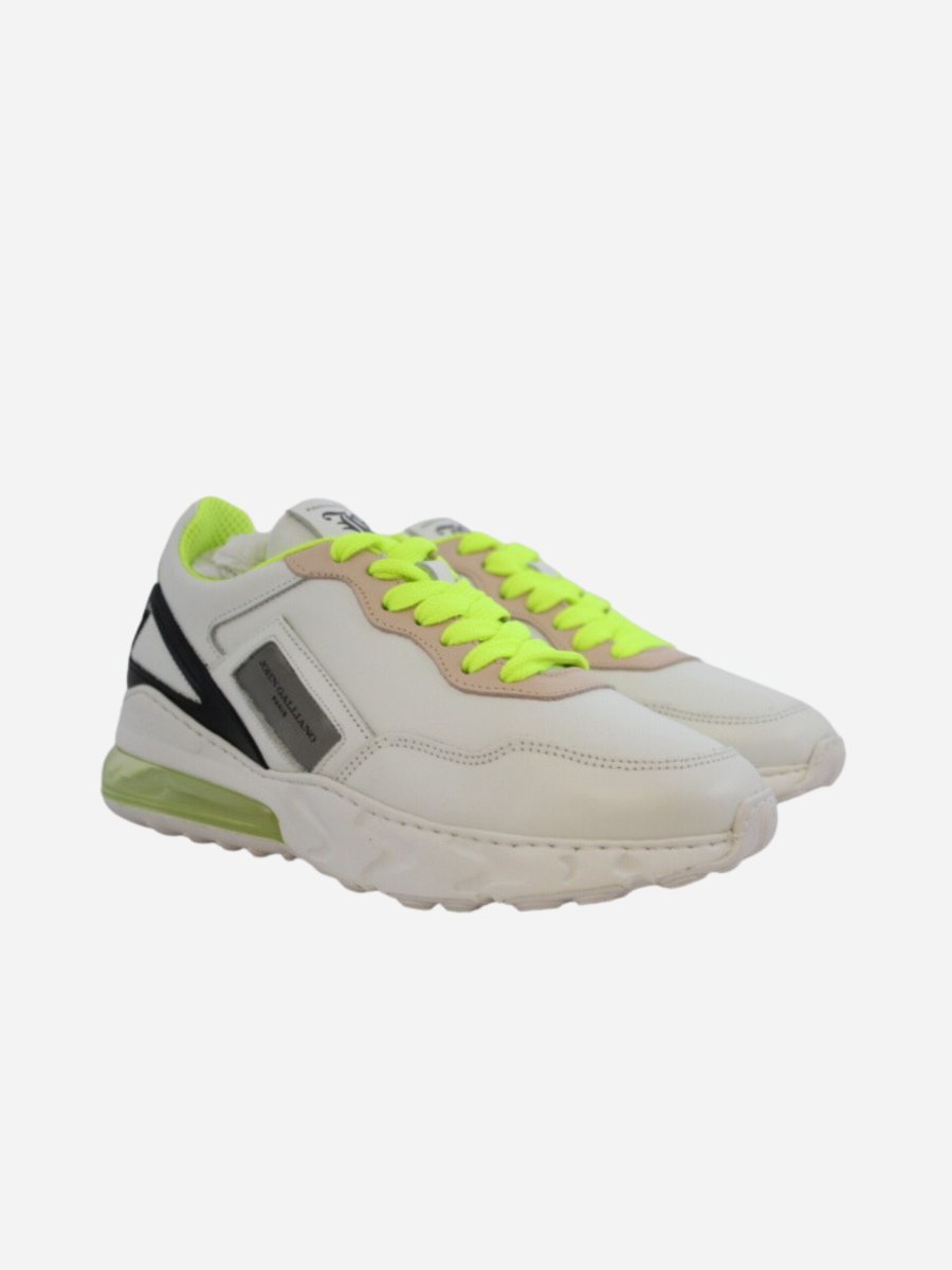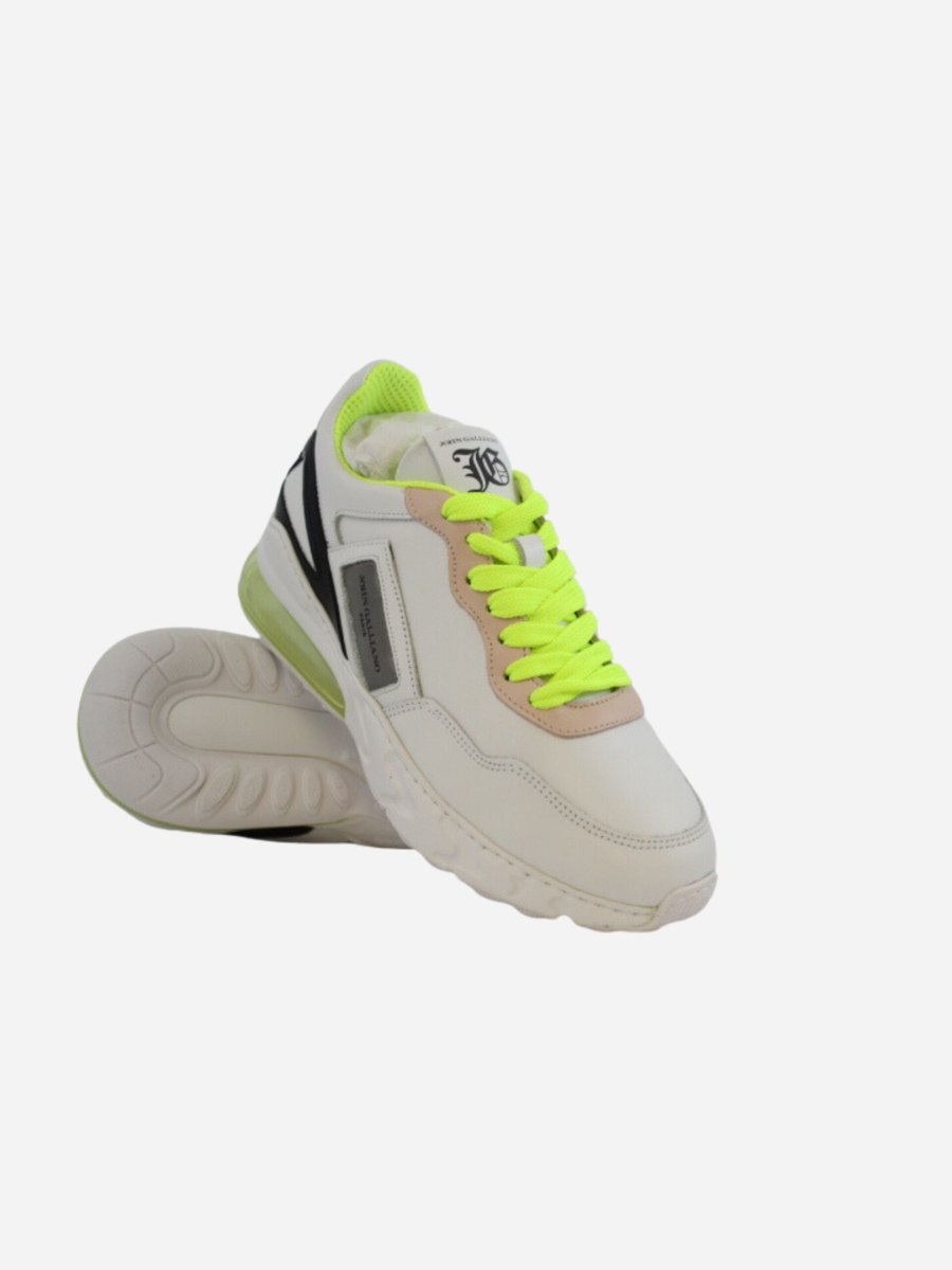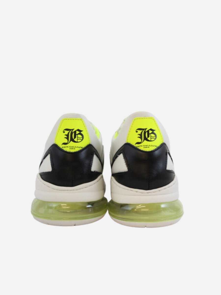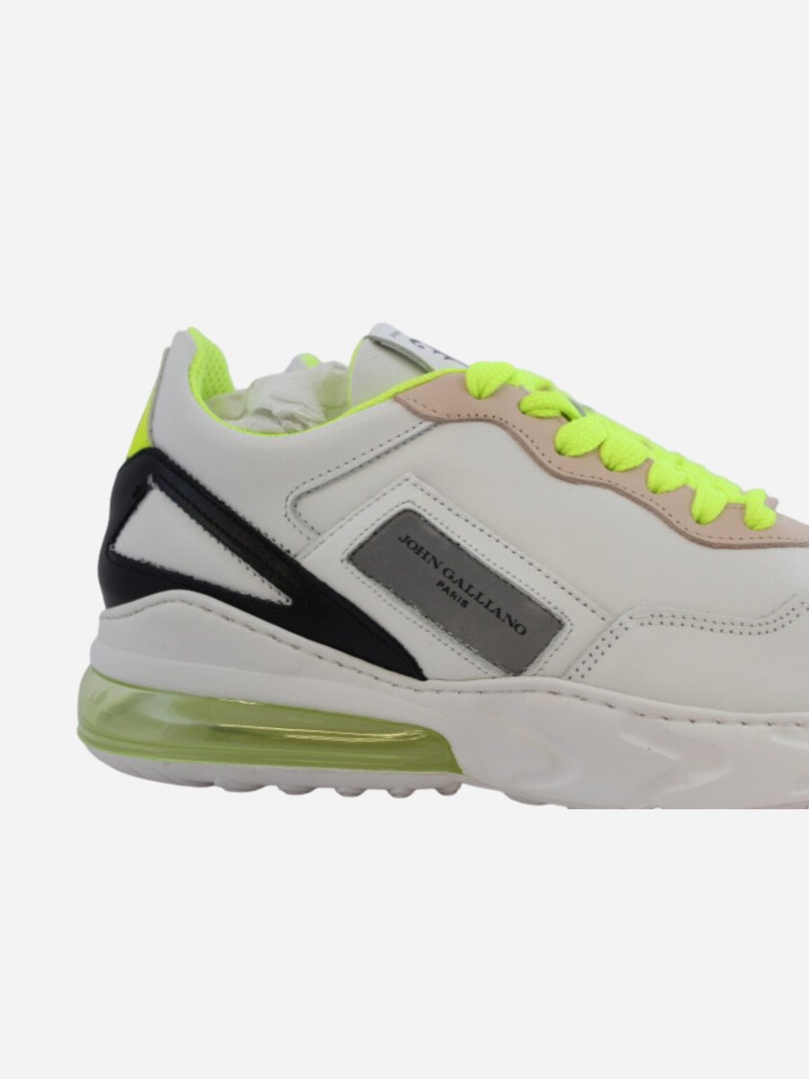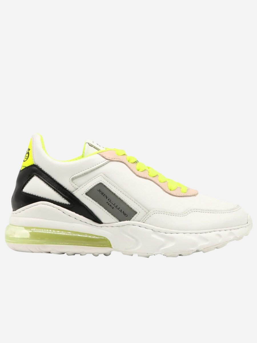 Sneakers by John Galliano. Scarpe realizzate in pelle bianca con dettagli fluo. Suola in gomma trasparente che riprende i dettagli della scarpa. Lacci colorati in cotone.