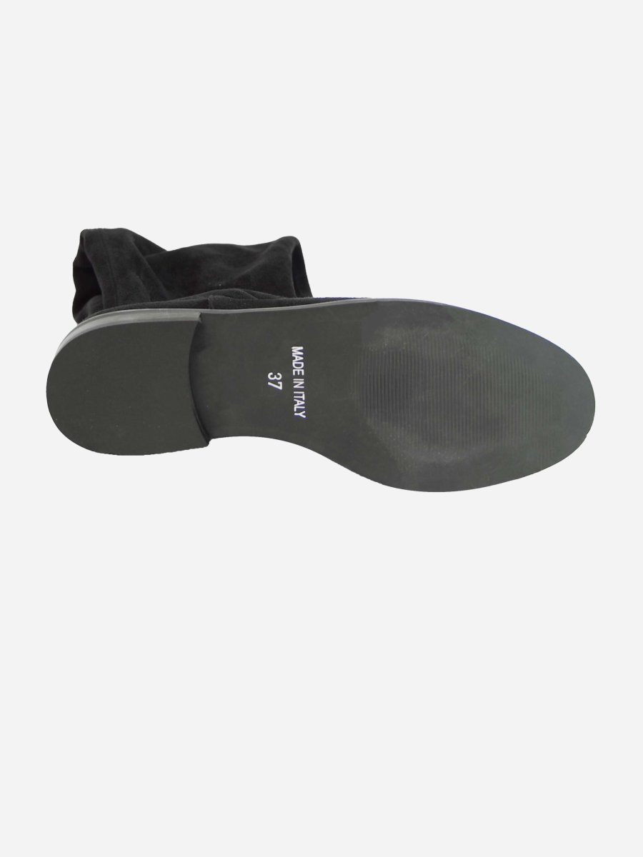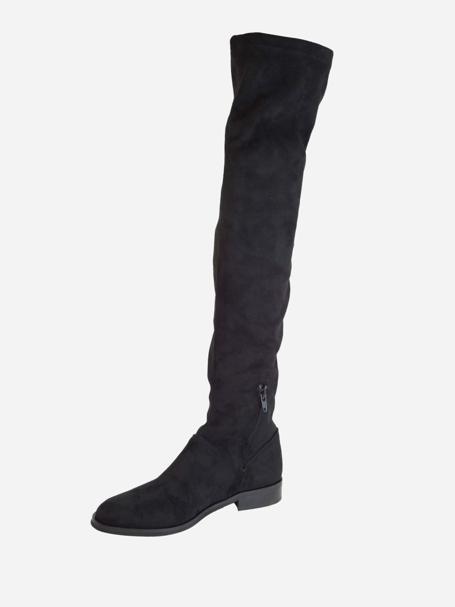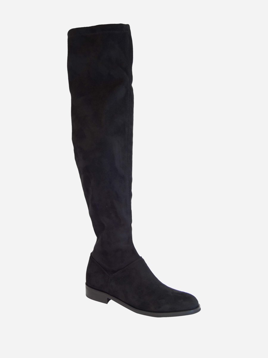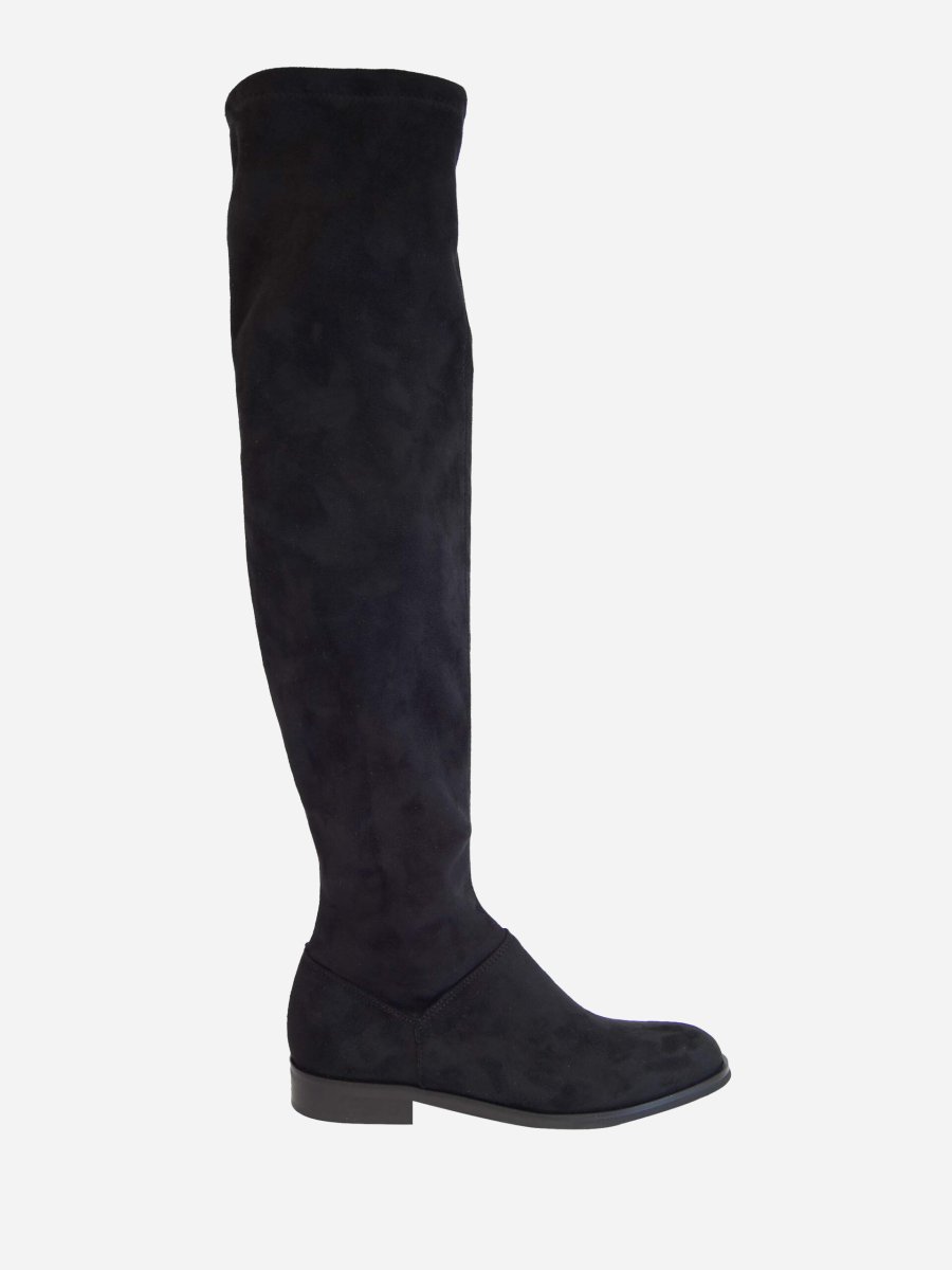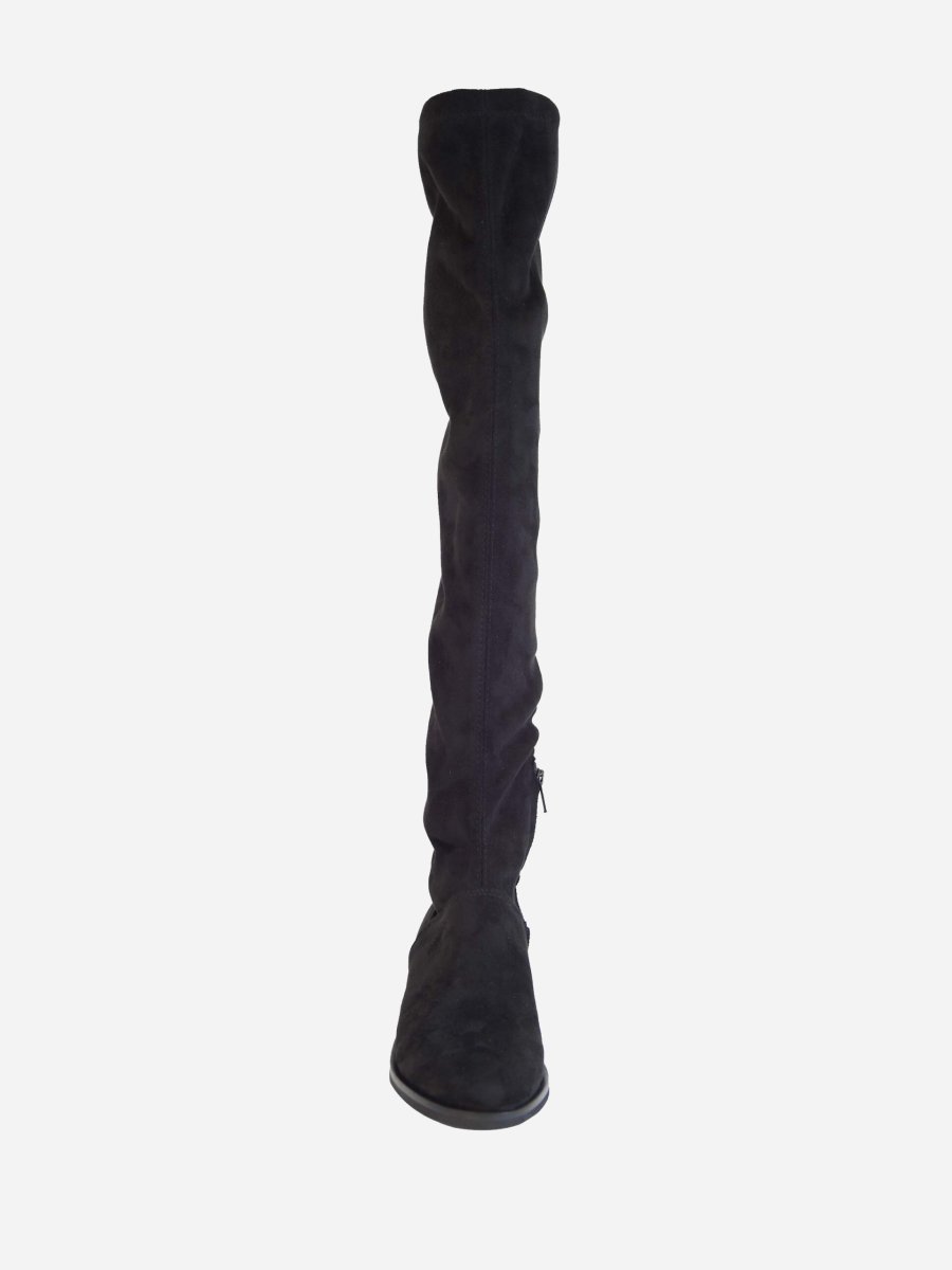 Stivale stretch sopra il ginocchio in camoscio e interno in tessuto. Zip interna, fondo in gomma e tacco 25mm. Made in Italy