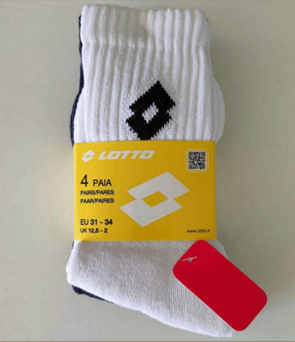 Calza da tennis bimbo Lotto, realizzati spugna di cotone elasticizzati, garantisce comfort e stabilitร . Ottimo per lโattivitร fisica. Composizione: 62% cotone, 36% poliestere, 2% elastan. Confezione da 12 pezzi. Disponibile nei colori Assortiti (Bianco, Blu, Grigio e Nero) nelle taglie 27/30 – 31/34 – 35/38.
