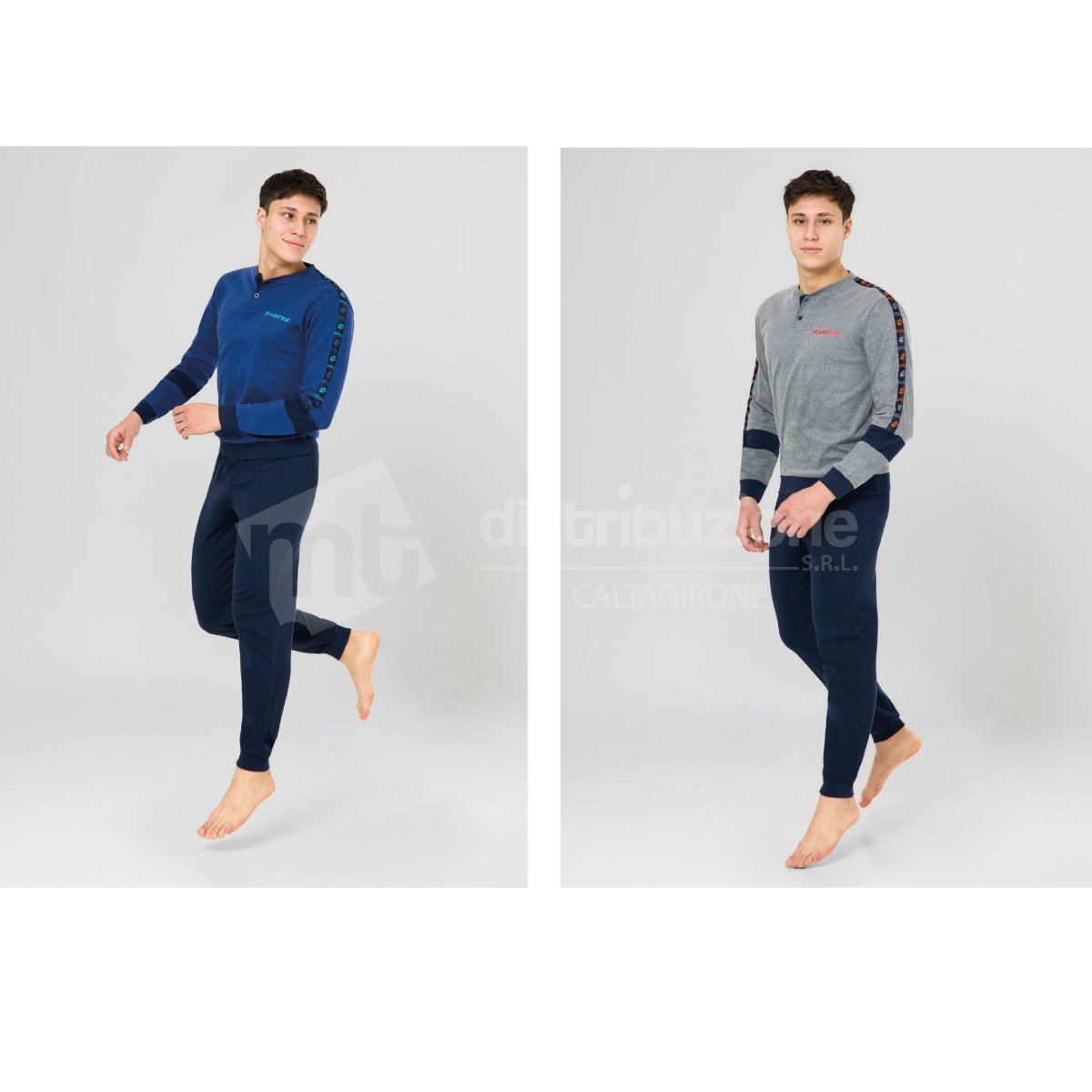 Pigiama ragazzo Lotto autunno/inverno, maglia manica lunga a serafino con bottoncini, pantalone lungo in tinta unita con polsini alle caviglie. Composizione: 100% caldo cotone. Confezione da 6 pezzi. Disponibile nei colori Assortiti (Jeans e Grigio) nelle taglie assortite 12 anni (2pz) โ 14 anni (2pz) โ 16 anni (2pz).