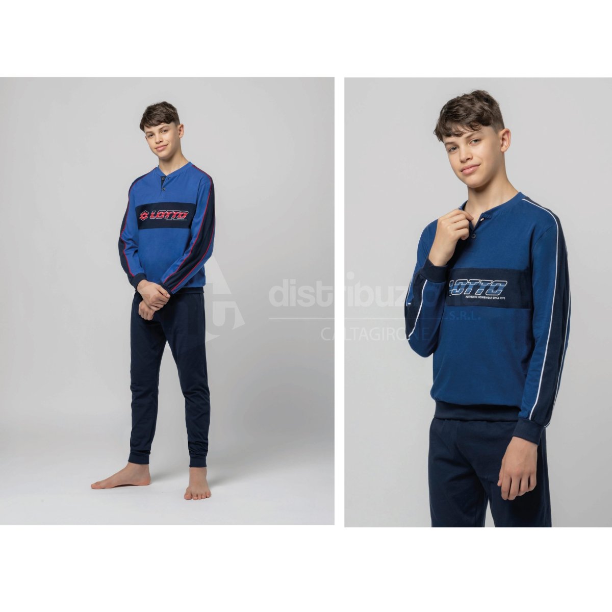 Pigiama ragazzo Lotto primavera/estate, maglia manica lunga a serafino con due bottoncini, pantalone in tinta unita con polsini. Confezione da 6 pezzi. Disponibile nel colore Assortito (Blu e Jeans) nelle taglie assortite 12 (2pz) โ 14 (2pz) โ 16 (2pz).
