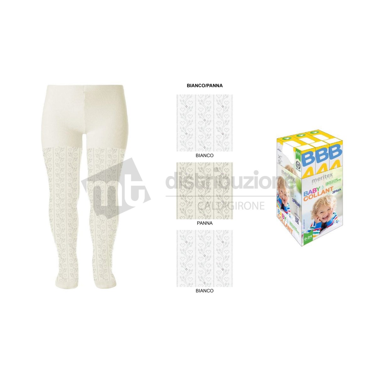 Collant neonata Meritex coprente in caldo cotone lavorato elasticizzato con fantasia. Composizione:ย 73% Cotone 25% Poliestere, 2% Elastan. Confezione da 3 pezzi. Disponibile nel colore Assortito (Bianco e Panna) nelle taglie 3/6 – 6/12 – 12/18ย mesi.