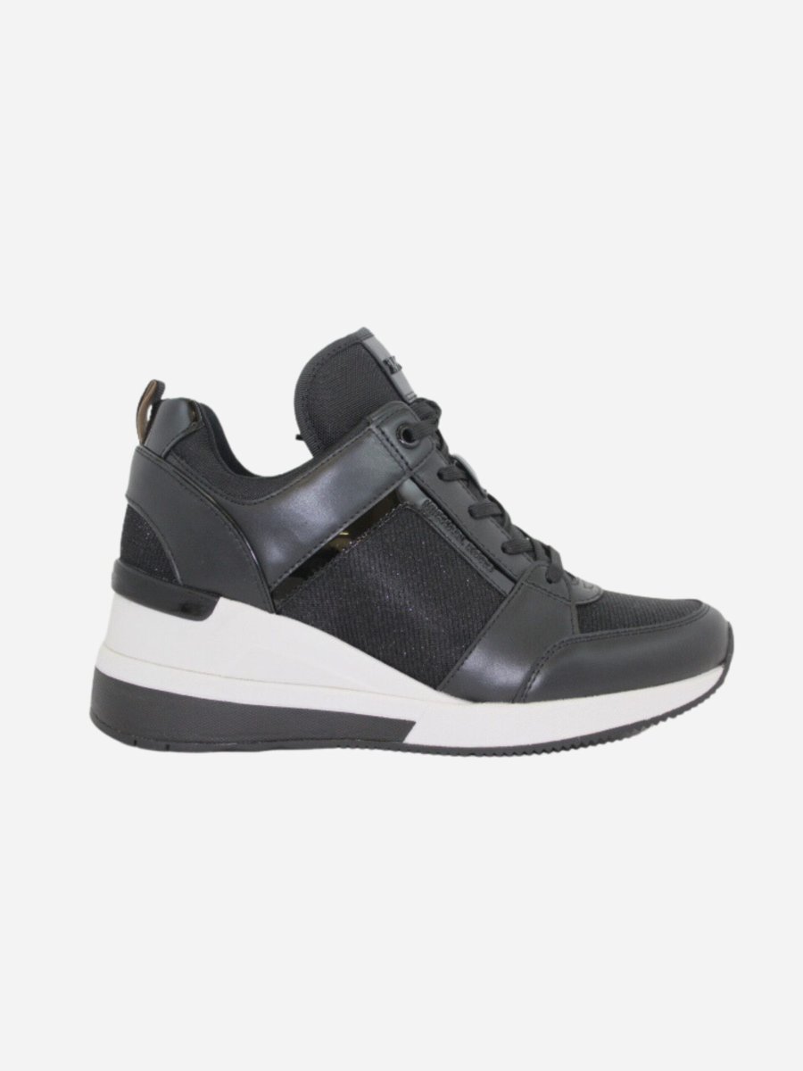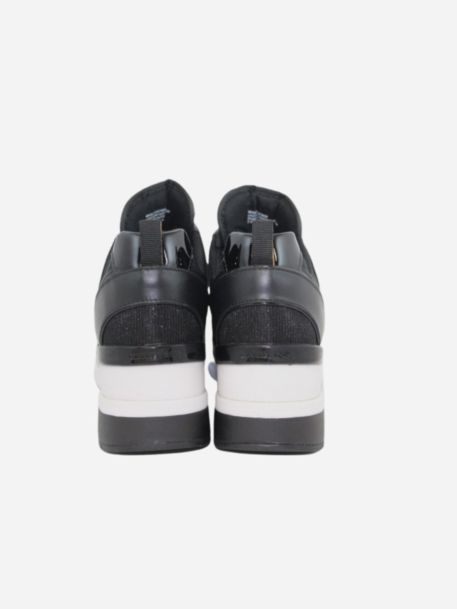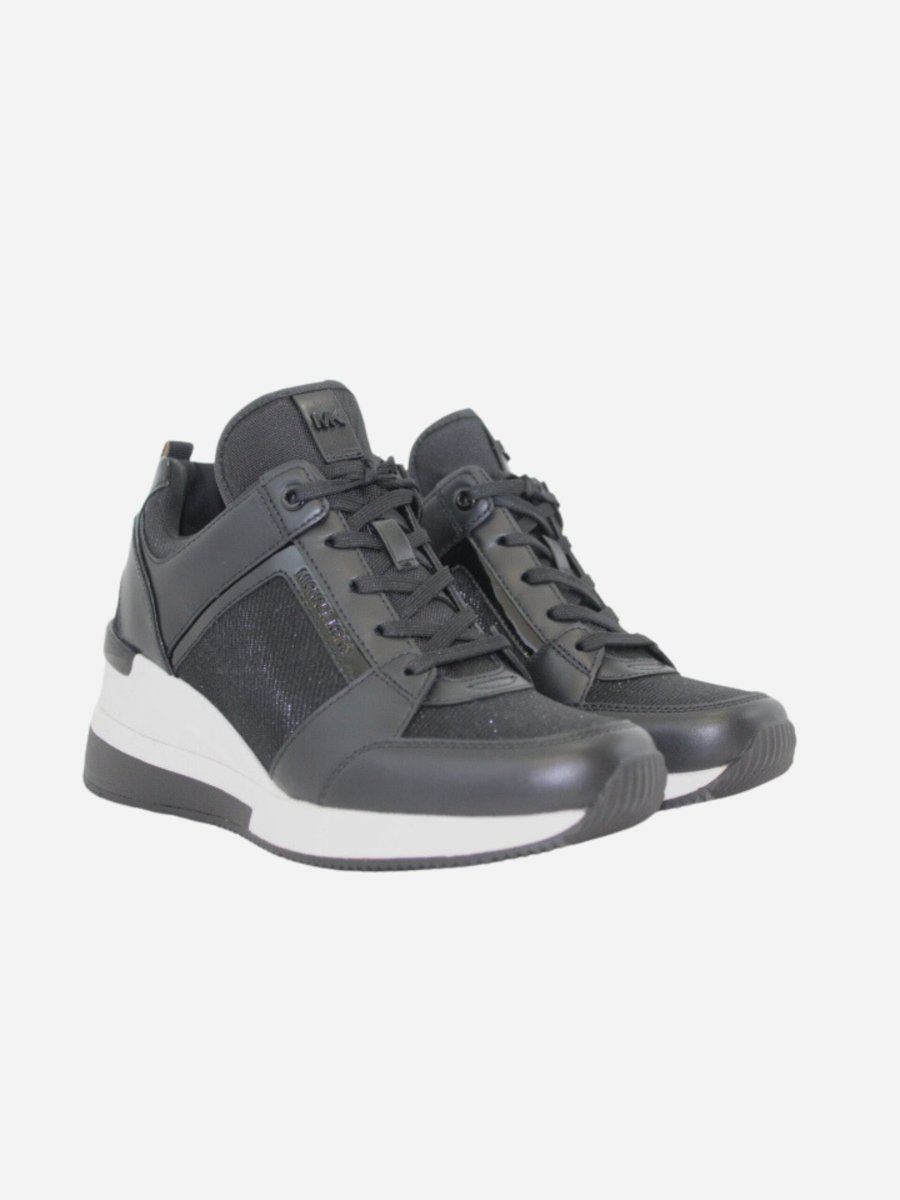 Sneakers con zeppa by Michael Kors. Scarpe realizzate in similpelle con inserti in tessuto nero glitterato. Fondo alto di 6 cm. Chiusura con lacci.
