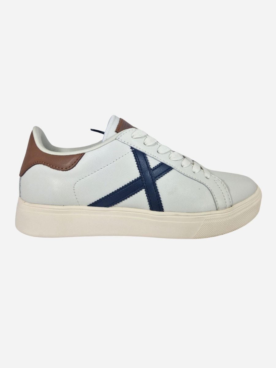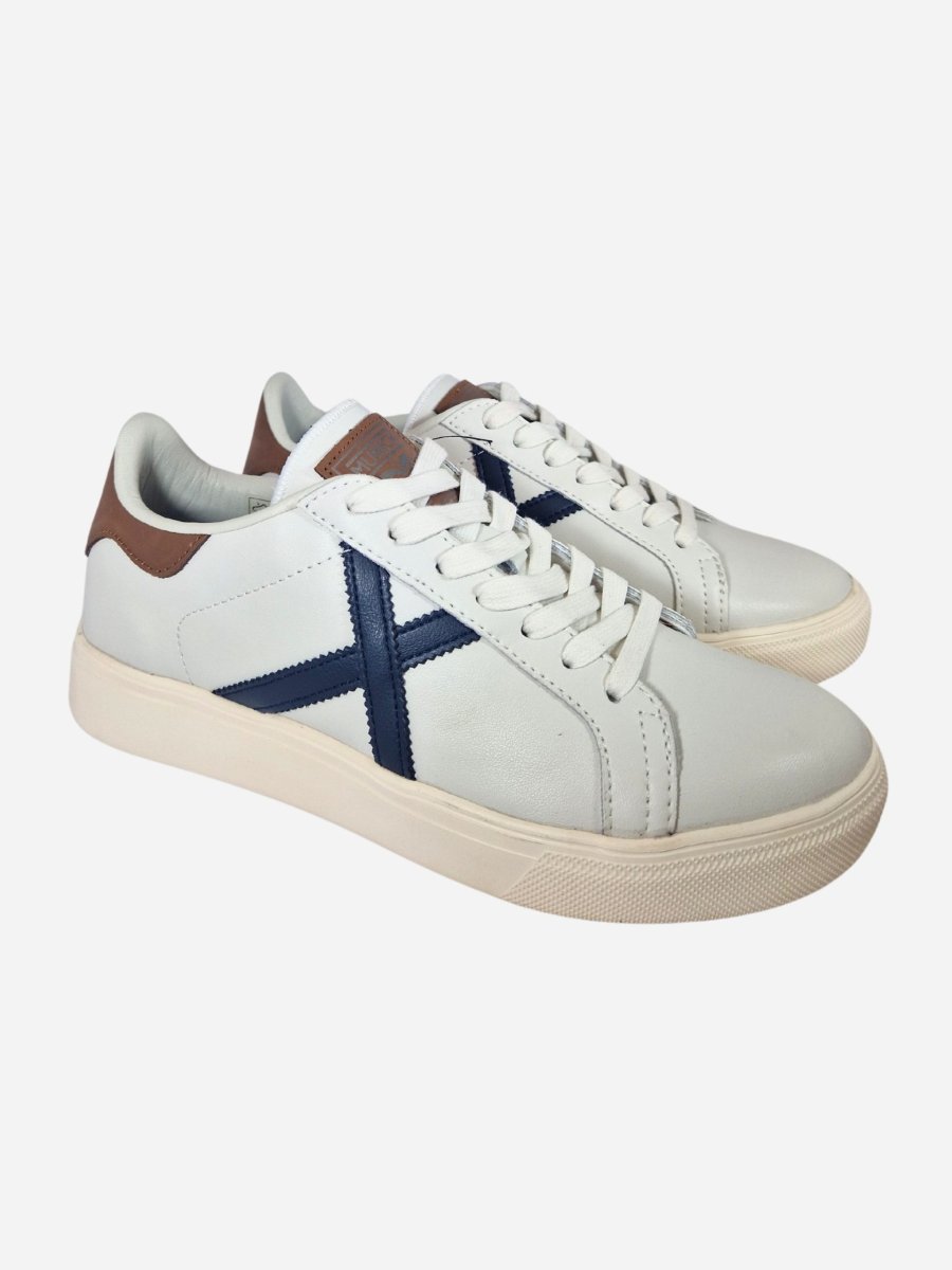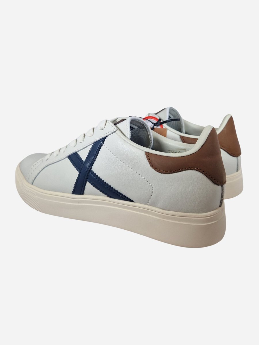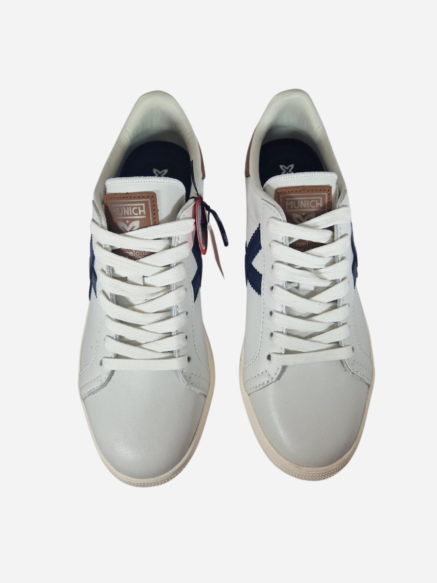Sneakers RETE 97 by Munich. Scarpe realizzate in vera pelle con inserti blu a contrasto. Toppone in pelle color cuoio a contrasto. Chiusura con lacci. Suola in gomma.