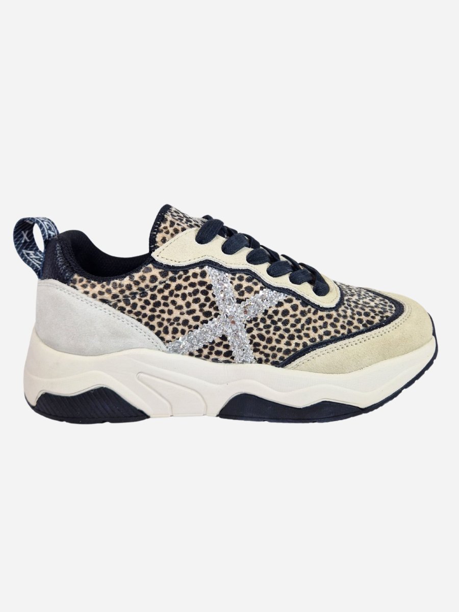 Sneakers WAVE 165 by Munich. Scarpe realizzate in cavallino maculato e camoscio. Logo X laterale in paillettes argento. Toppone in pelle nera. Chiusura con lacci. Suola in gomma.