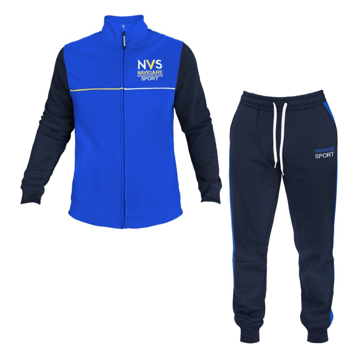 Tuta uomo Navigare, felpa full zip, polsini con elastico. Maglia tinta unita con logo frontale. Pantalone con vita elasticizzata e stampa logo laterale. Composizione: 60% cotone, 40% poliestere. Confezione da 1 pezzo. Disponibile nei colori Blu e Nero nelle taglie M – L – XL – XXL.