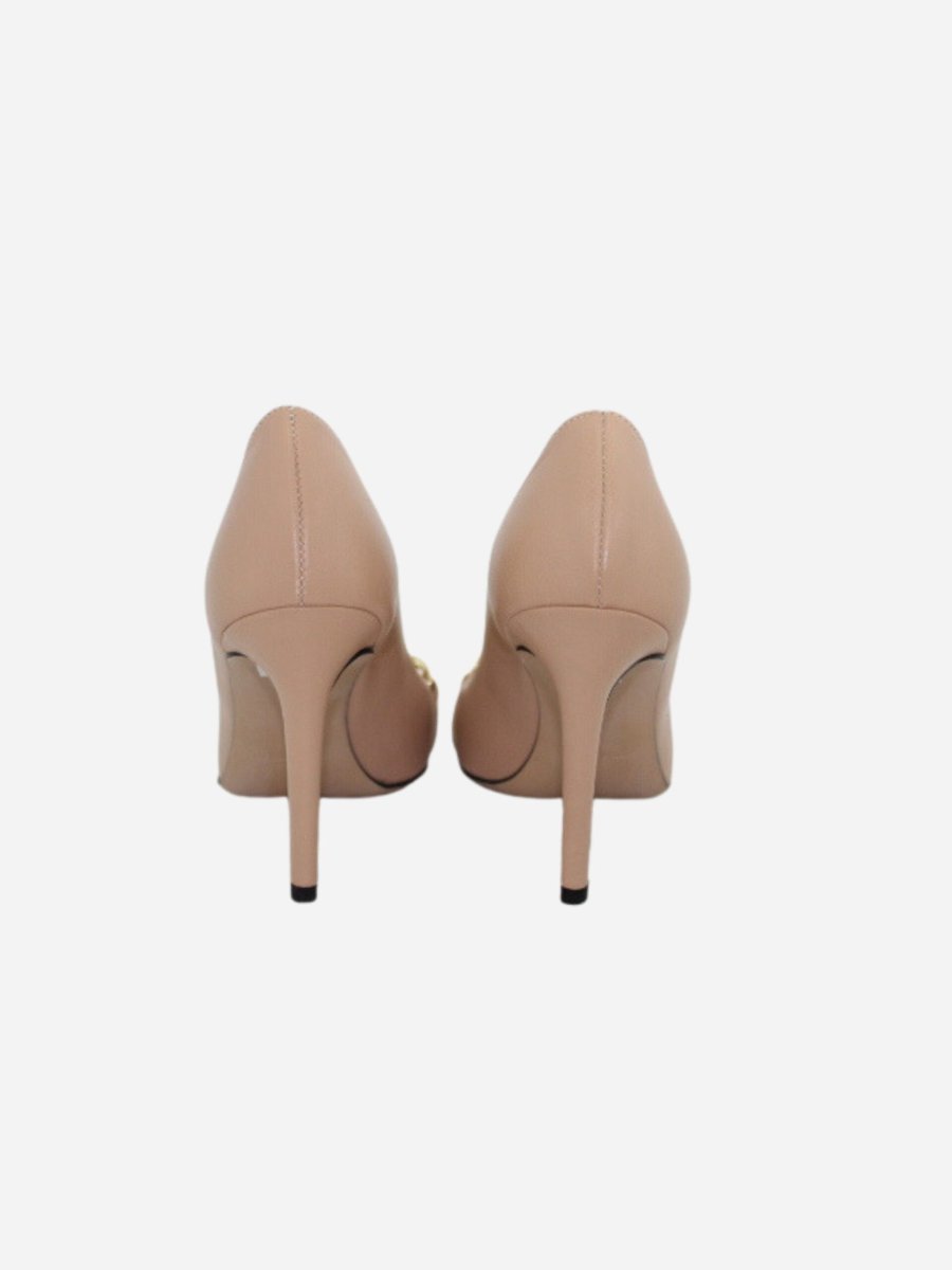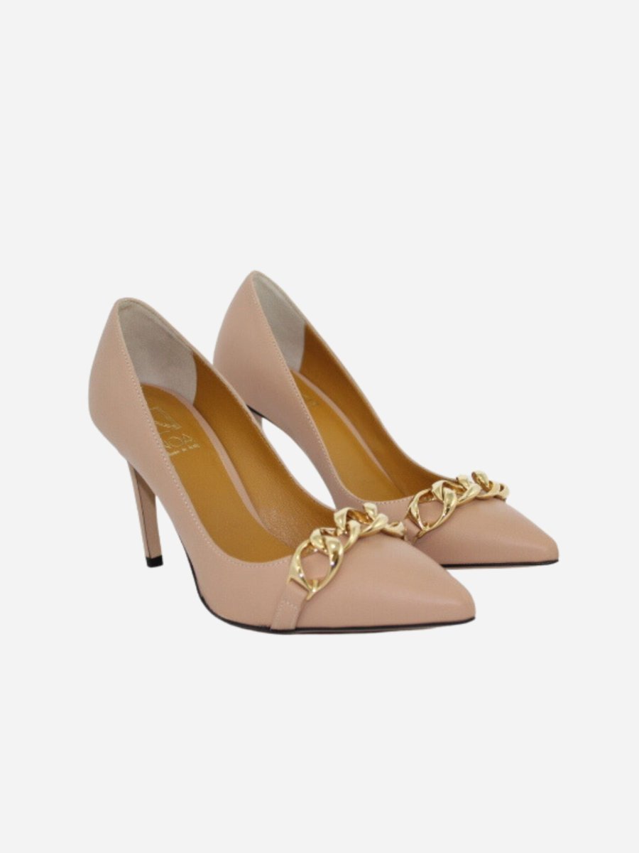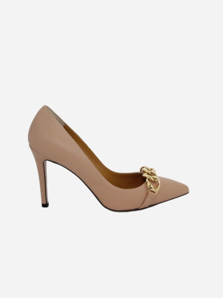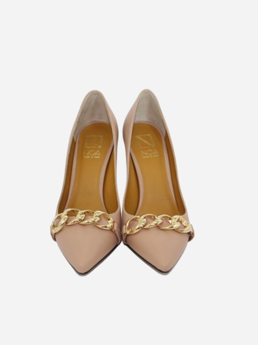 Décolleté nude by Noa. Scarpe realizzate in nappa con fondo in cuoio e suola in materiale sintetico. Dettaglio accessorio sulla punta con catena dorata. Tacco a spillo di 9 cm. Le calzature firmate Noa sono interamente Made in Italy, caratterizzate da linee semplici, eleganti e femminili. Adatte a ogni look, donano un tocco chic alla quotidianità.