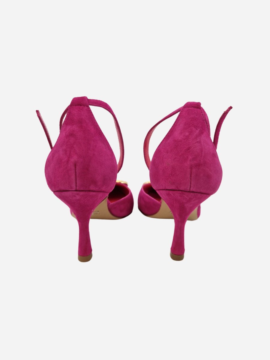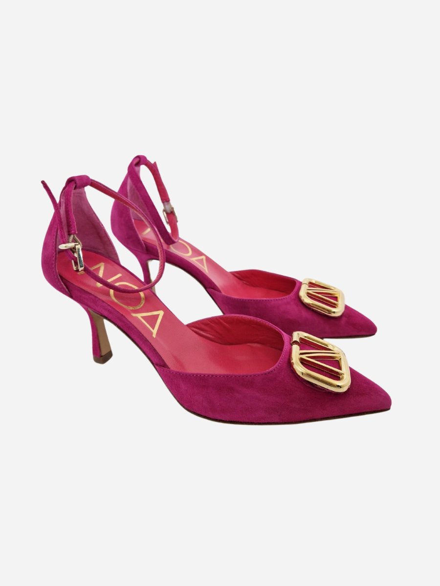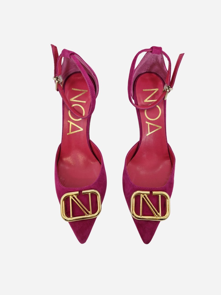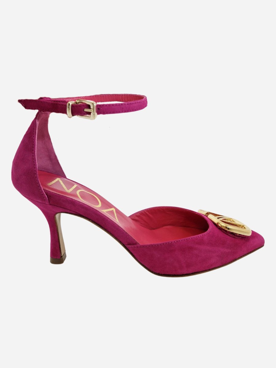 Scarpa con cinturino by Noa. Scarpe realizzate in camoscio con fondo in cuoio. Accessorio dorato con logo sulla punta. Chiusura con cinturino alla caviglia. Disponibile in due varianti: nero, fuxia.