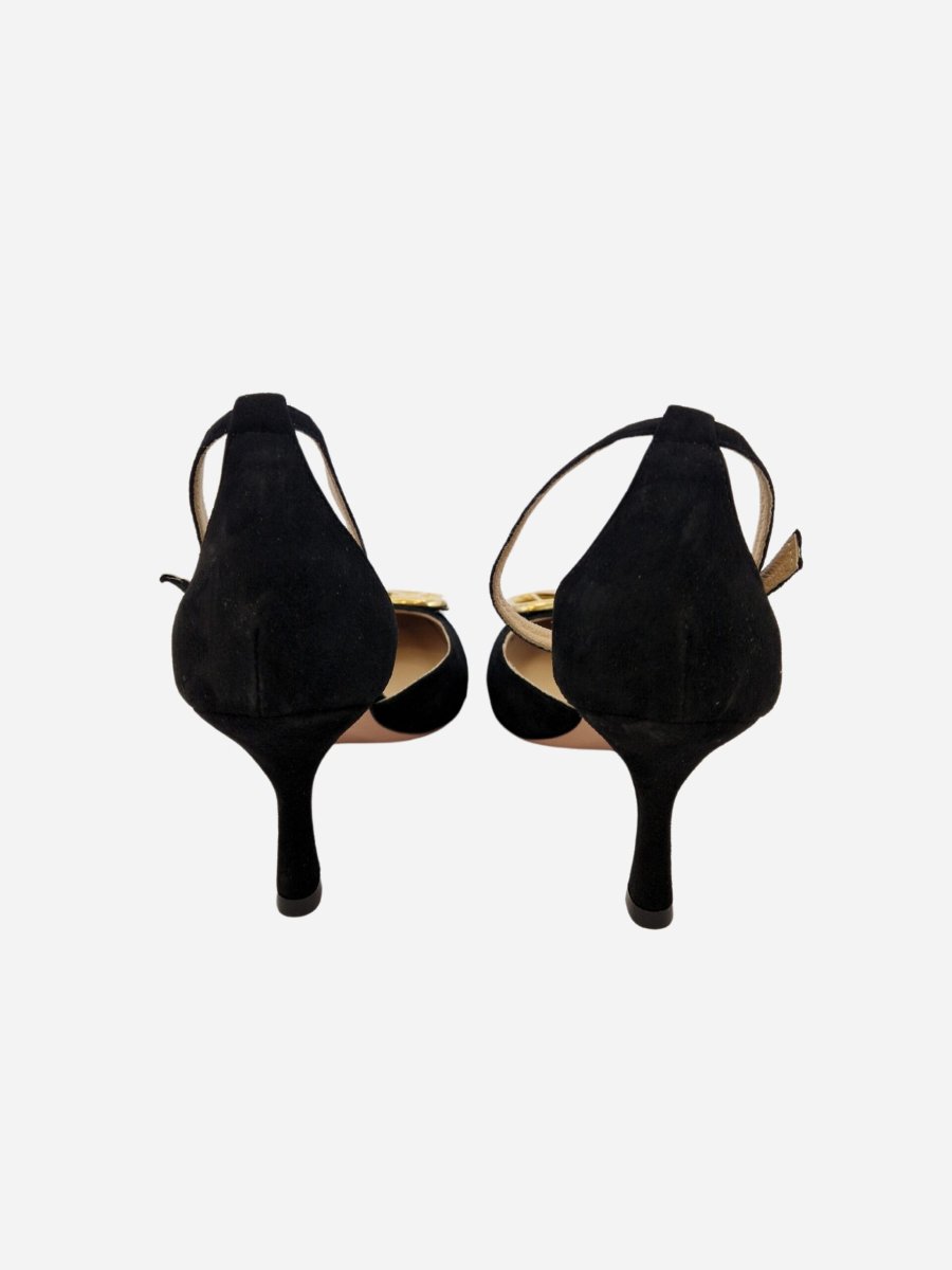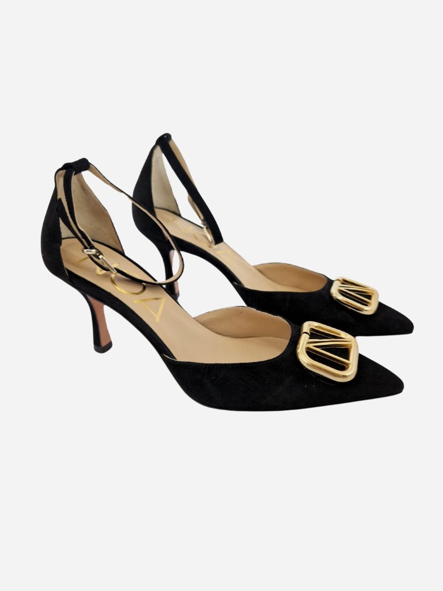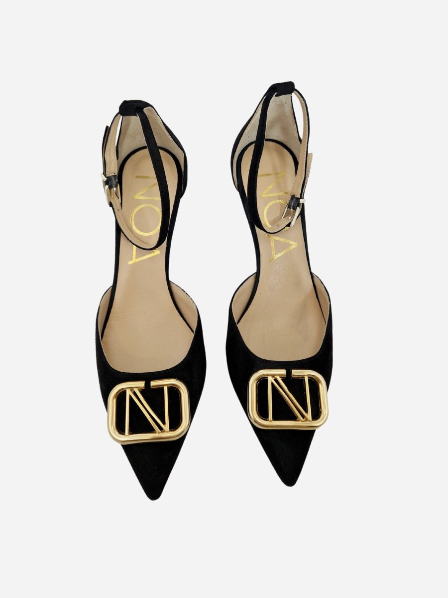 Scarpa con cinturino by Noa. Scarpe realizzate in camoscio con fondo in cuoio. Accessorio dorato con logo sulla punta. Chiusura con cinturino alla caviglia. Disponibile in due varianti: nero, fuxia.