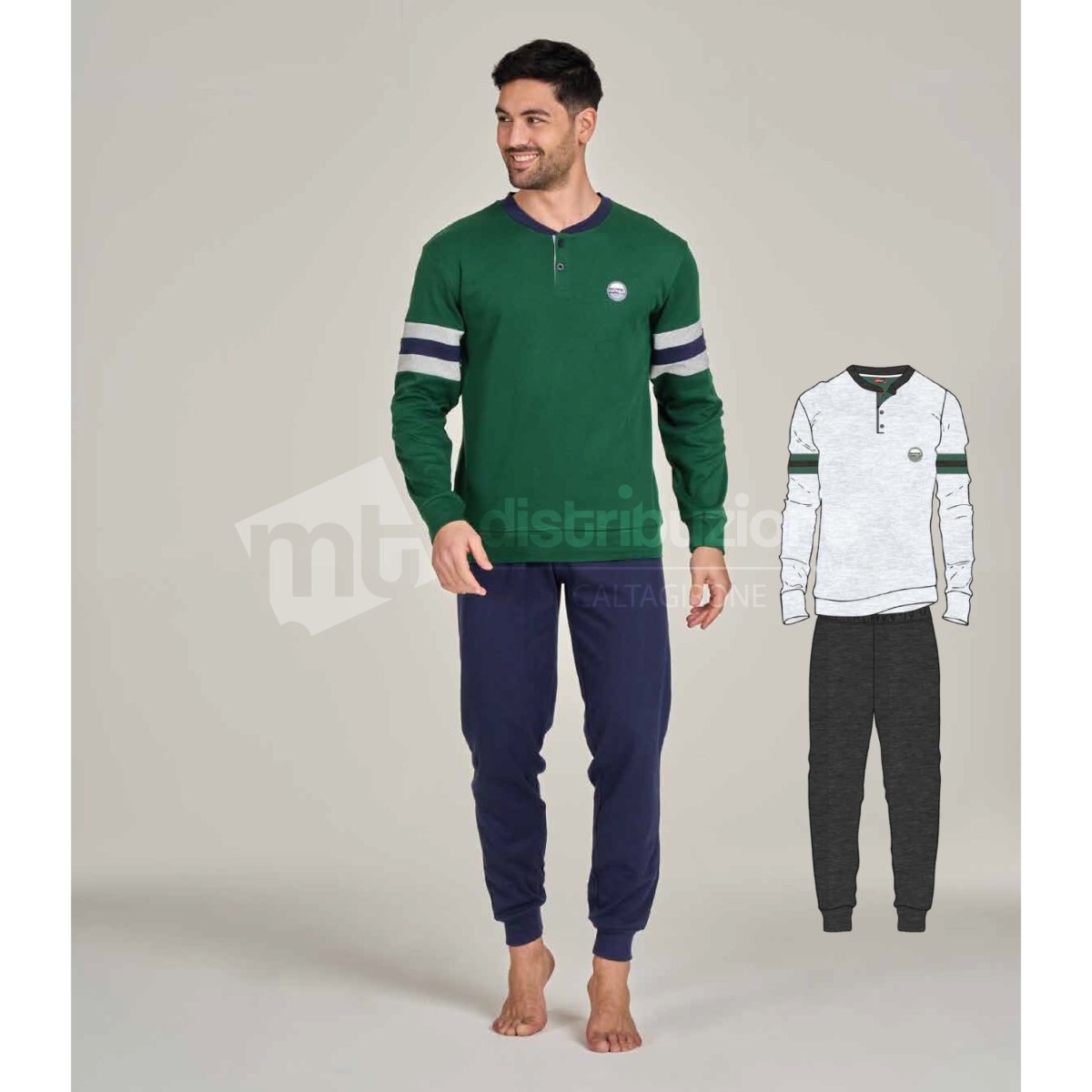 Pigiama uomo Notte&dì autunno/inverno, maglia serafino con maniche lunghe e con bottoni, pantaloni lunghi in tinta unita con polsini. Composizione: 100% caldo cotone interlock. Confezione da 8 pezzi. Disponibile nei colori Assortiti (Blu e Verde) nelle taglie assortite M(2pz) – L(2pz) – XL(2pz) – XXL(2pz).