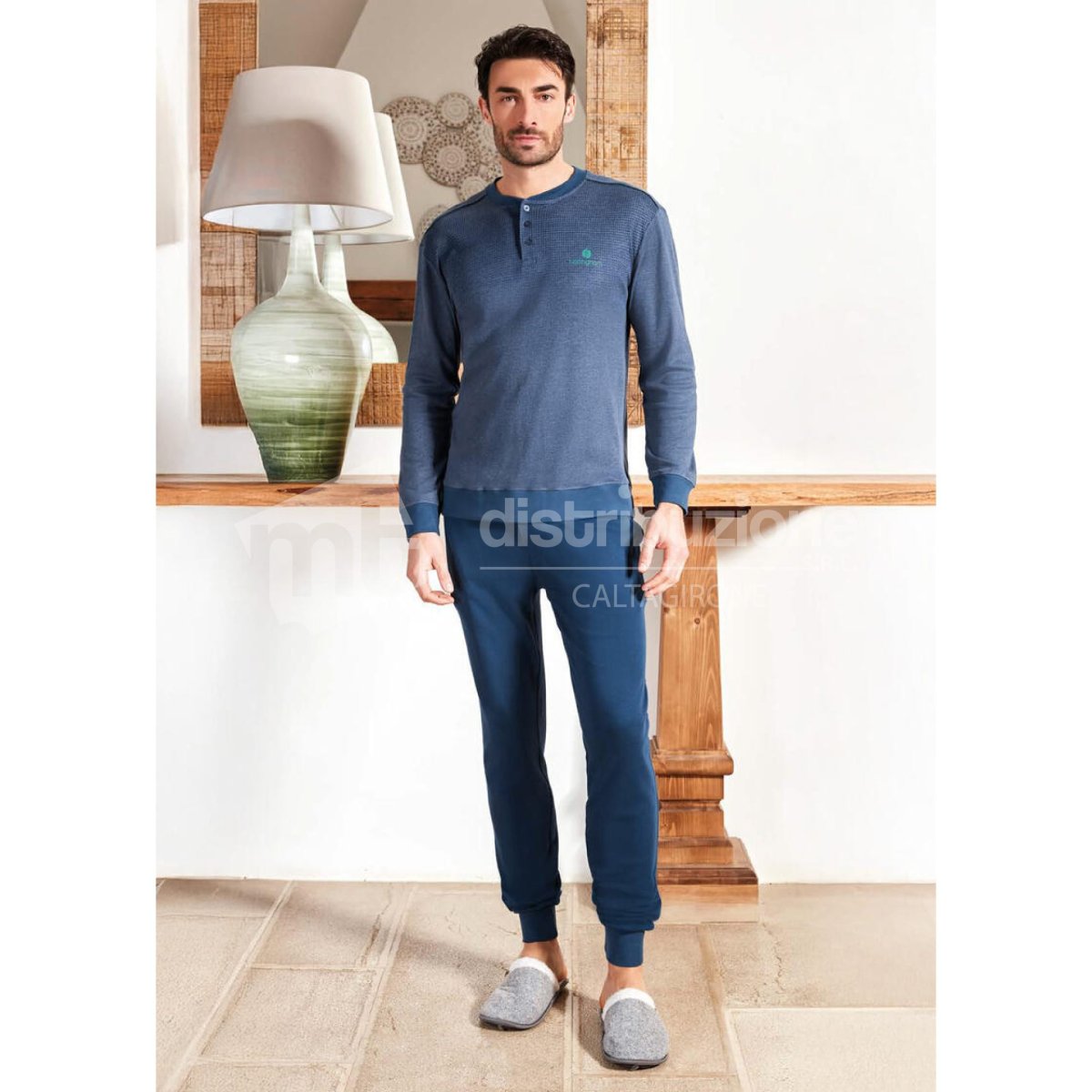 Pigiama uomo Nottingham autunno/inverno, maglia manica lunga a serafino con bottoncini, pantalone lungo in tinta unita il tutto con polsini. Composizione: 100% cotone interlock. Confezione da 8 pezzi. Disponibile nel colore Assortito (Jeans e Ottanio) nelle taglie assortite 3 (2pz) โ 4 (2pz) โ 5 (2pz) – 6 (2pz).