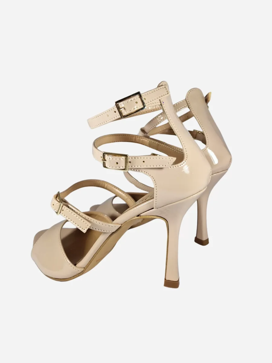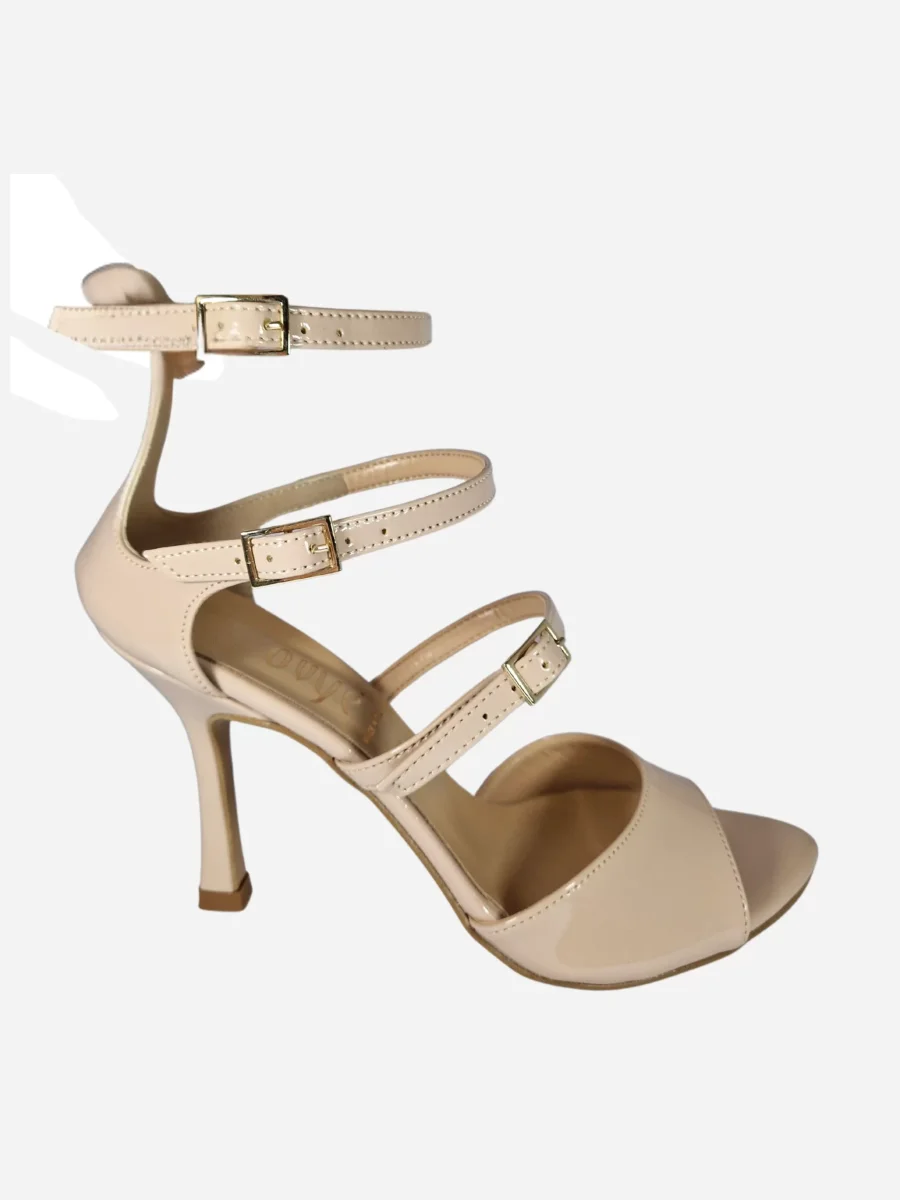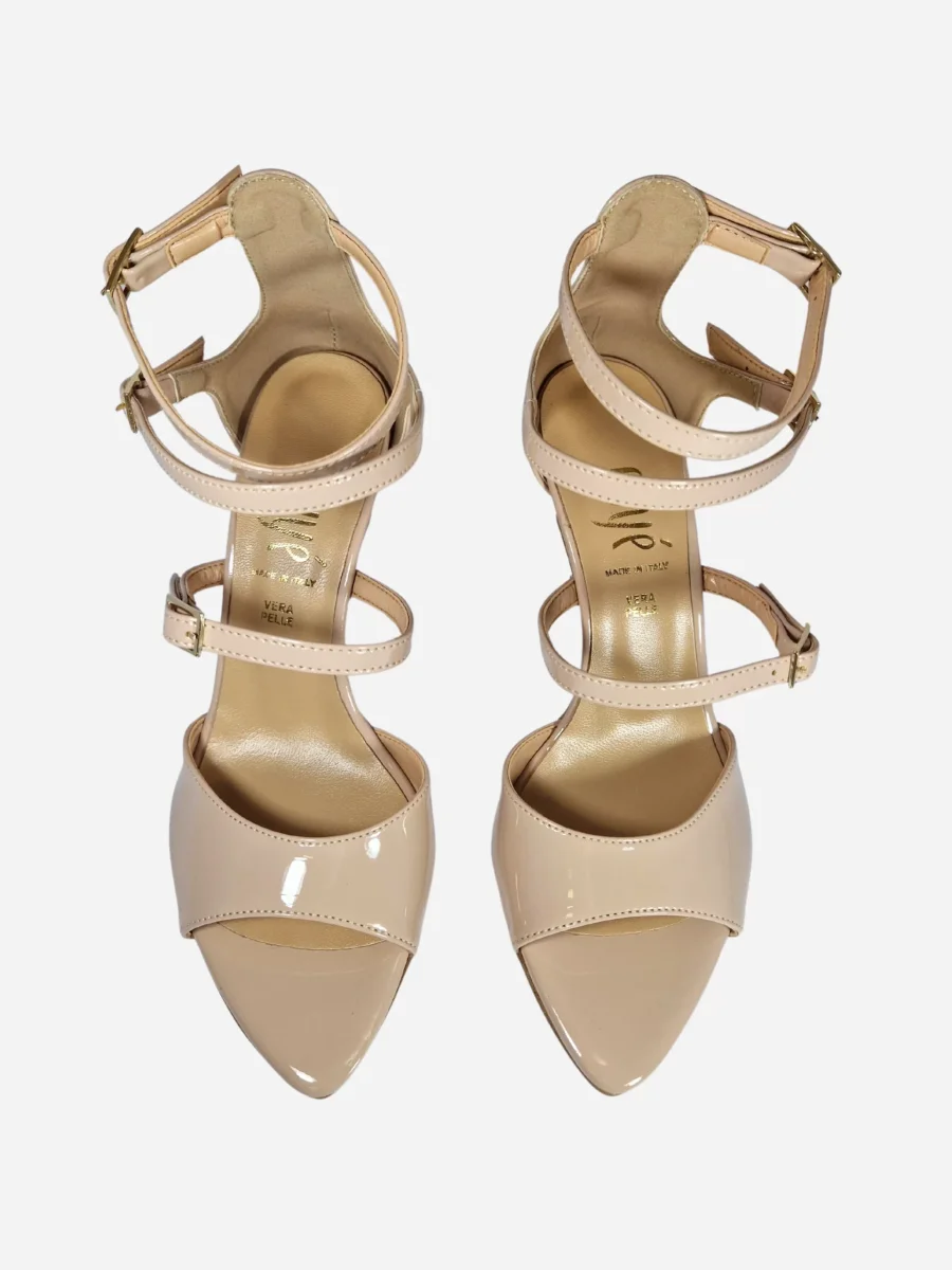 Sandali by Ovyé. Calzature realizzate in vera similpelle verniciata con fondo in cuoio e suola in materiale sintetico. Chiusura con tre cinturini. Tacco di 10 cm.