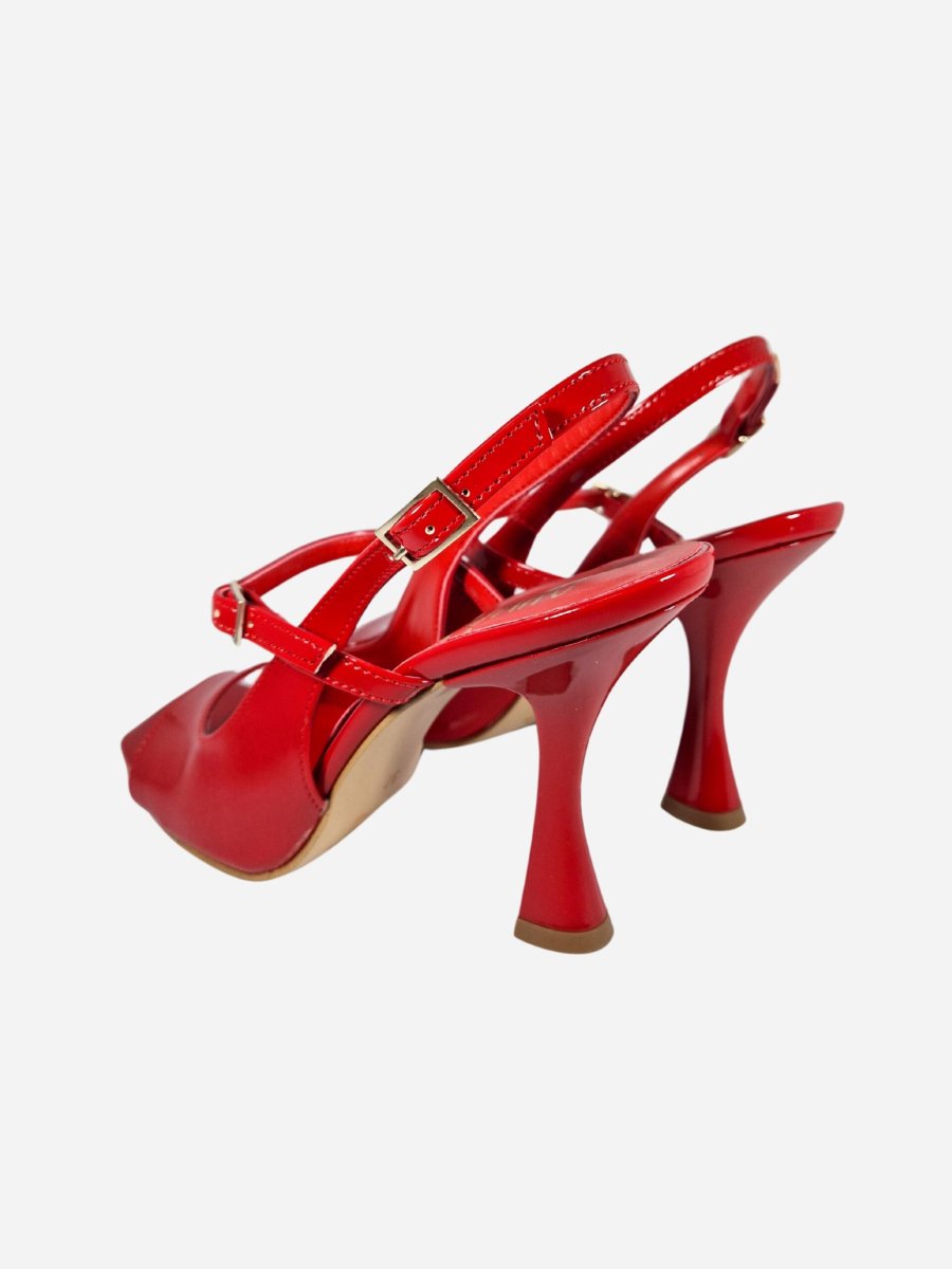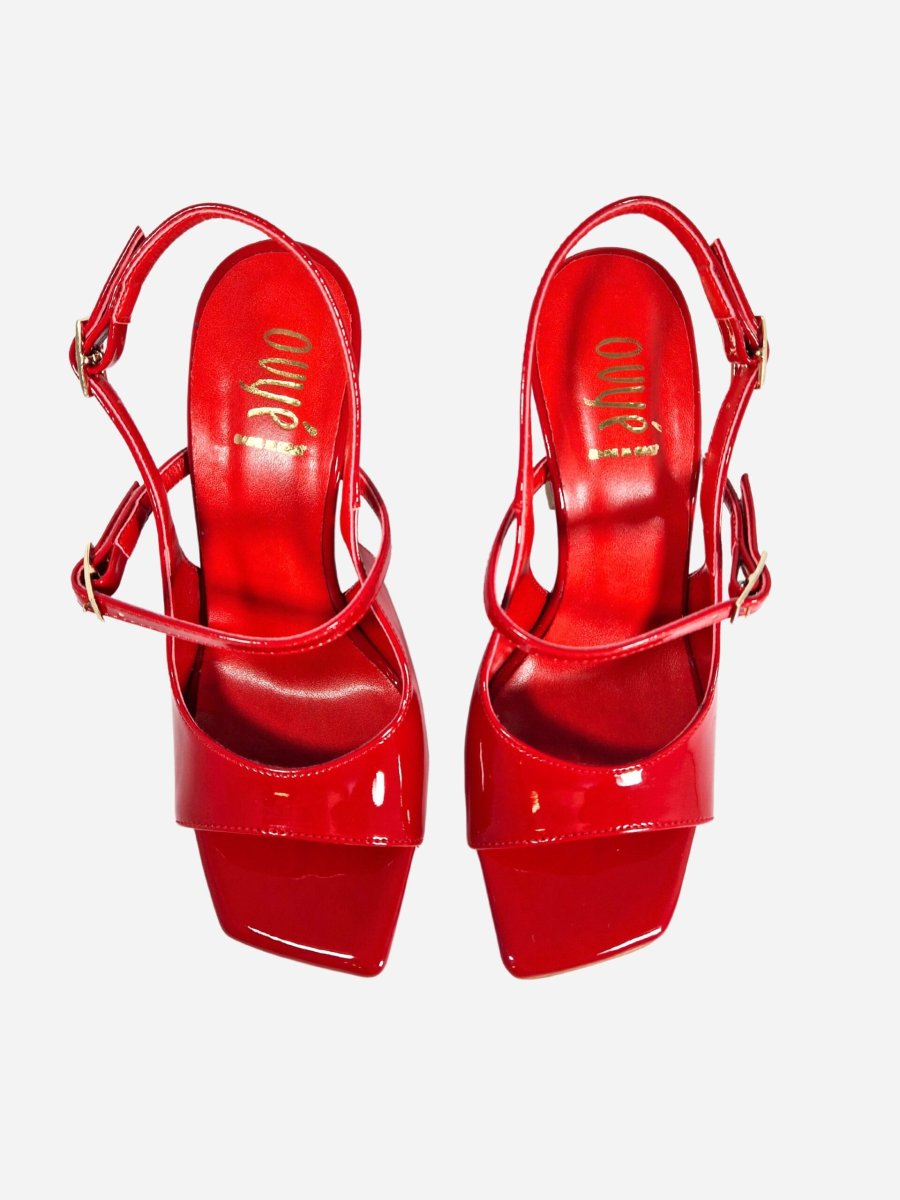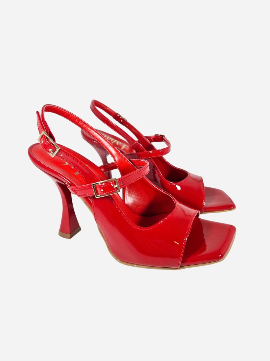 Sandali by Ovyé. Calzature realizzate in vera similpelle verniciata con fondo in cuoio e suola in materiale sintetico. Chiusura con doppio cinturino, al tallone e che abbraccia il piede. Tacco di 10 cm.