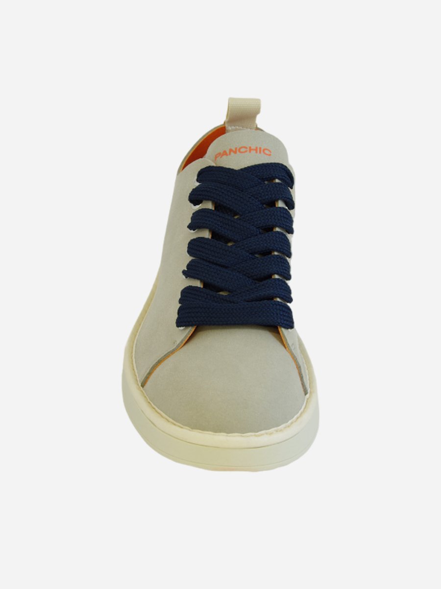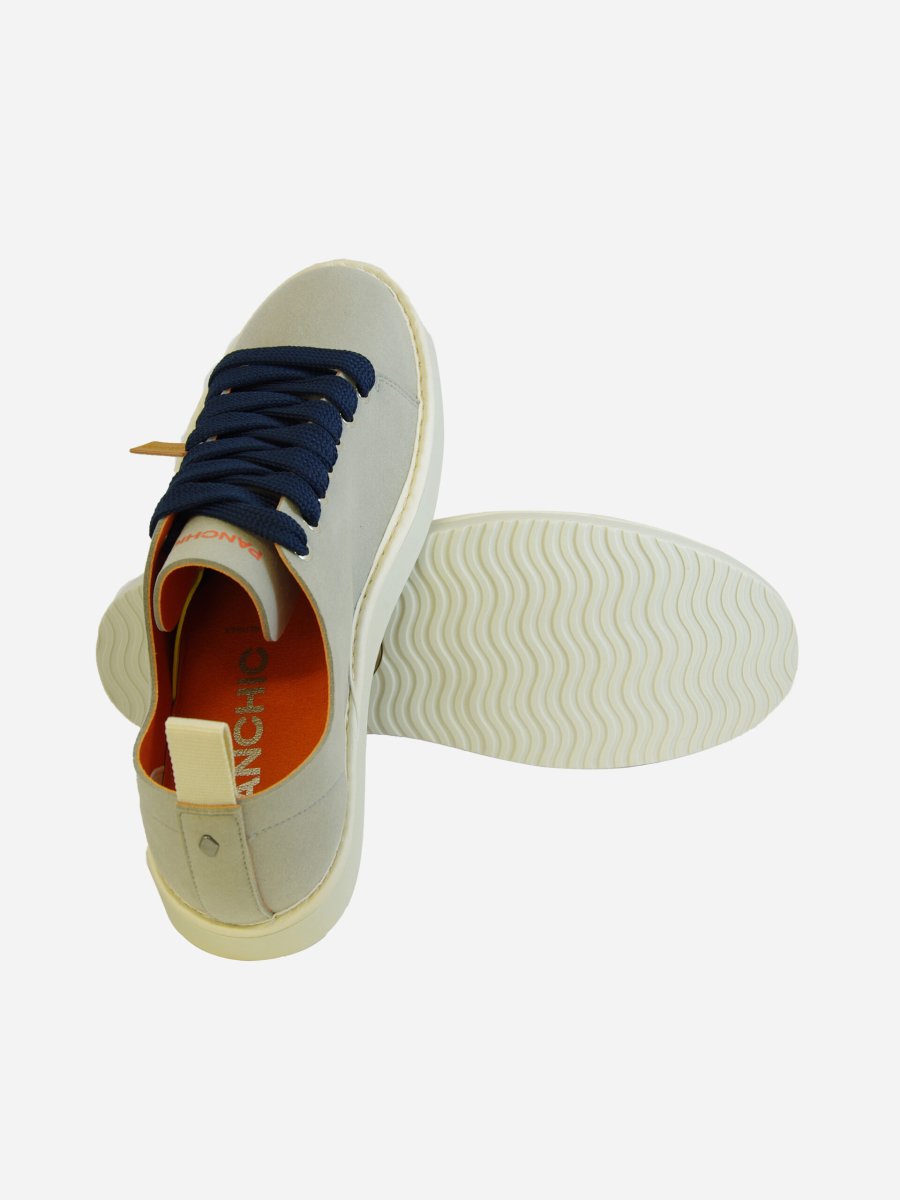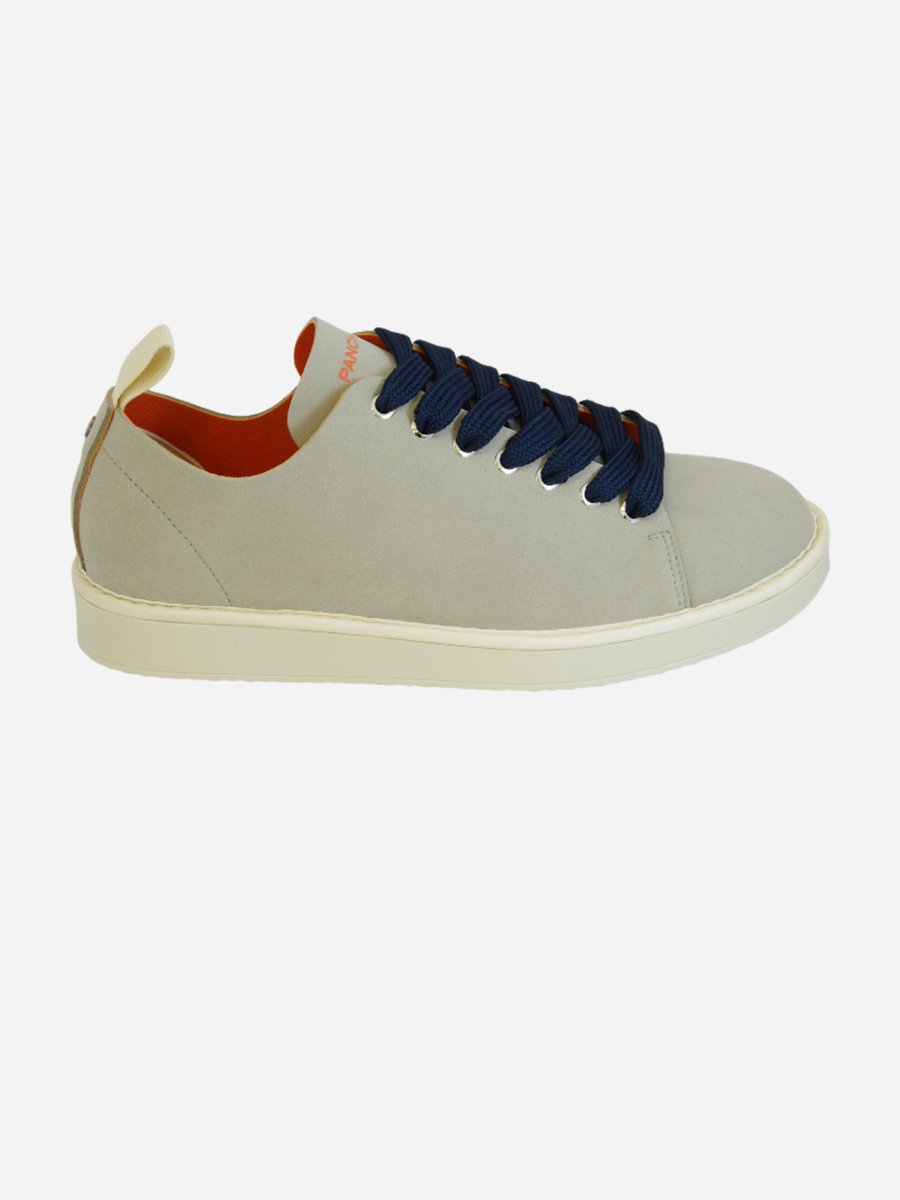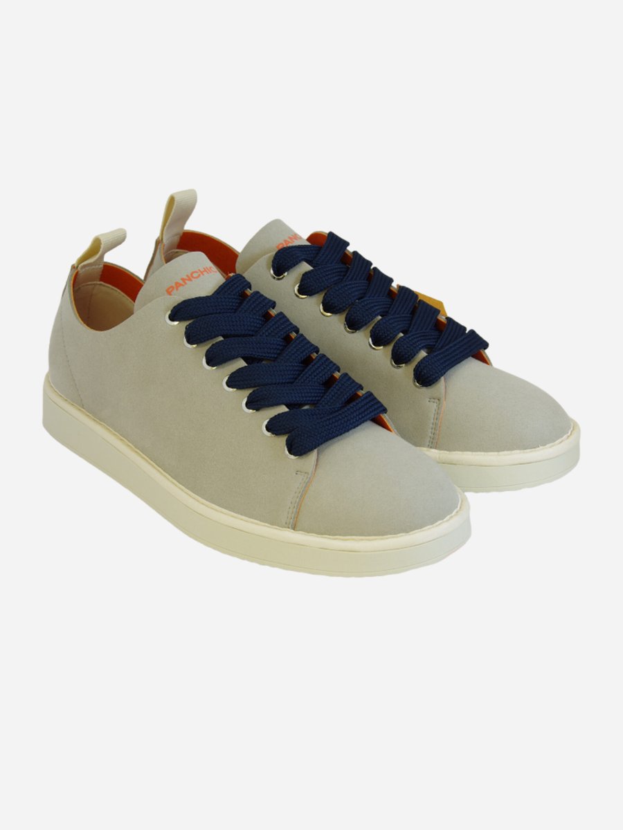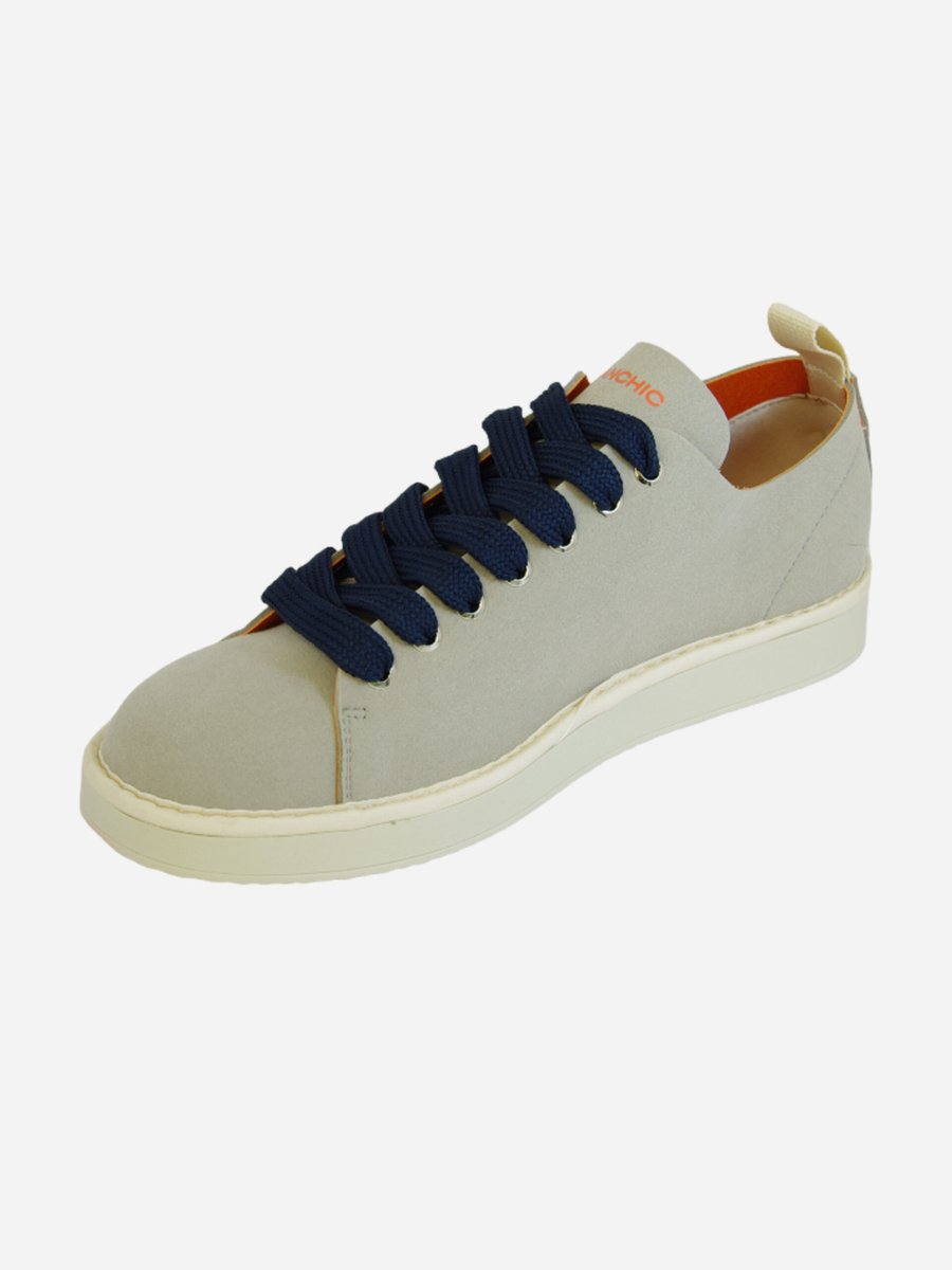 Scarpe allacciate uomo P01 con tomaia in microfibra effetto suede grigio e lacci a trama larga cobalto. Comodi elastici interni giallo fluo per agevolare i movimenti e fissare la linguetta; laccio di ricambio abbinato alla suola.