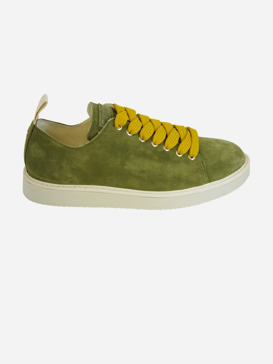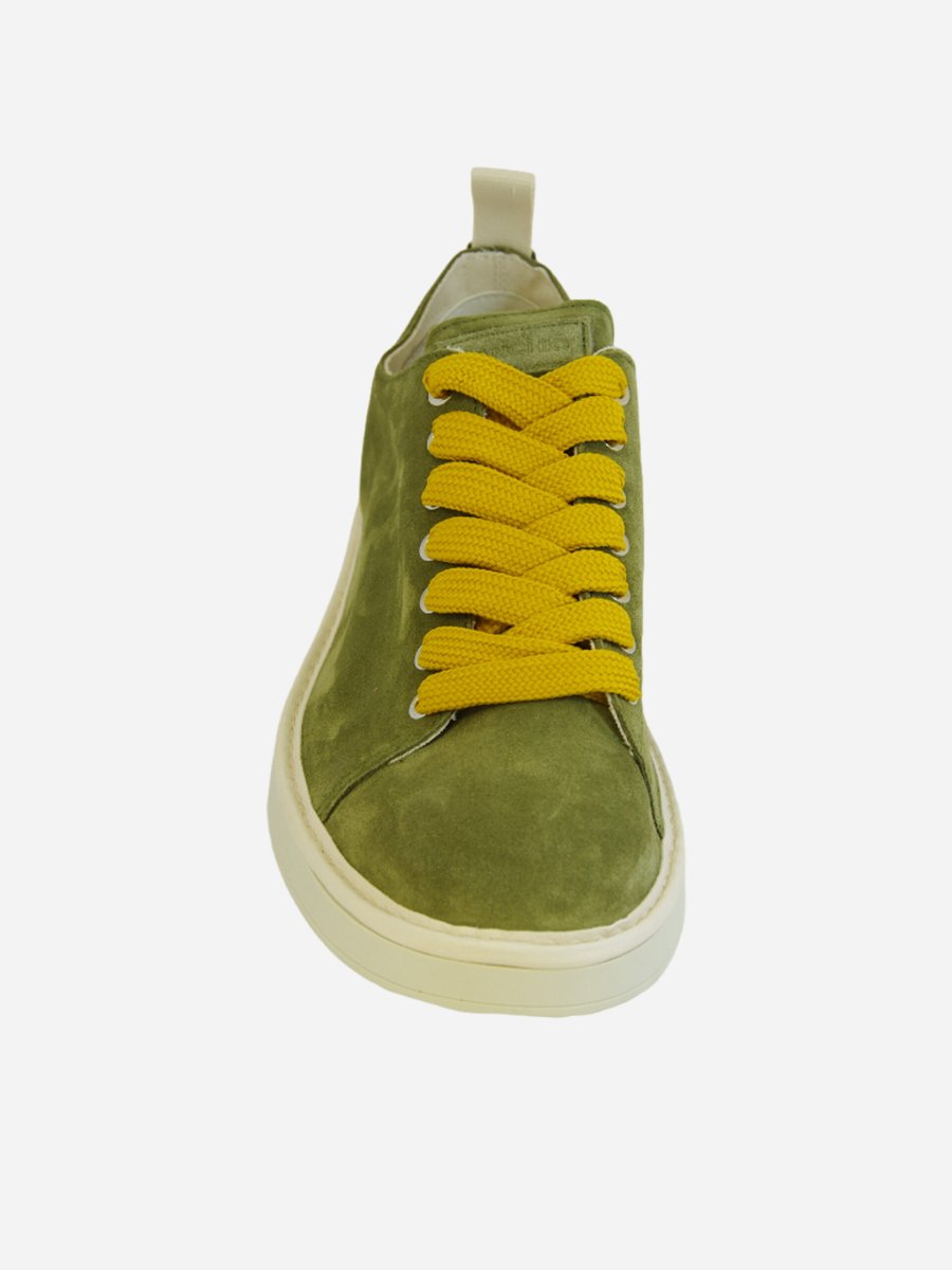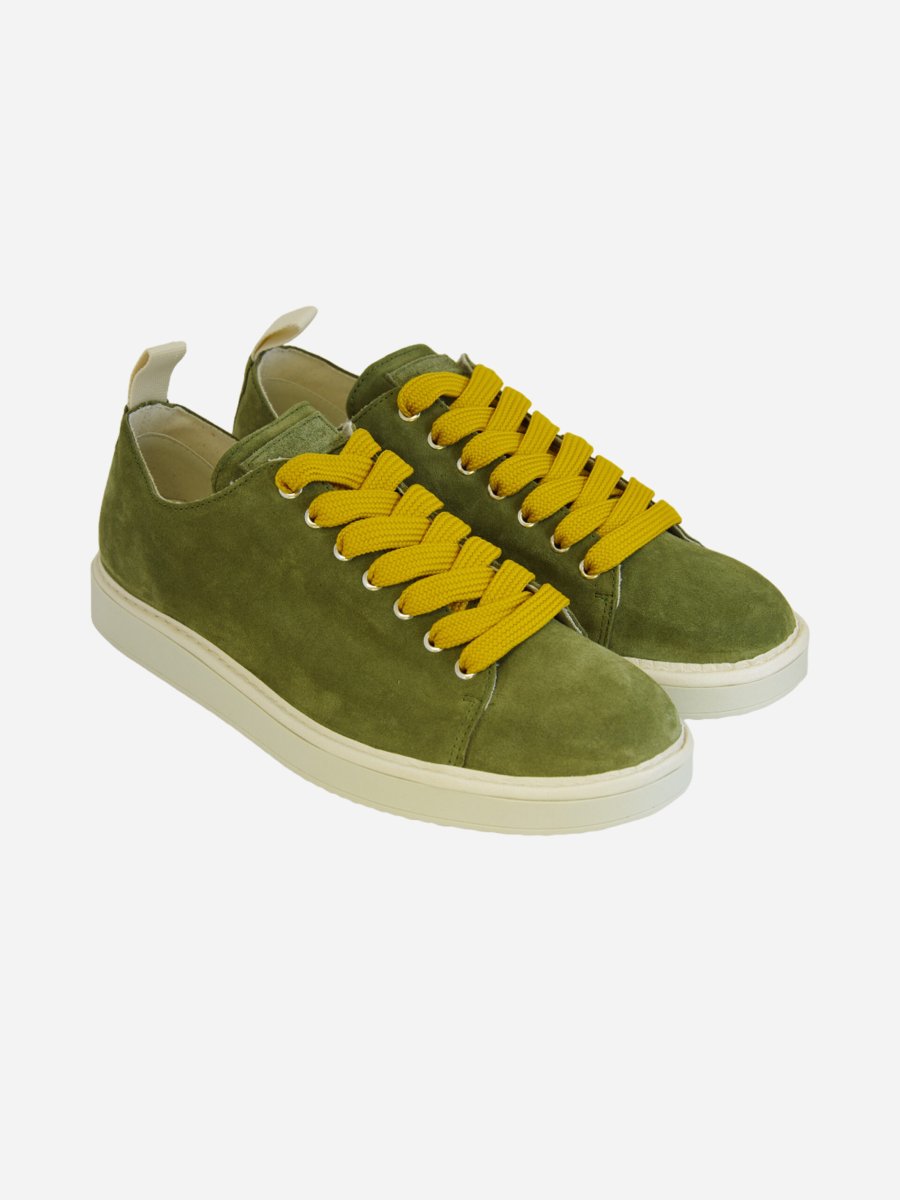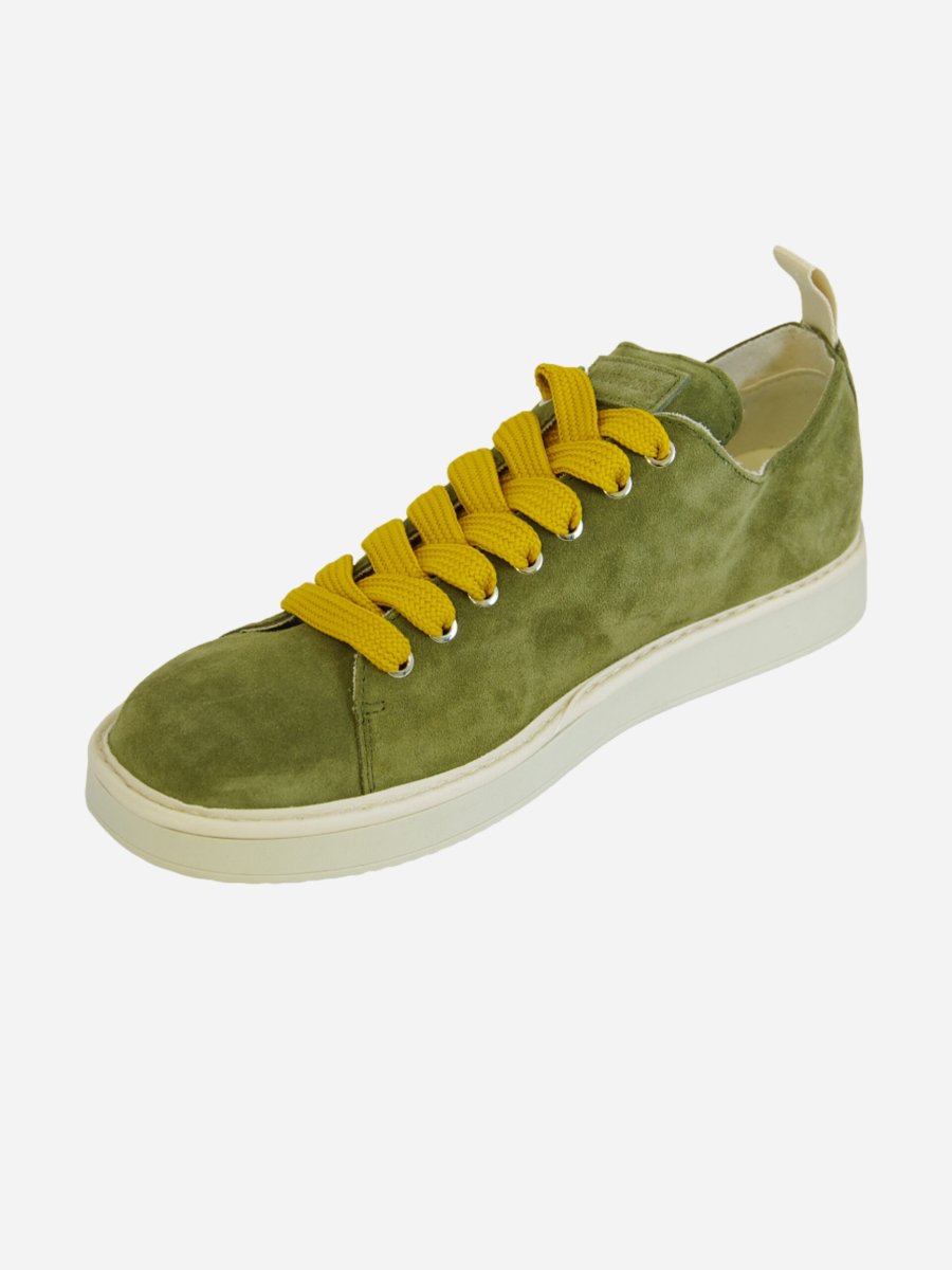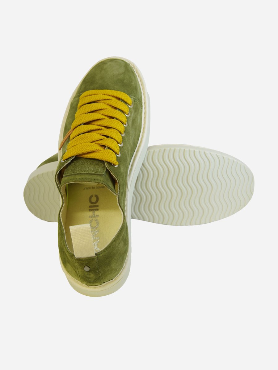 Scarpe allacciate uomo P01 con tomaia in suede salvia e lacci a trama larga giallo. Comodi elastici interni giallo fluo per agevolare i movimenti e fissare la linguetta; laccio di ricambio abbinato alla suola.