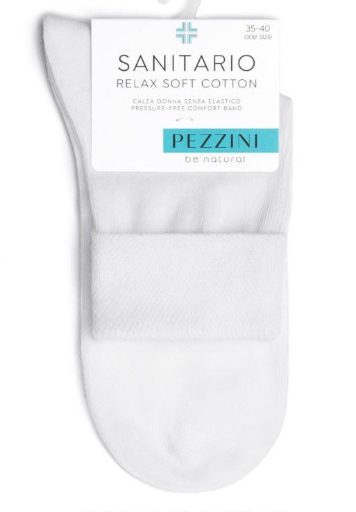 Calza sanitaria corta donna Pezzini in morbido cotone senza elastico, bordo comfort con risvolto, cucitura piatta. Composizione: 80% Cotone 17% Poliammide 3% Elastan. Confezione da 12 pezzi. Disponibile nei colori Bianco e Nero nella taglia unica (35/40).