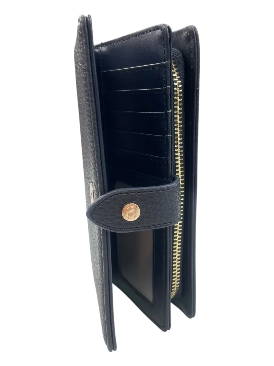 PORTAFOGLIO LUNGO DOPPIO SCOMPARTO DA UN LATO: APERTURA CON BOTTONCINO 12 PORTA CARTE DI CUI UNO TRASPARENTE 1 COMPARTO PER BANCONOTE DALL’ALTRO LATO: 2 SCOMPARTI PER BANCONOTE O MONETE CHIUSO CON ZIP MATERIALE: ECOPELLE DIMENSIONI: 19X10X3 CM