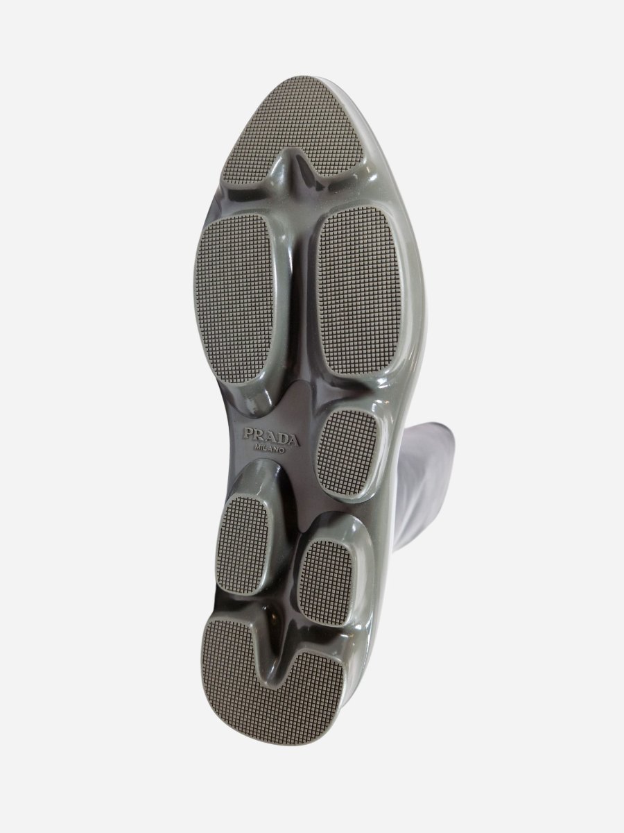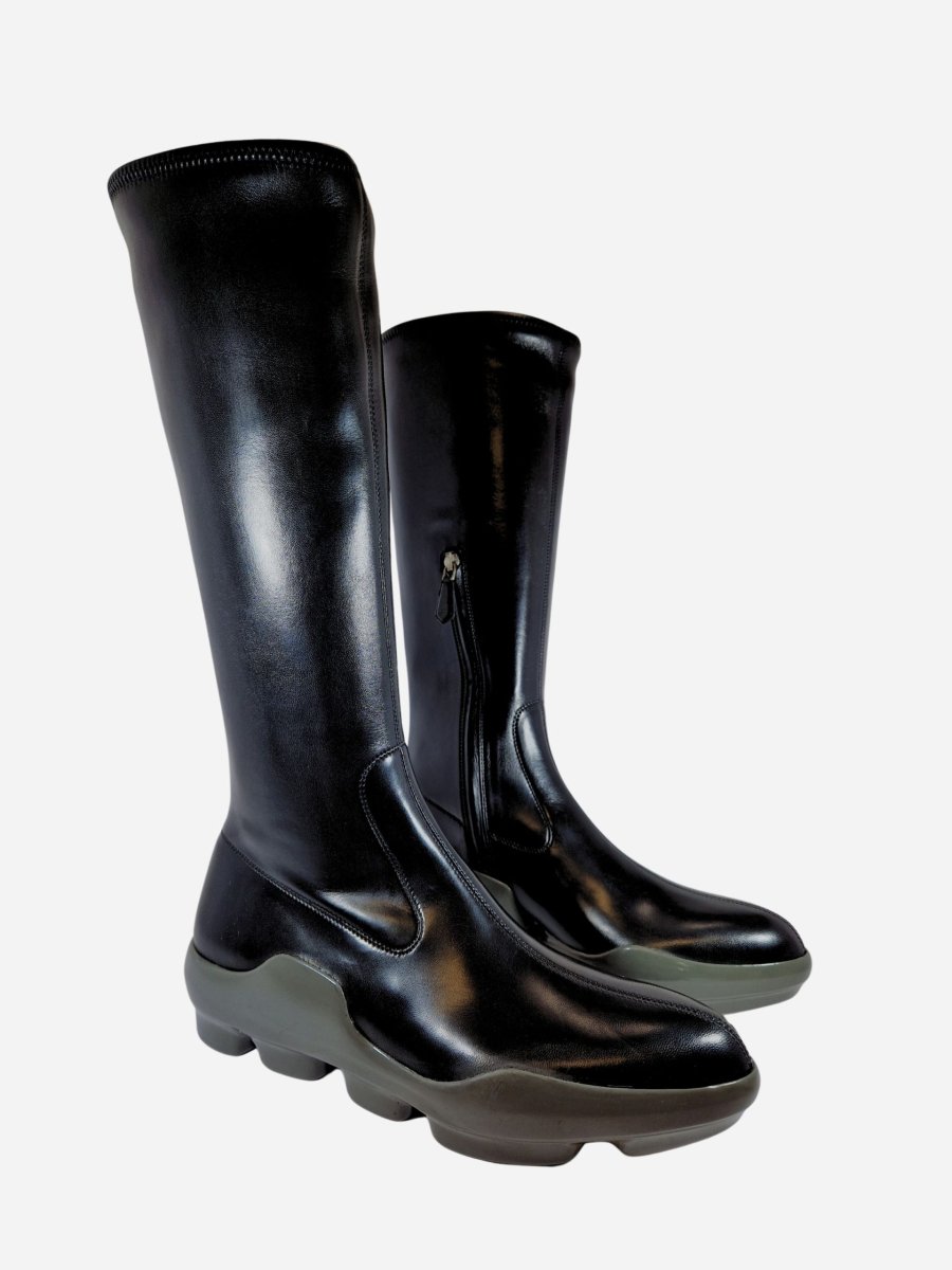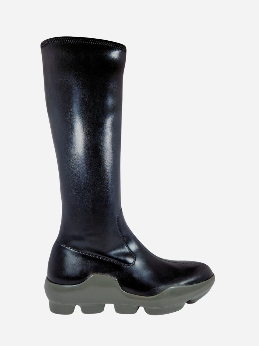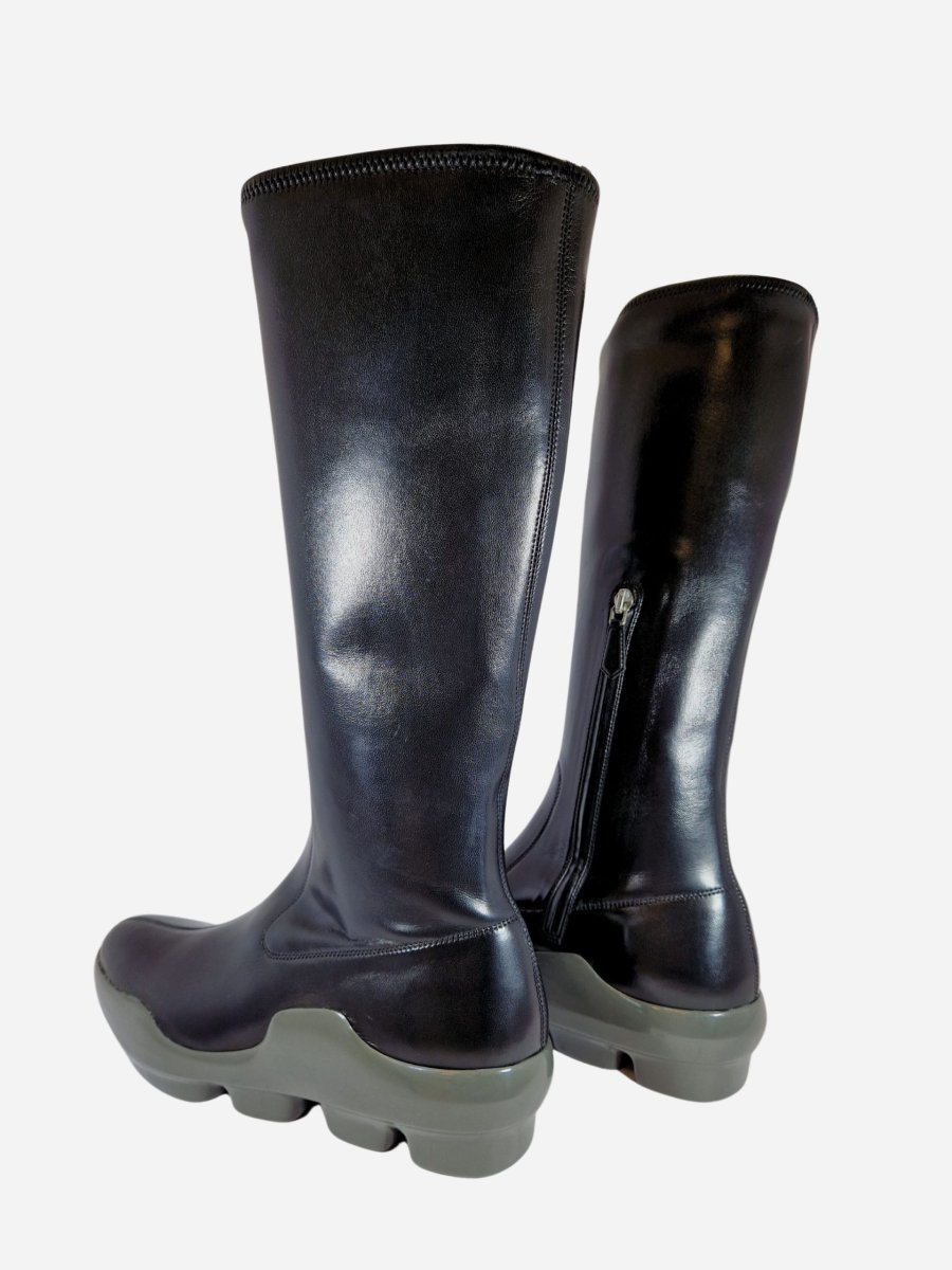 Stivali by Prada. calzature realizzate in nappa stretch con fondo a contrasto in gomma grigia. Chiusura con cerniera laterale. latezza gambale 32 cm. Altezza tacco 4,5 cm.