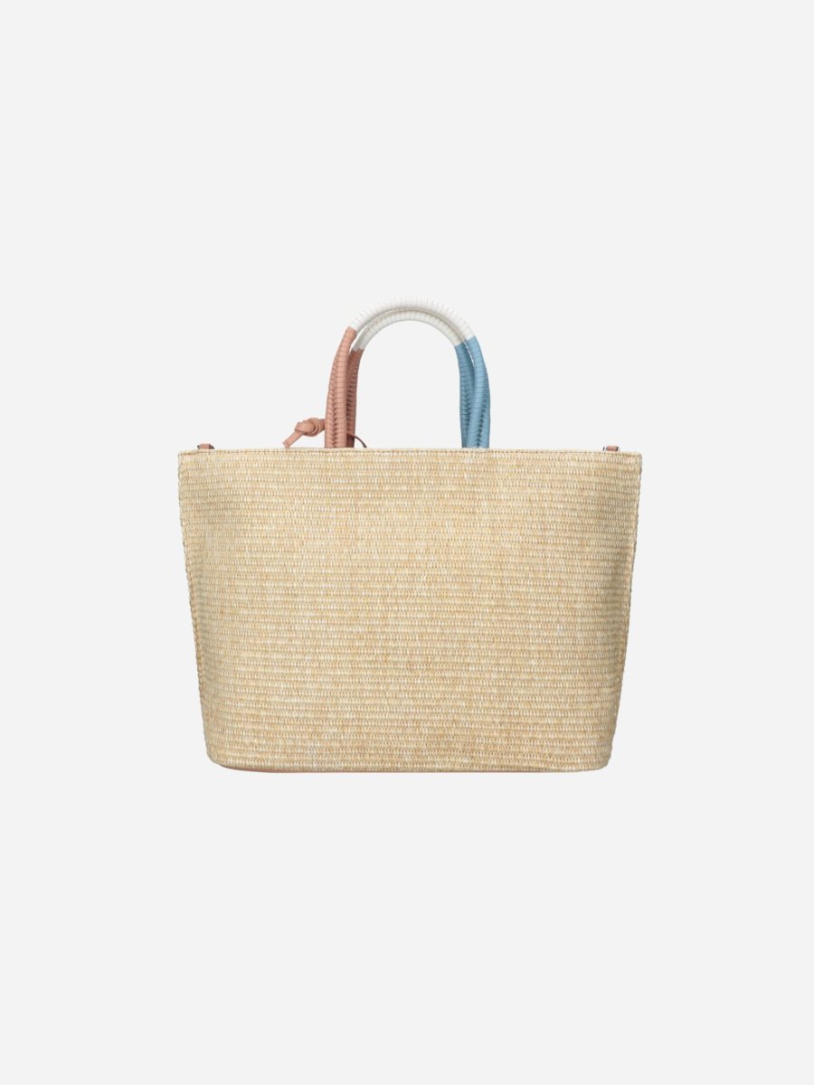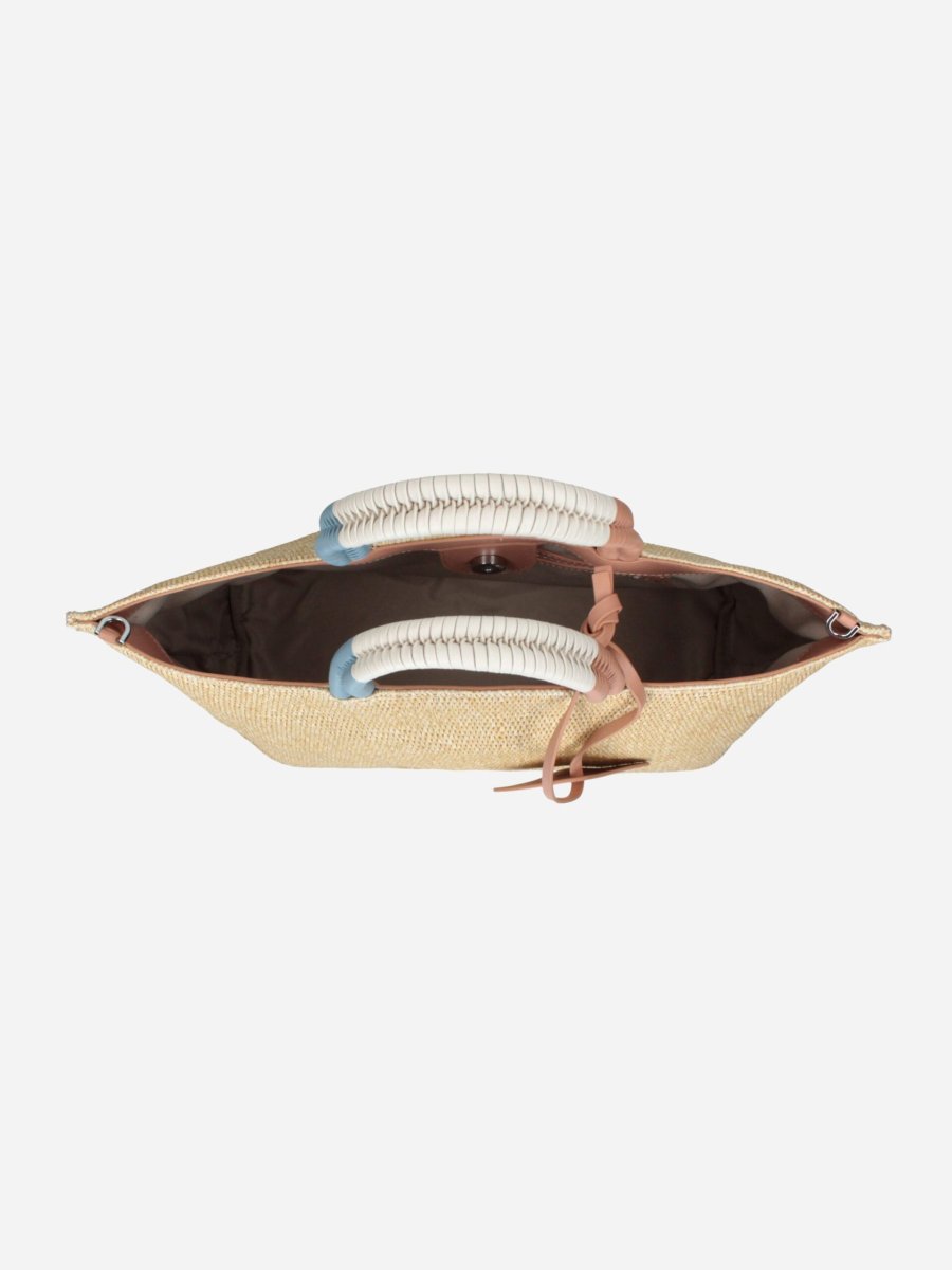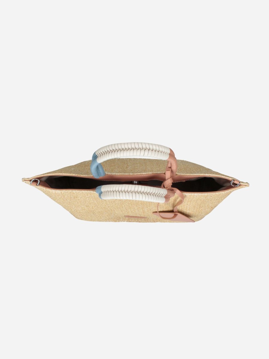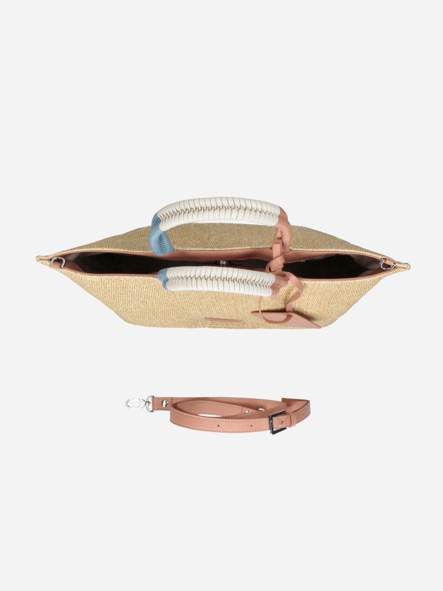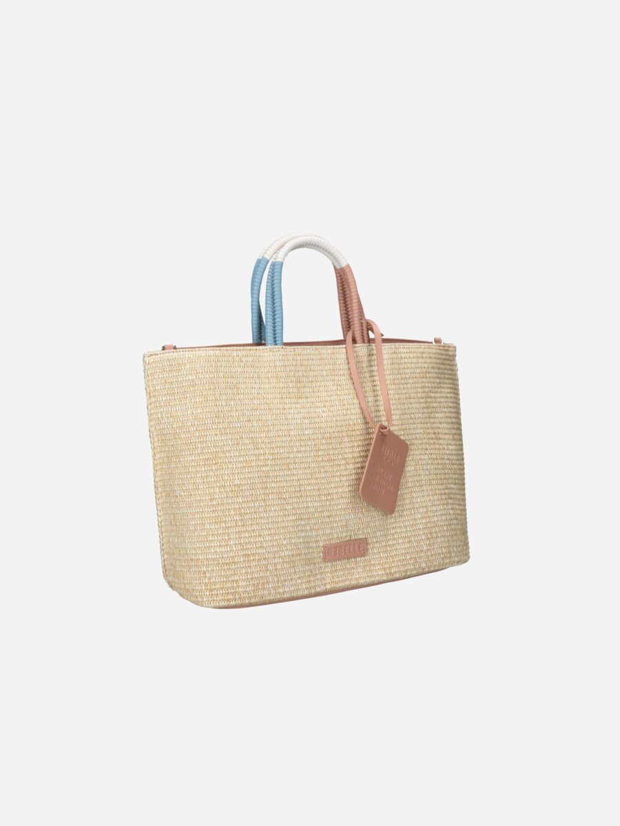 Borsa shopping FILIPPA GIZA by Rebelle. Borsa realizzata in raphia, comoda e capiente. Può essere portata a spalla o crossbody grazie alla tracollina staccabile e regolabile.