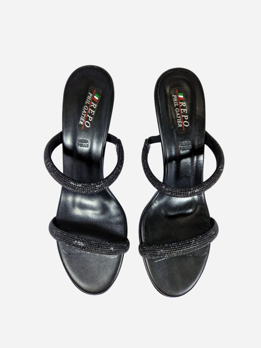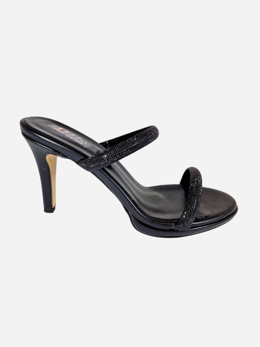 Ciabatte by Repo. Scarpe realizzate in vera pelle con suola in materiale sintetico, arricchite da due fascette ricoperte di strass. Tacco di 10 cm.