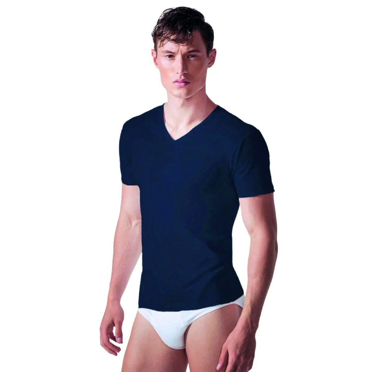 Maglia uomo Rossoporpora, in cotone bielastico, scollo v in tinta unita. Composizione: 90% cotone, 10% elastan. Confezione da 3 pezzi. Disponibile nei colori Bianco, Blu e Nero nelle taglie 3 – 4 – 5 – 6.