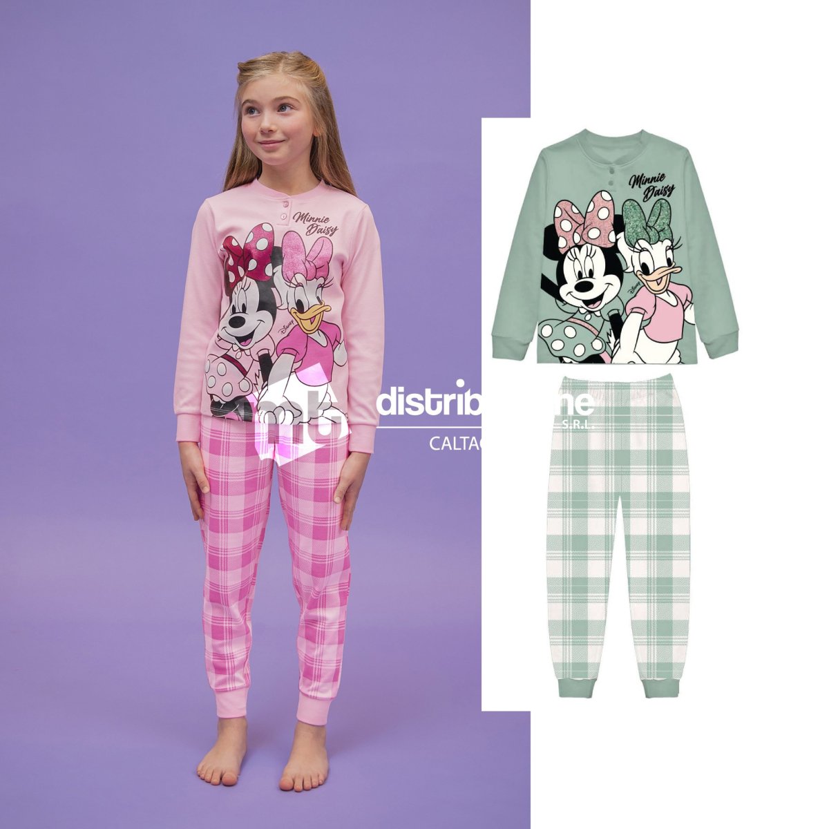Pigiama bimba Disney con fantasia Minnie, maglia manica lunga a serafino con bottoncini, pantalone lungo, il tutto con polsini. Composizione: 100% caldo cotone interlock. Confezione da 1 pezzo. Disponibile nei colori Rosa e Verde nelle taglie 3/4 โ 4/5 โ 5/6 โ 6/7 โ 7/8 โ 9/10 anni.