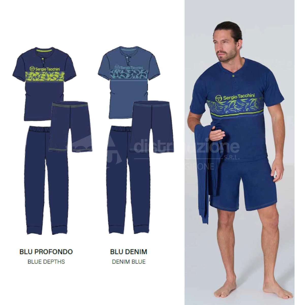 Trs pigiama uomo Sergio Tacchini primavera/estate, maglia manica corta a serafino con bottoncini, pantalone e pantaloncino in tinta unita. Confezione da 8 pezzi. Disponibile nei colori Assortiti (Blu e Denim) nelle taglie Assortite S (2pz) โ M (2pz) โ L (2px) – XL (2pz).