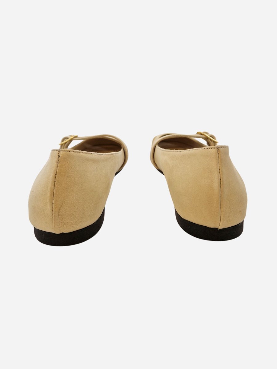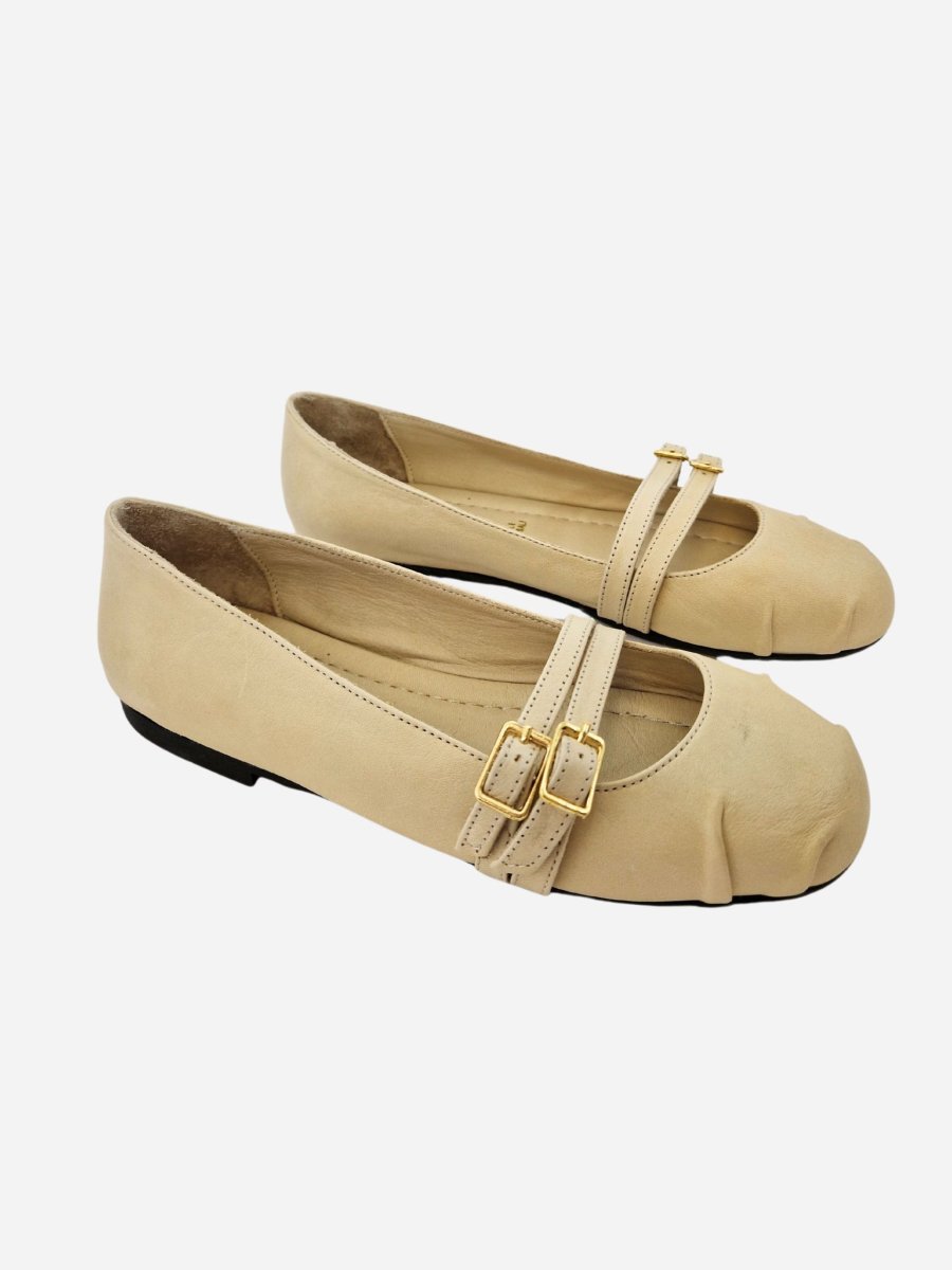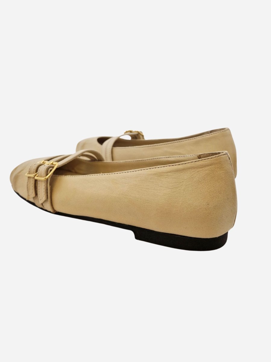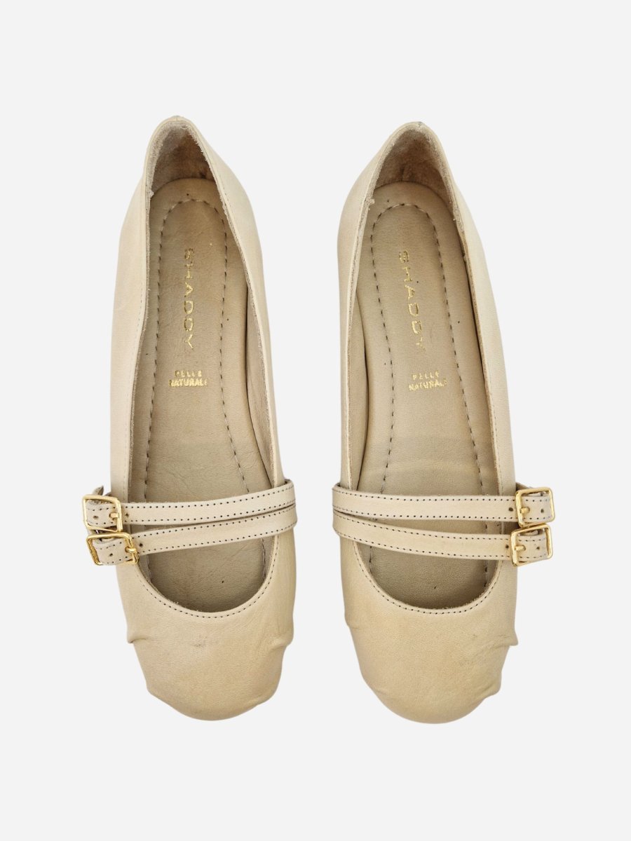 Ballerina by Shaddy. Calzature realizzate in vera pelle con morbido fondo in cuoio e suola in materiale sintetico. Punta arrotondata arricchita da 2 fibbie. Disponibile in piรน varianti: cuoio, blu navy e panna.