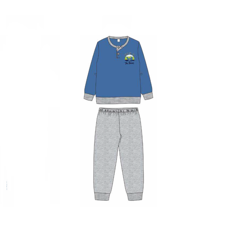 Pigiama ragazzo Sognosondesto primavera/estate con fantasia, maglia manica lunga a serafino con bottoncini, pantalone lungo in tinta unita e polsini alle caviglie. Composizione: 100% cotone. Confezione da 1 pezzo. Disponibile nei colori Avio e Grigio nelle taglie 12 – 14 – 16 anni.