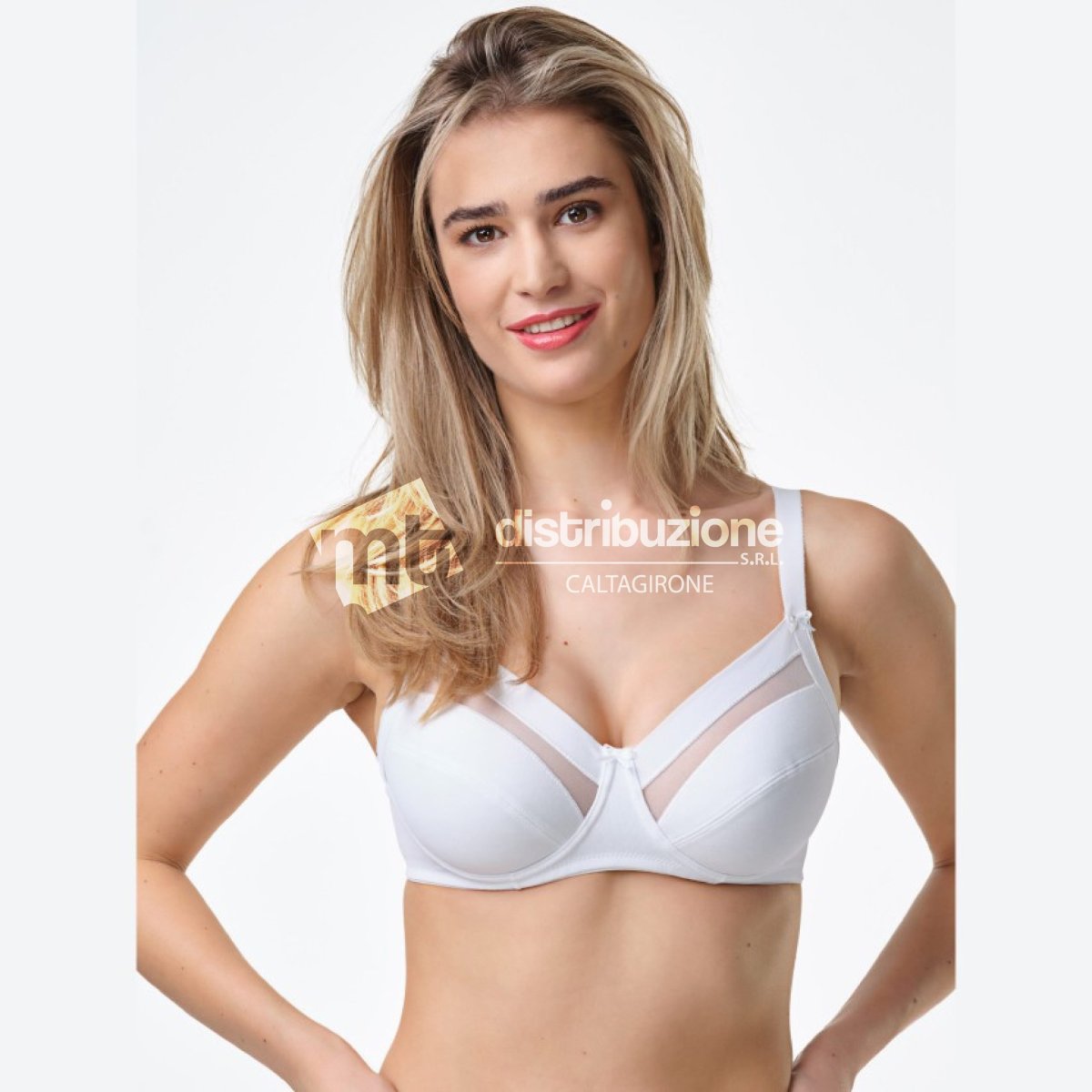 Reggiseno con ferretto in microfibra elasticizzata e inserti in tulle sulla coppa per donare al seno maggiore profonditaโ. Coppe non imbottite con interno in cotone e speciale struttura a tre sezioni, adatto anche ai seni piu generosi. Spalline regolabili. Gancio a 3 regolazioni. Composizione: 20% Cotone – 64% Poliammide – 16% Elastame Confezione da 1 pezzo. Disponibile nei colori Bianco, Nero e Nudo nelle taglie 3 โ 4 โ 5 โ 6 – 7 – 8 .