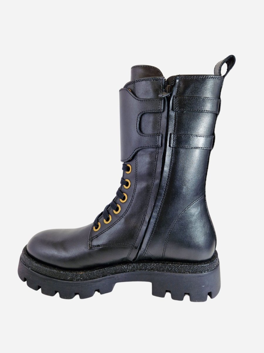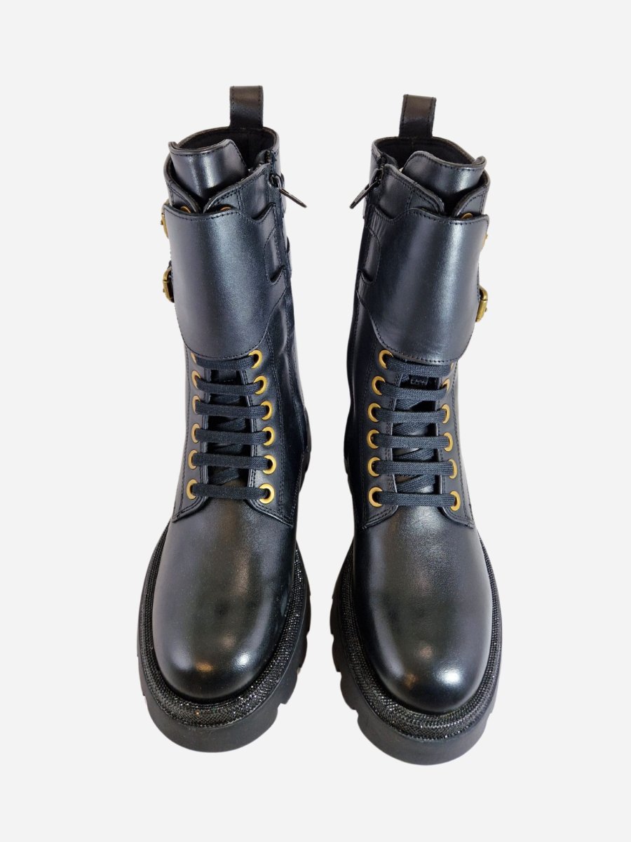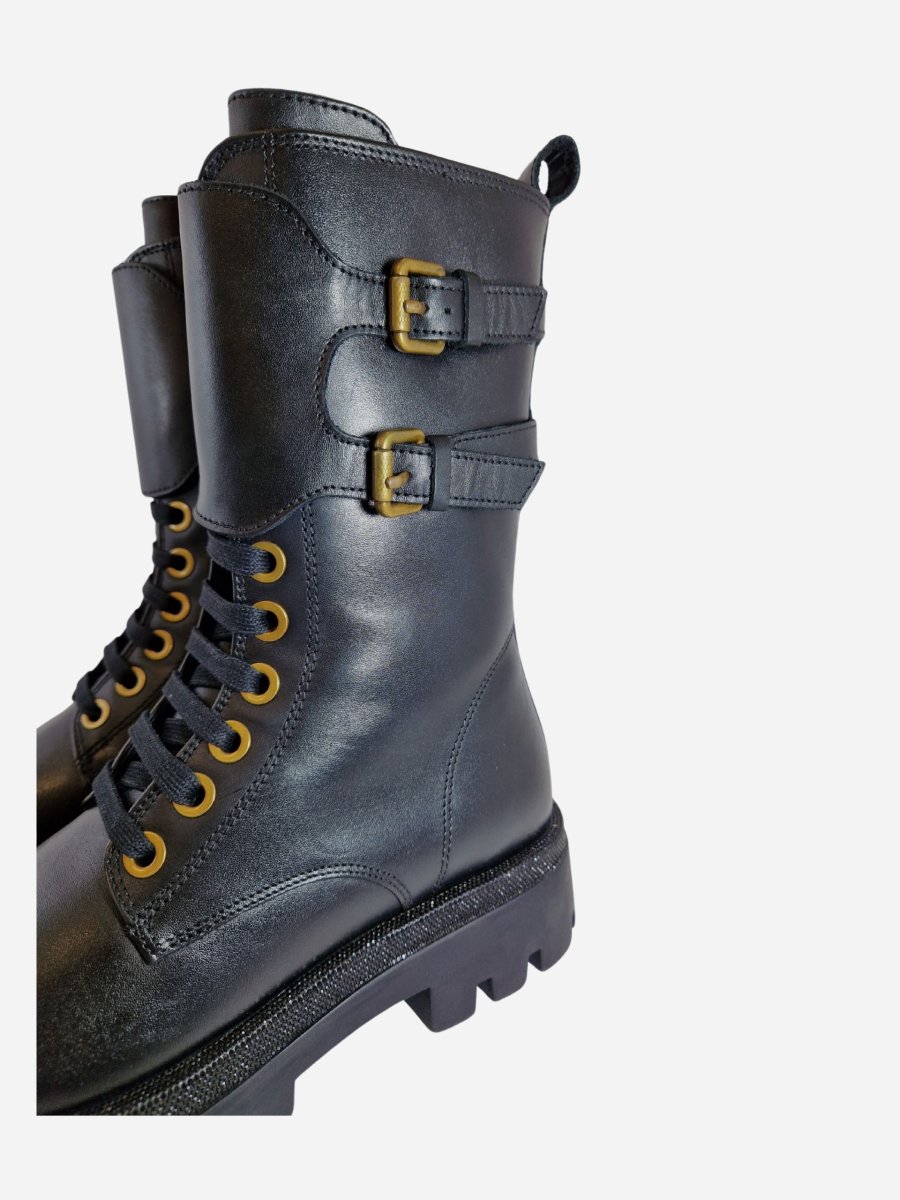 Anfibi by Studio Mode. Calzature a gambale alto realizzati in vera pelle, arricchiti da due fibbie e strass lungo tutto il piede. Chiusura con cerniera laterale.