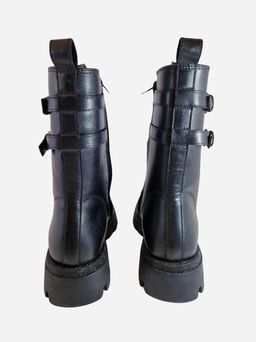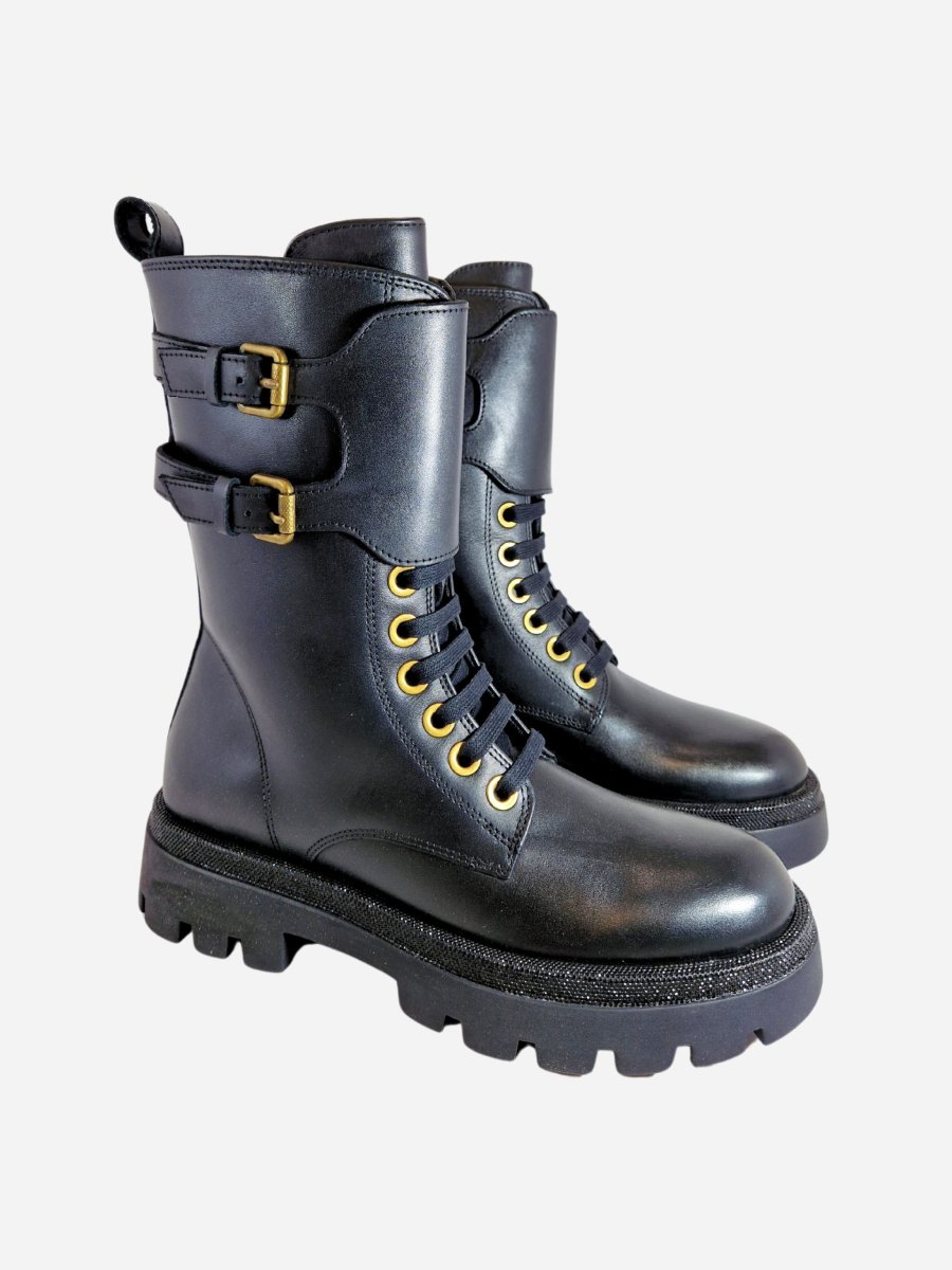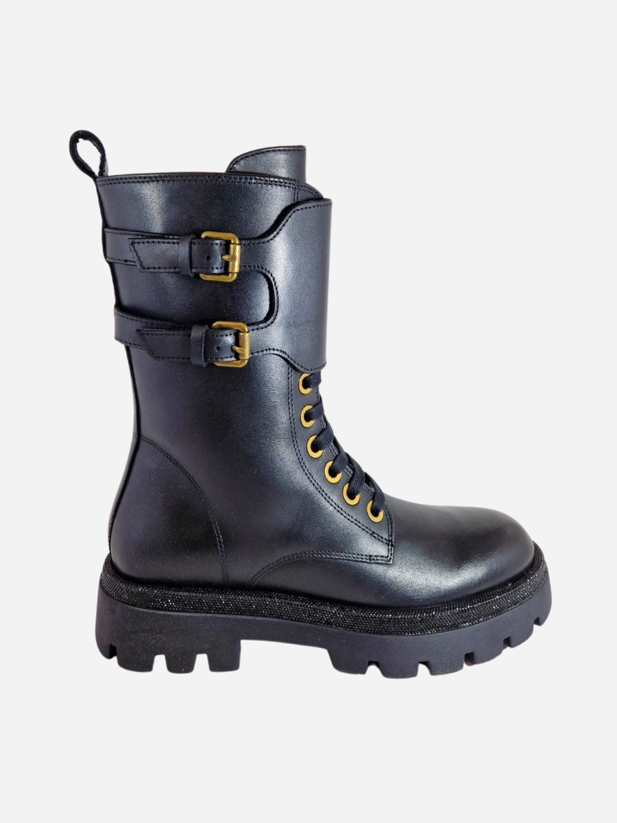 Anfibi by Studio Mode. Calzature a gambale alto realizzati in vera pelle, arricchiti da due fibbie e strass lungo tutto il piede. Chiusura con cerniera laterale.