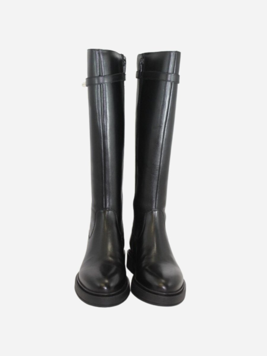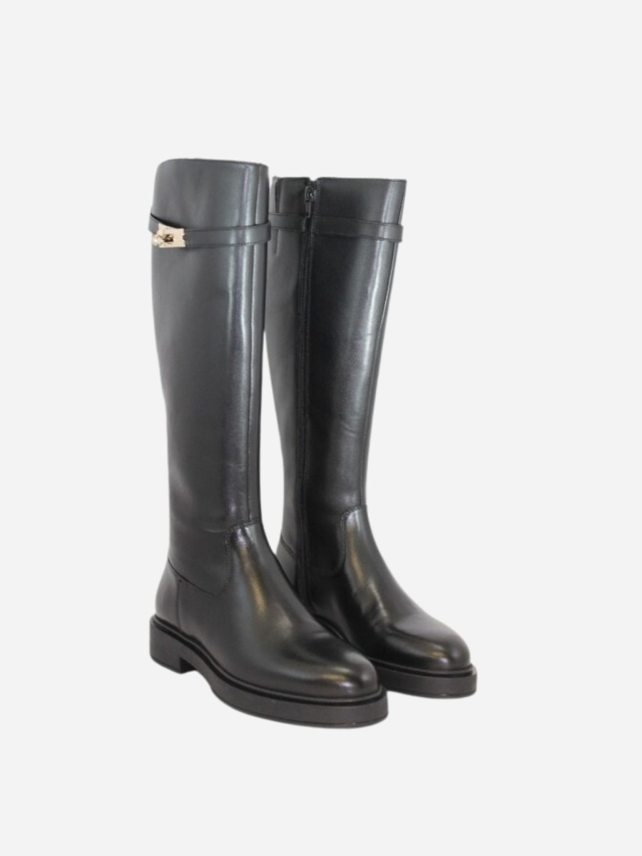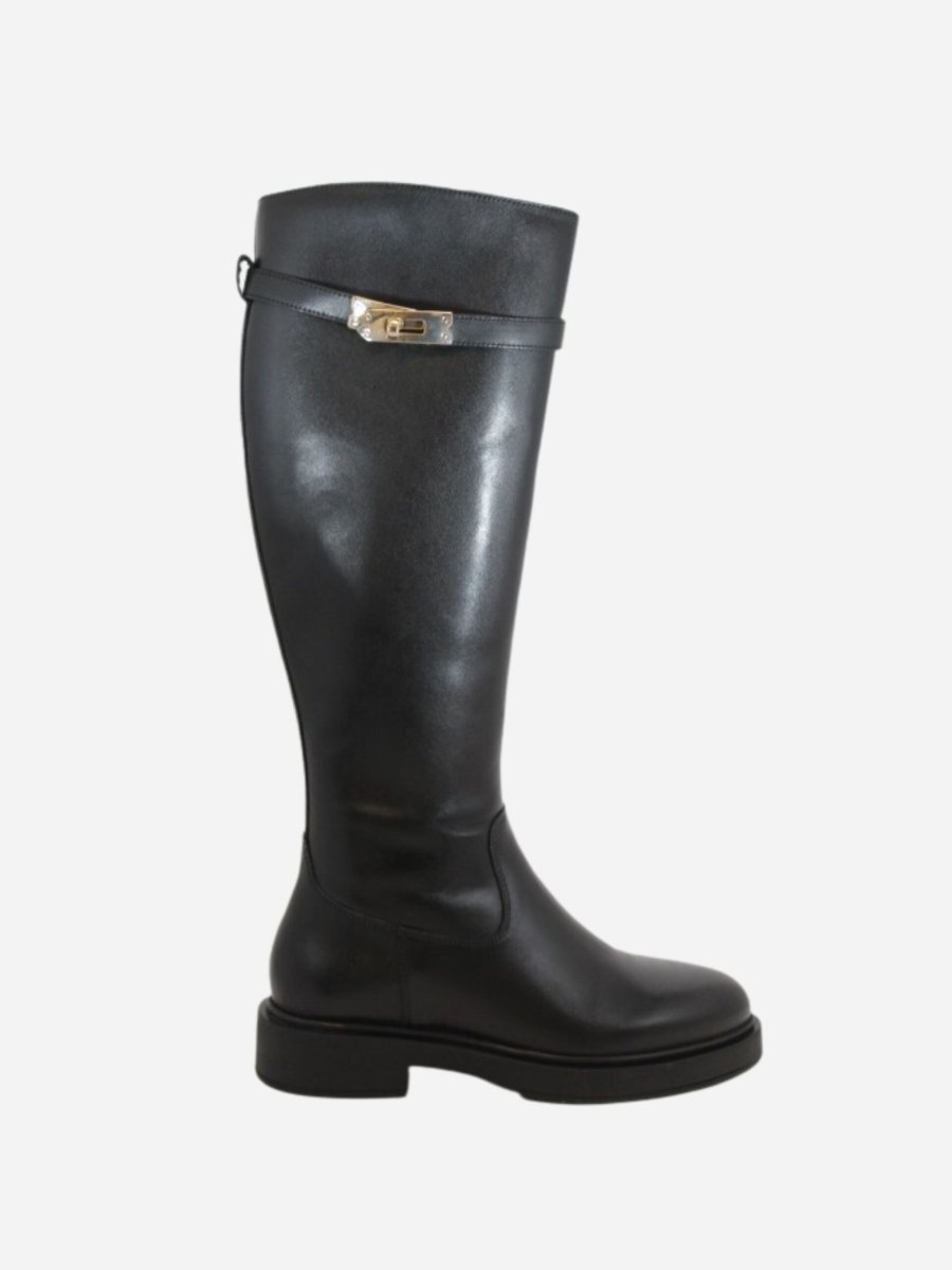 Stivali 908 by Studio Mode nella variante nera. Scarpe realizzate in vera pelle con fondo in cuoio e suola in materiale sintetico di qualitร . Nella parte superiore รจ presente un caratteristico accessorio con lucchetto dorato. Chiusura con cerniera laterale interna. Le calzature di Studio Mode sono interamente Made in Italy, realizzate con materiali di prima qualitร per garantire la comoditร nella vita quotidiana.