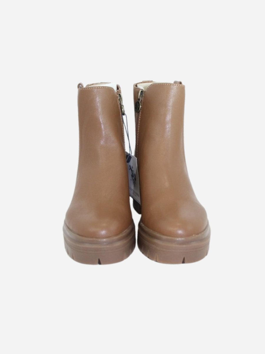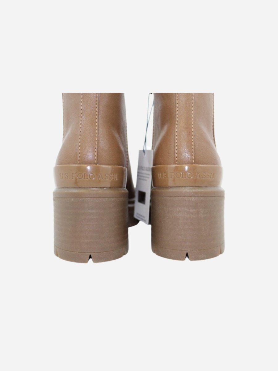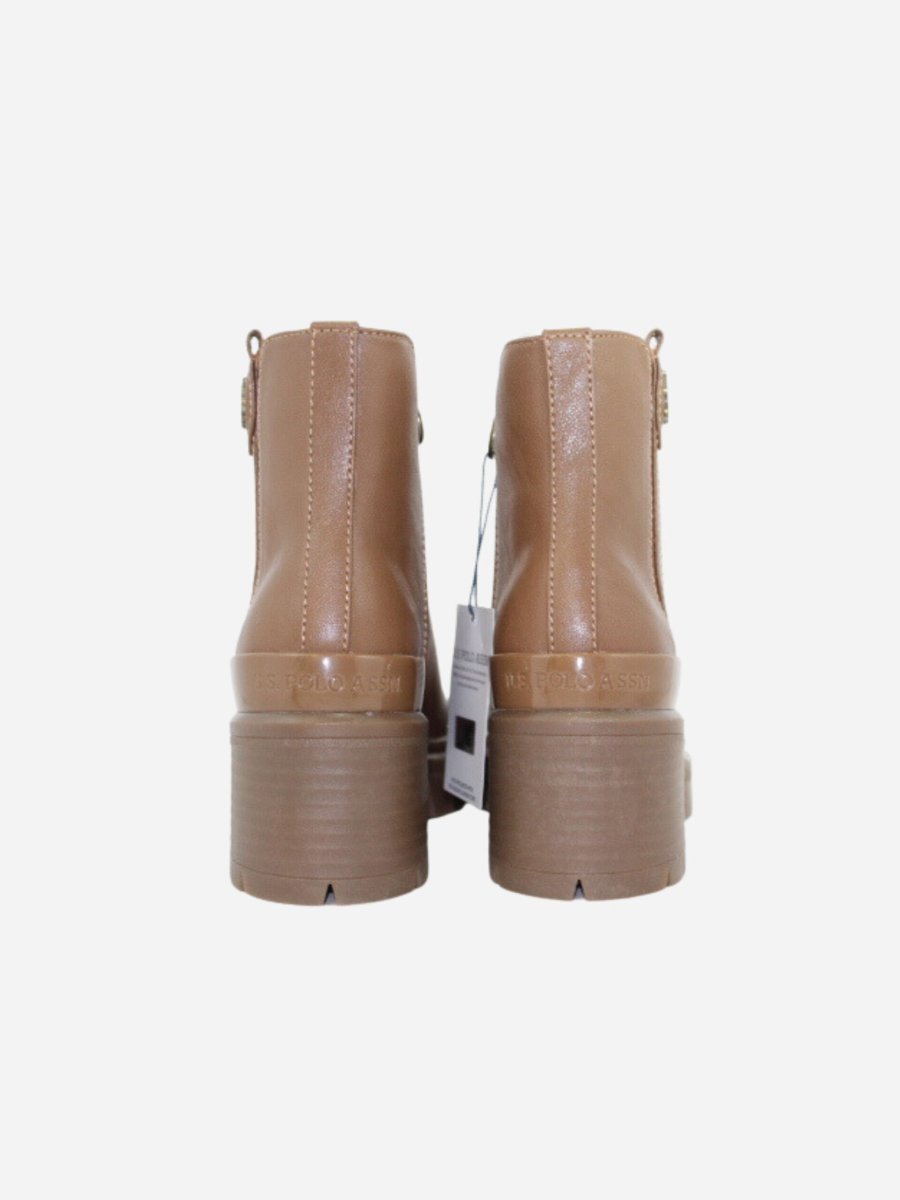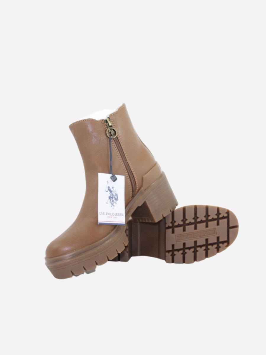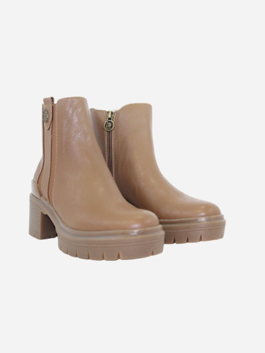 Beatles HALEY by U.S. Polo Assn. nella variante cuoio. Scarpe realizzate in ecopelle di prima qualitร e tessuto. Chiusura con cerniera laterale. Tacco largo di 6 cm. Dettaglio logo sopra al tallone. Suola track in gomma