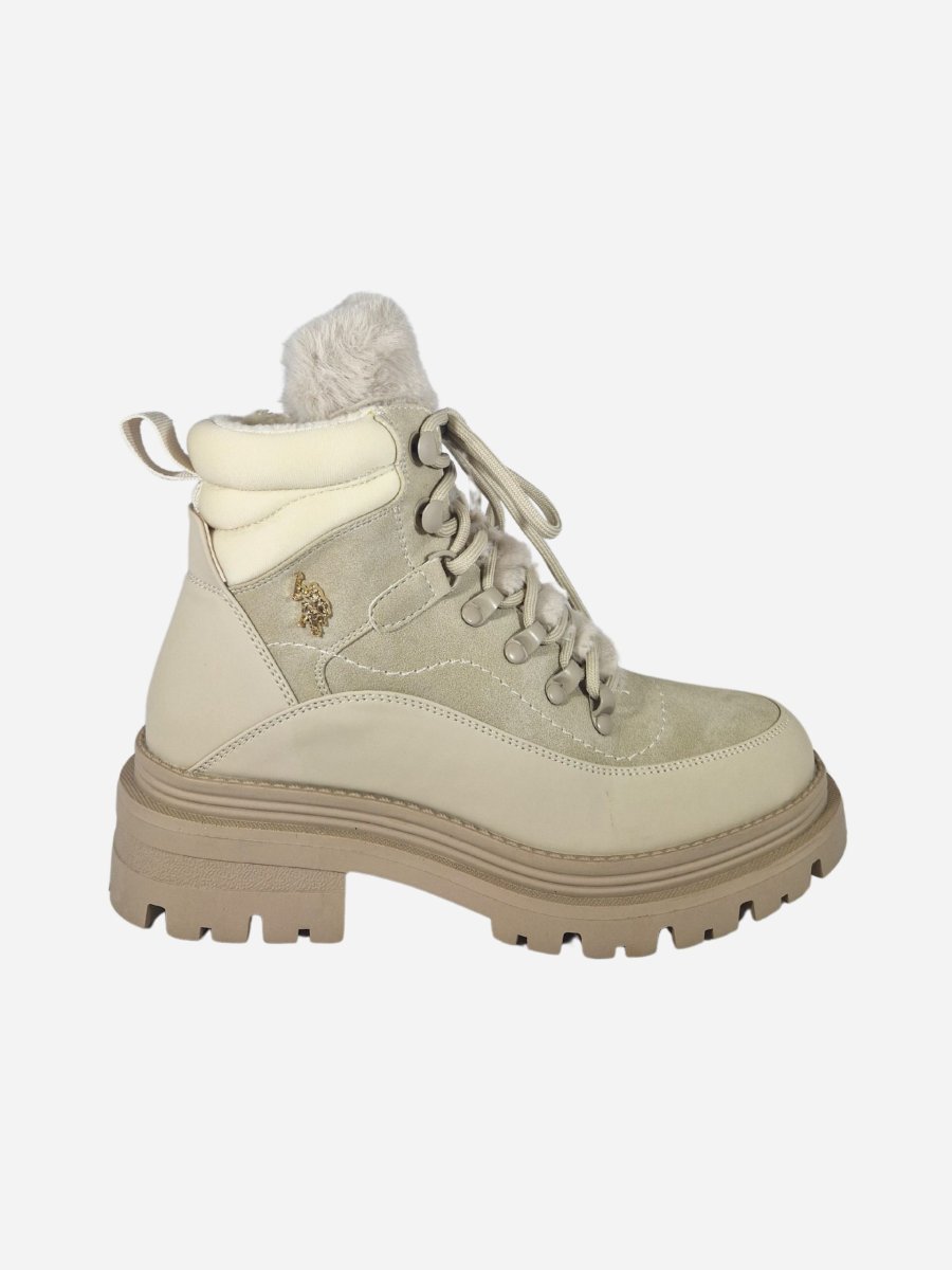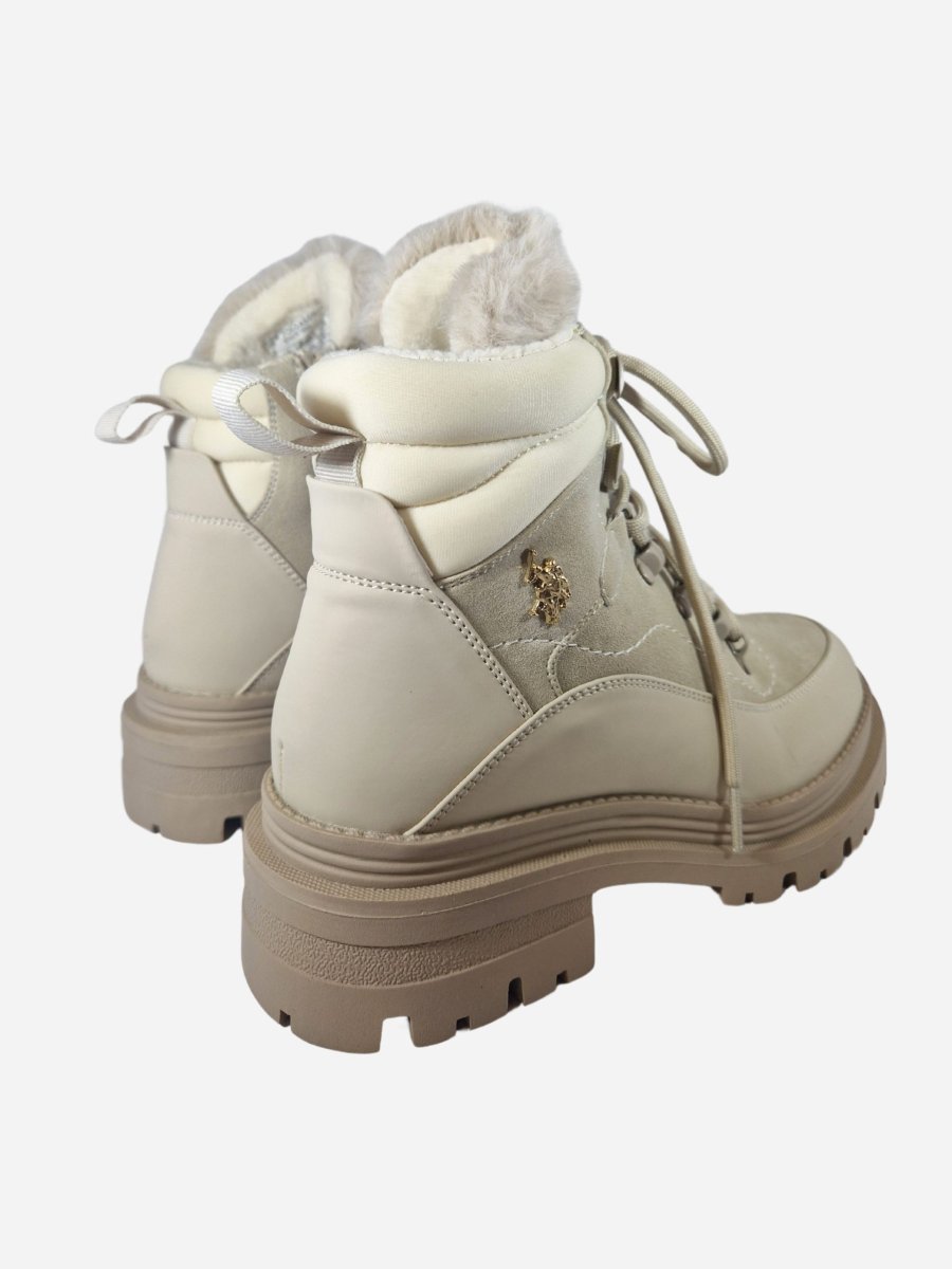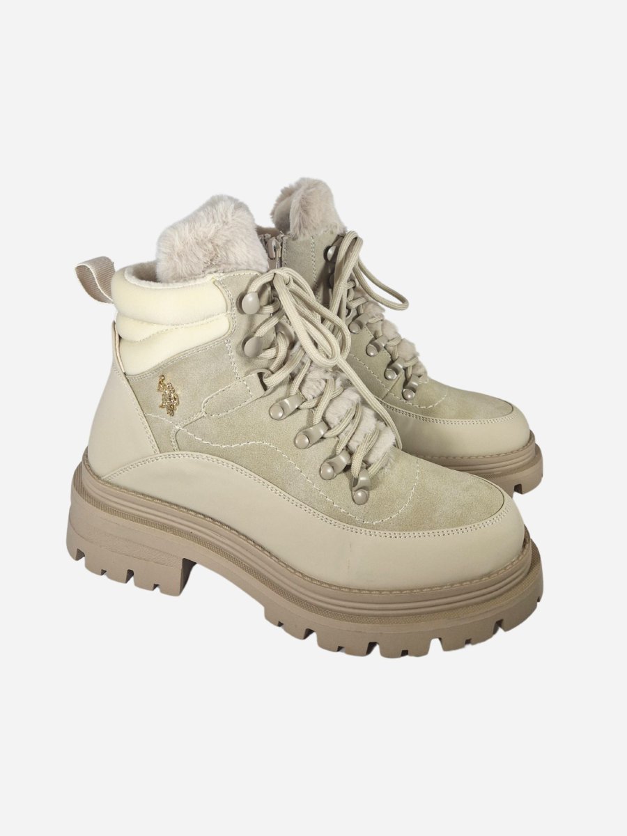 Scarponcino ALICYA001 by U.S. POLO ASSN. Scarpe realizzate in similpelle e suede, con toppone in tessuto imbottito. Linguetta ed interno in morbido pelo. Suola in gomma. Logo dorato applicato lateralmente a contrasto. Chiusura con lacci e cerniera laterale.