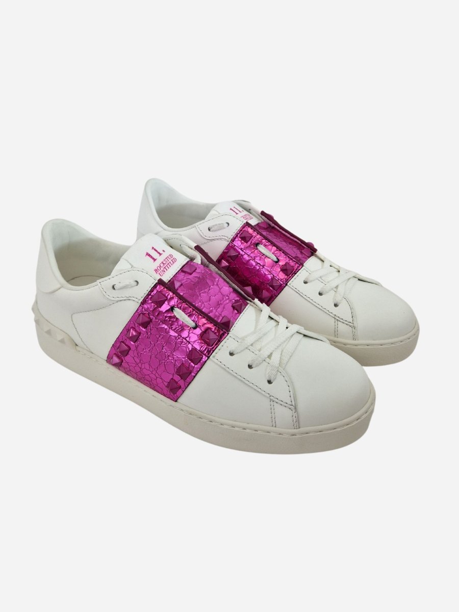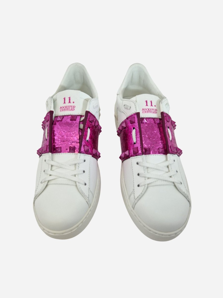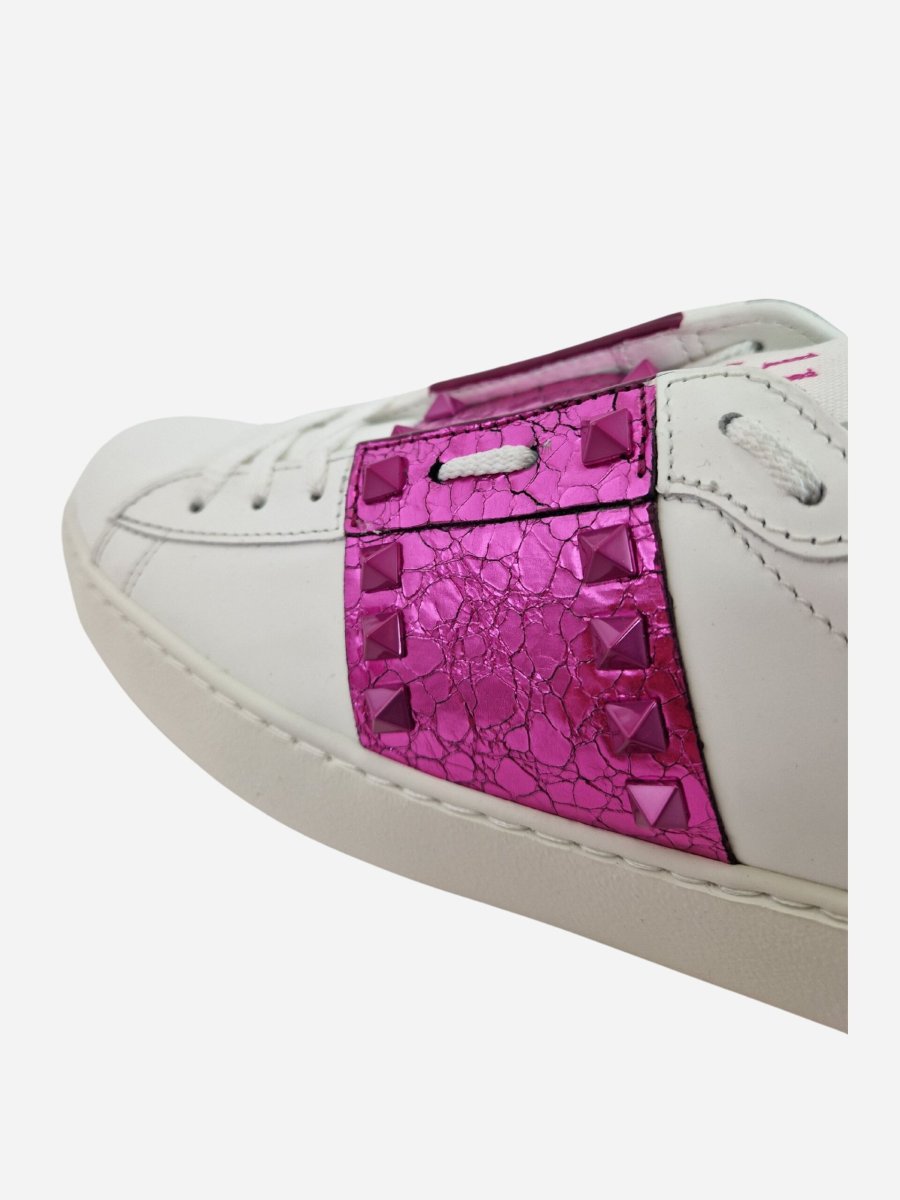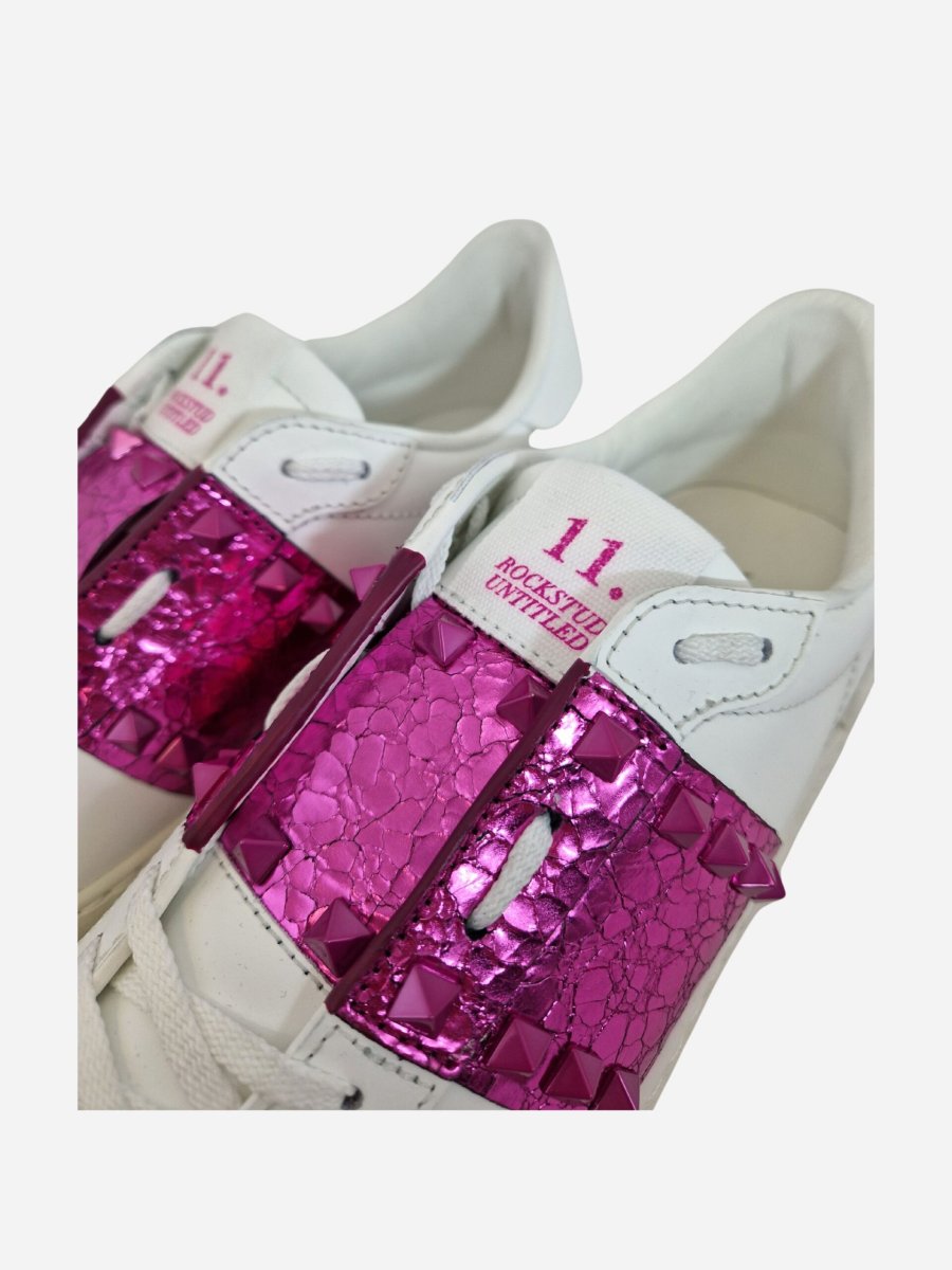 Sneakers Rockstud by Valentino Garavani. Scarpe realizzate interamente in vera pelle di bovino con suola in gomma. Fascia metallizzata fuxia con iconiche borchiette della maison laterali ton sur ton e intorno al tallone. Nella confezione รจ presente la dustbag. Made in Italy.