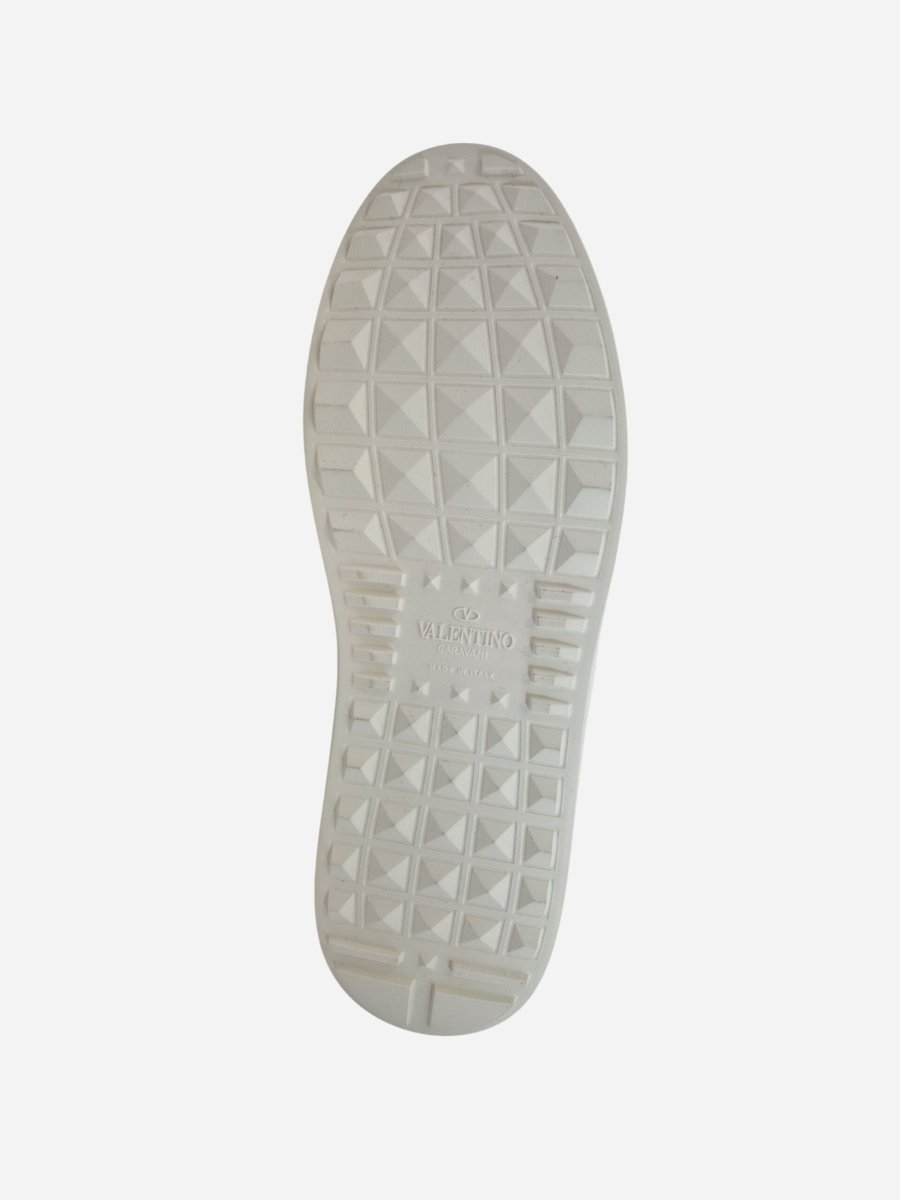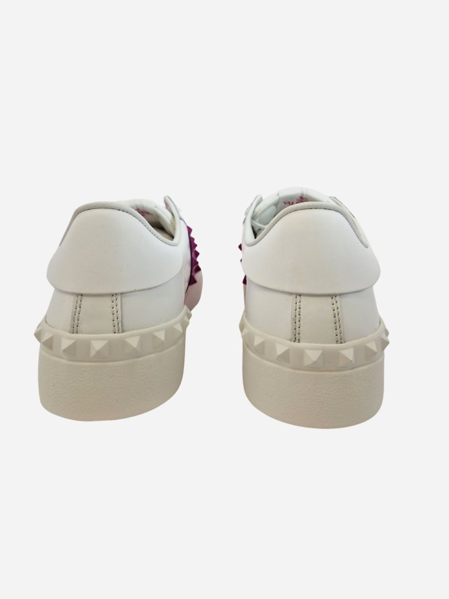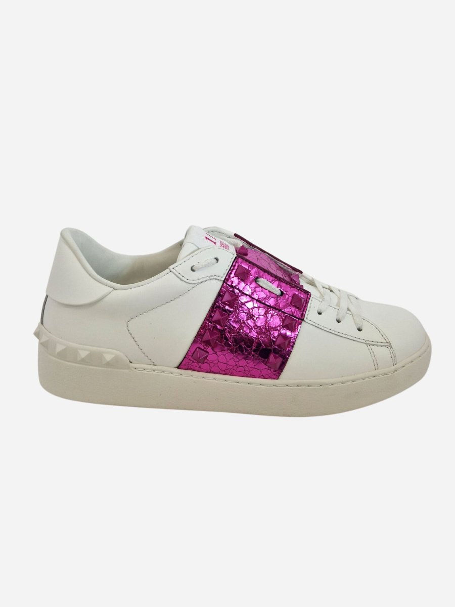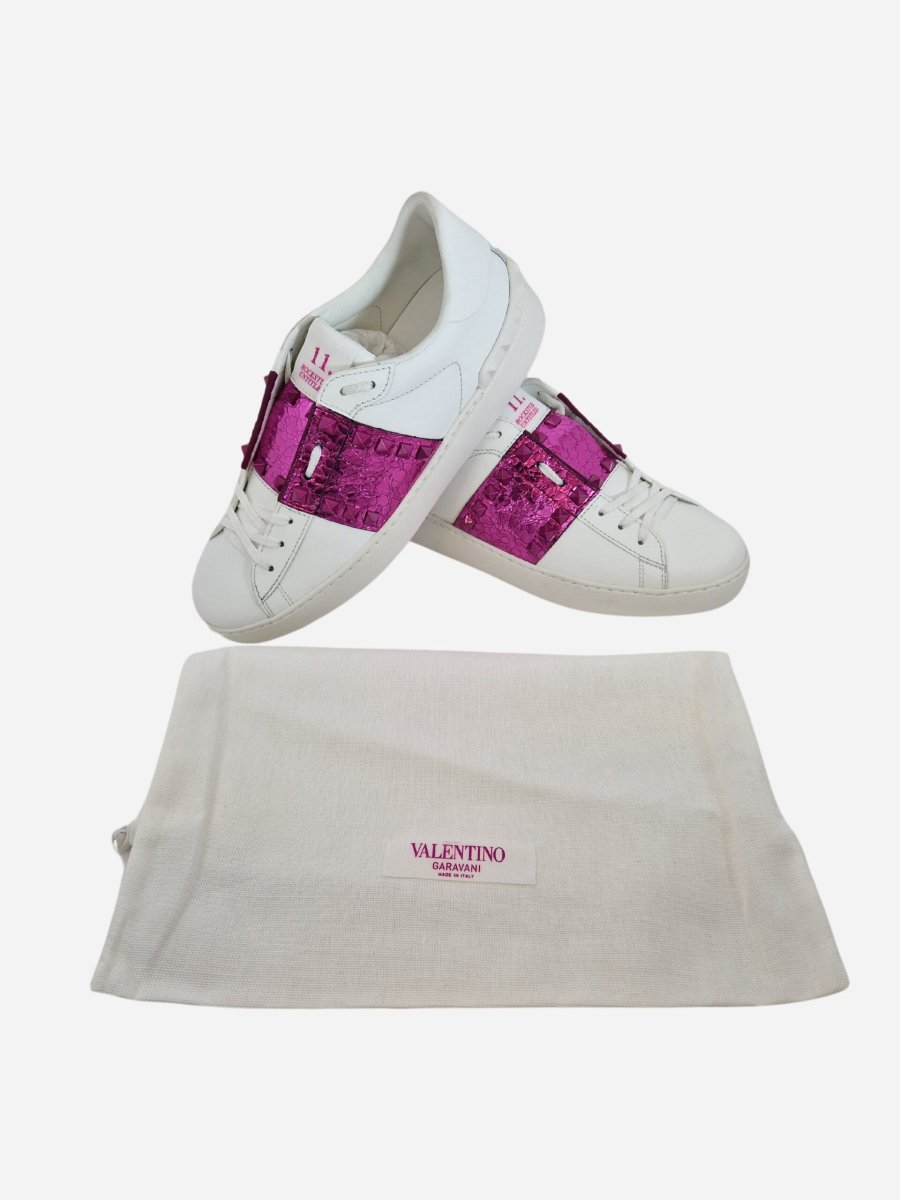 Sneakers Rockstud by Valentino Garavani. Scarpe realizzate interamente in vera pelle di bovino con suola in gomma. Fascia metallizzata fuxia con iconiche borchiette della maison laterali ton sur ton e intorno al tallone. Nella confezione รจ presente la dustbag. Made in Italy.