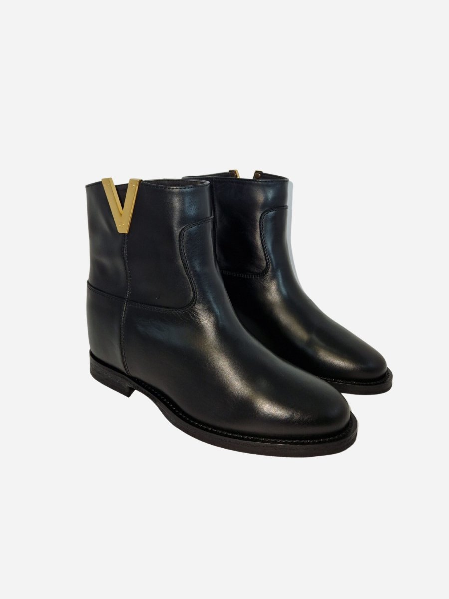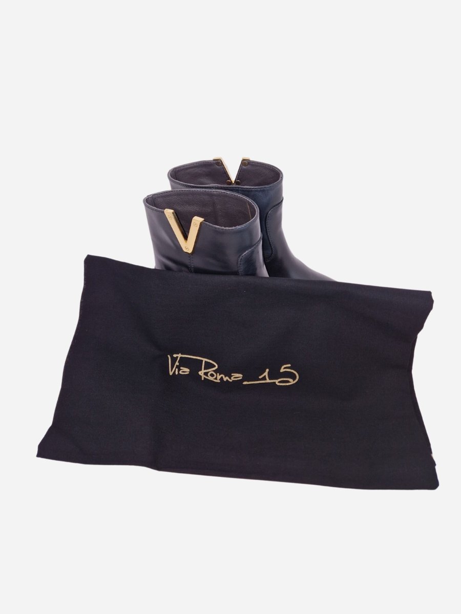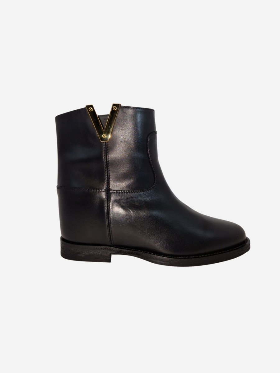 Tronchetto by Via Roma 15 nella variante nera. Stivali realizzati in vera pelle con zeppa interna di 5 cm. Dettaglio V dorata liscia nella parte superiore. Nella confezione รจ presente la dustbag. Made in Italy