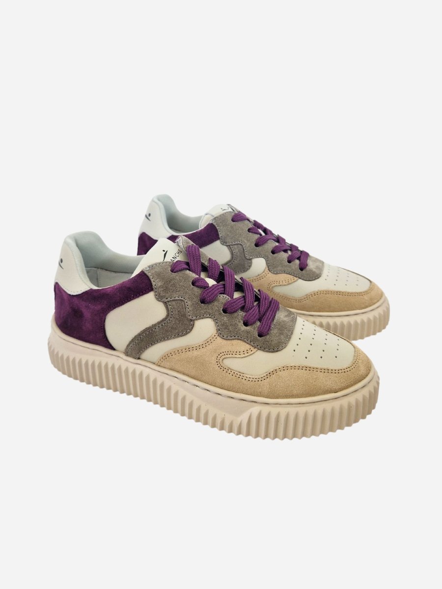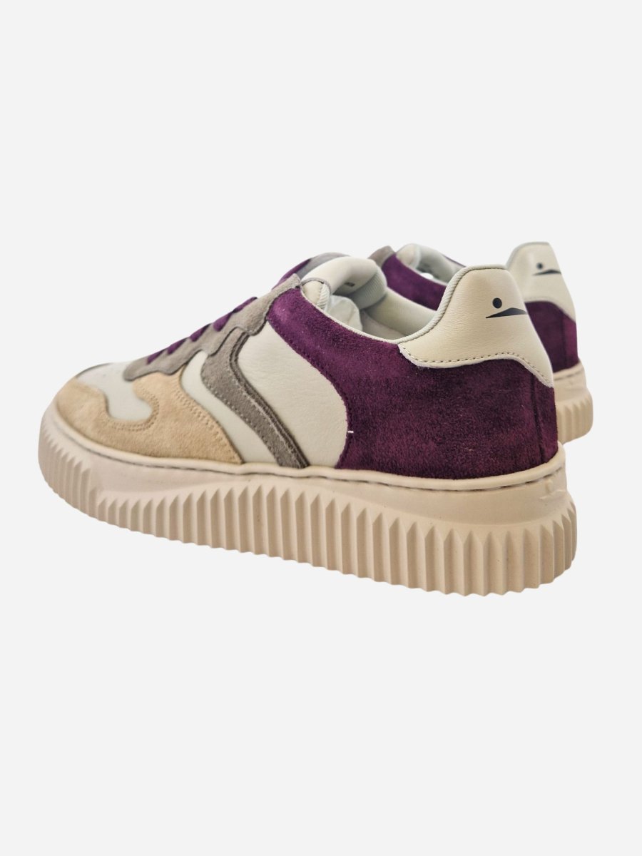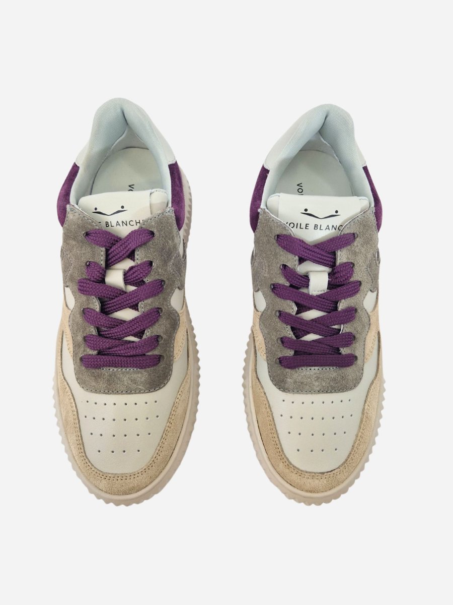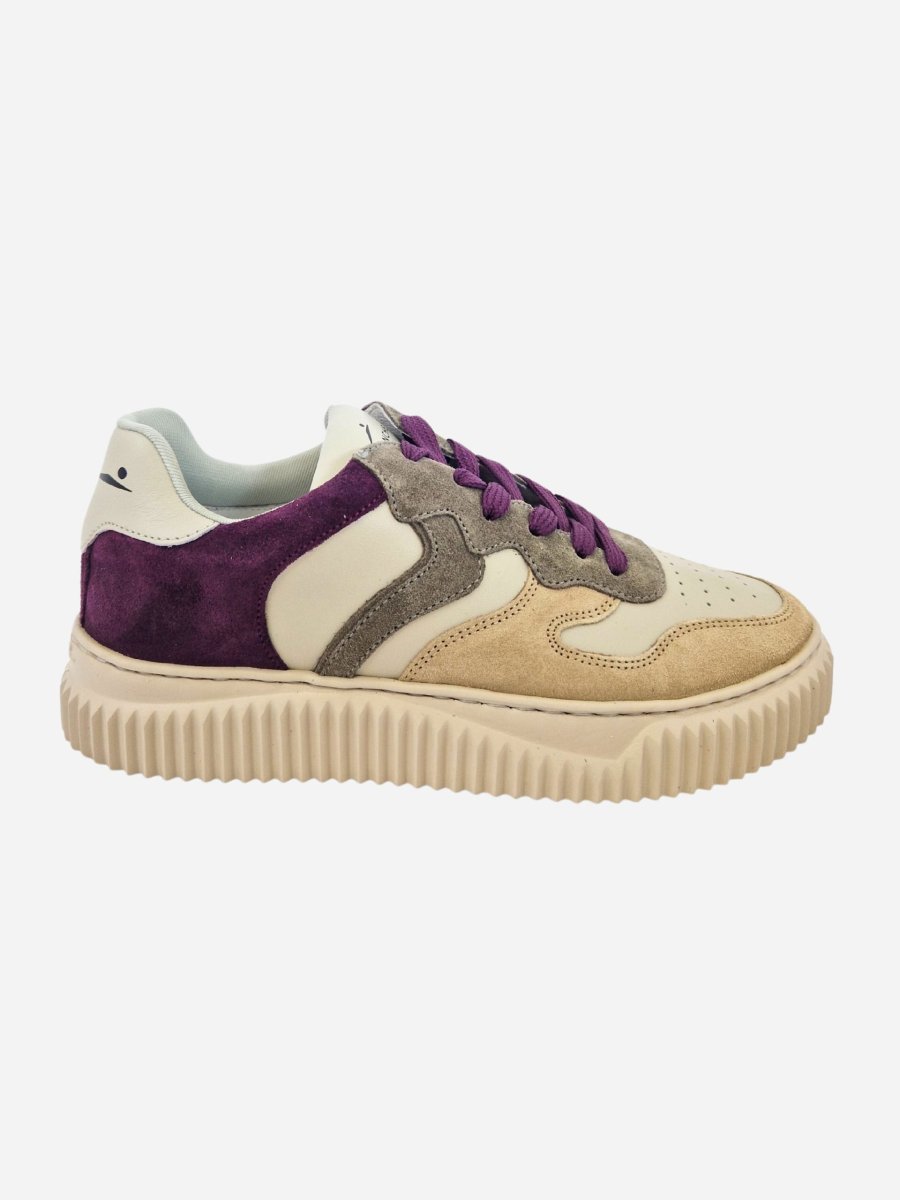 Sneakers by Voile Blanche. Scarpe realizzate in pelle con inserti in camoscio colorato viola, beige e grigio. Suola in gomma. Chiusura con lacci.