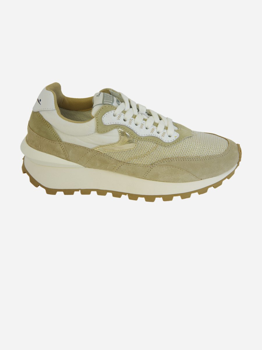 Sneaker di ispirazione running Qwark Hype di Voile Blanche. Tomaia in pelle di vitello e inserto in mesh tecnico traspirante sulla punta. Il tocco dorato sullo slash aggiunge un’atmosfera glamour, enfatizzata dallo spoiler tridimensionale sotto il tallone. Suola in gomma con battistrada personalizzato.