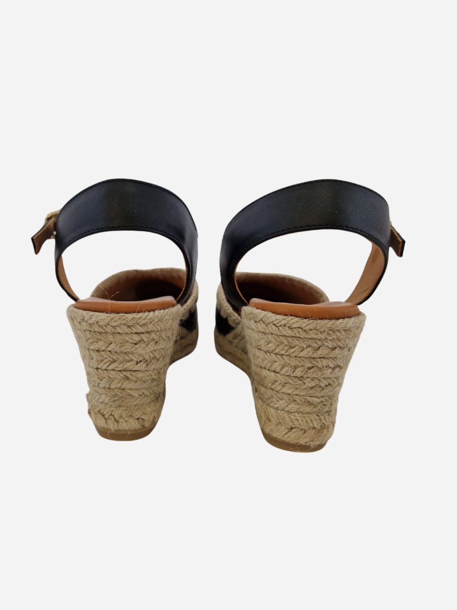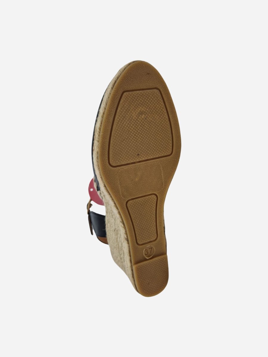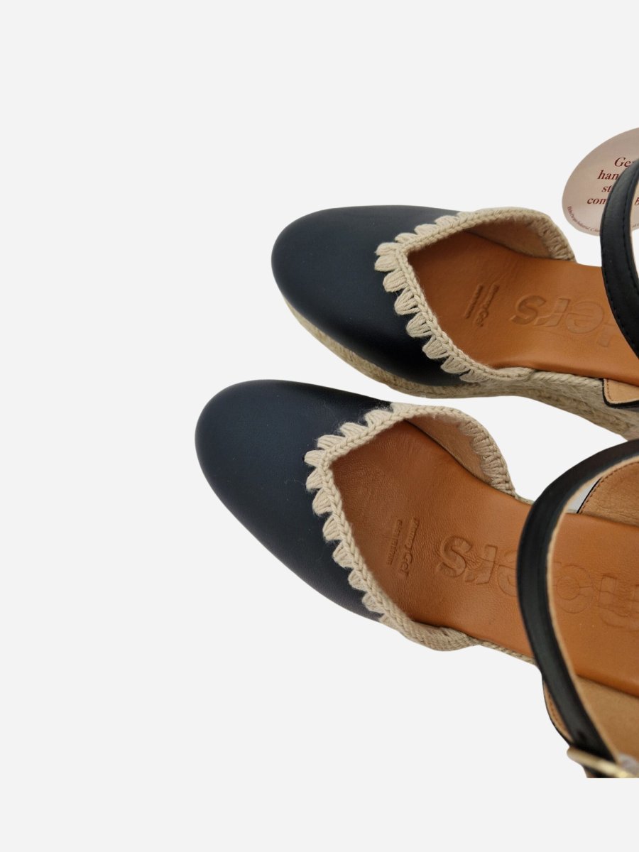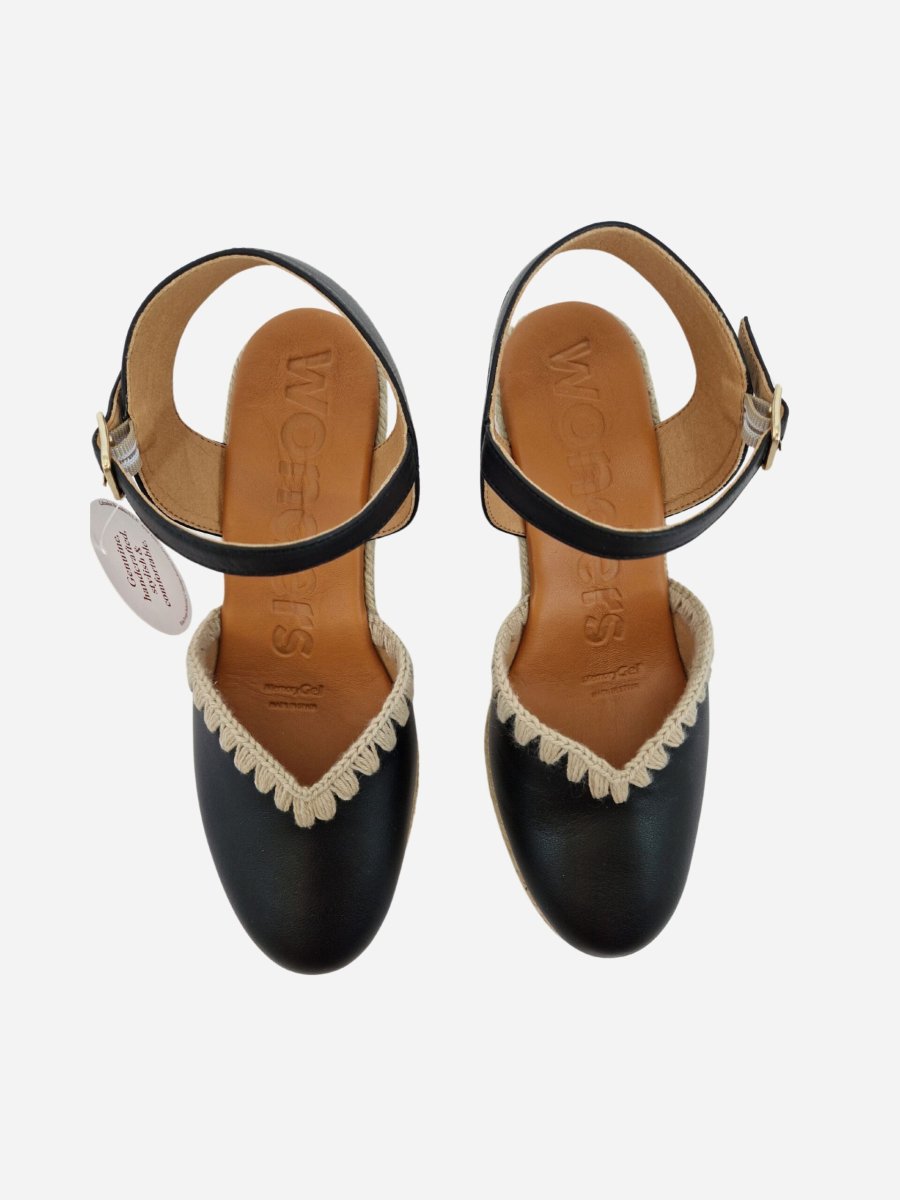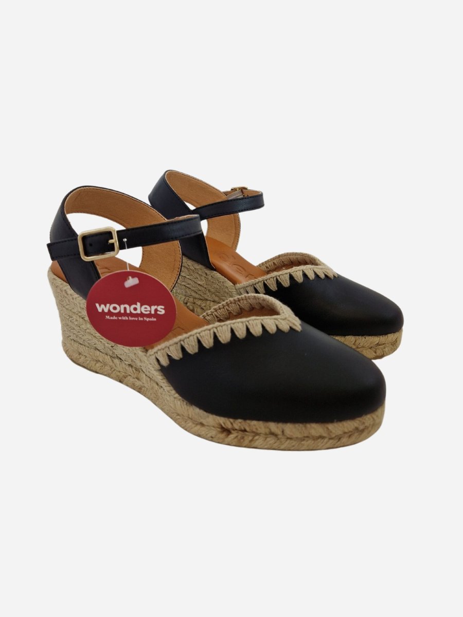 Espadrillas by Wonders. Scarpe realizzate in vera pelle, con morbido fondo in cuoio e suola in gomma. Comoda zeppa di 7 cm in corda intrecciata. Chiusura con cinturino alla caviglia. Disponibile in due varianti: nero, cuoio.