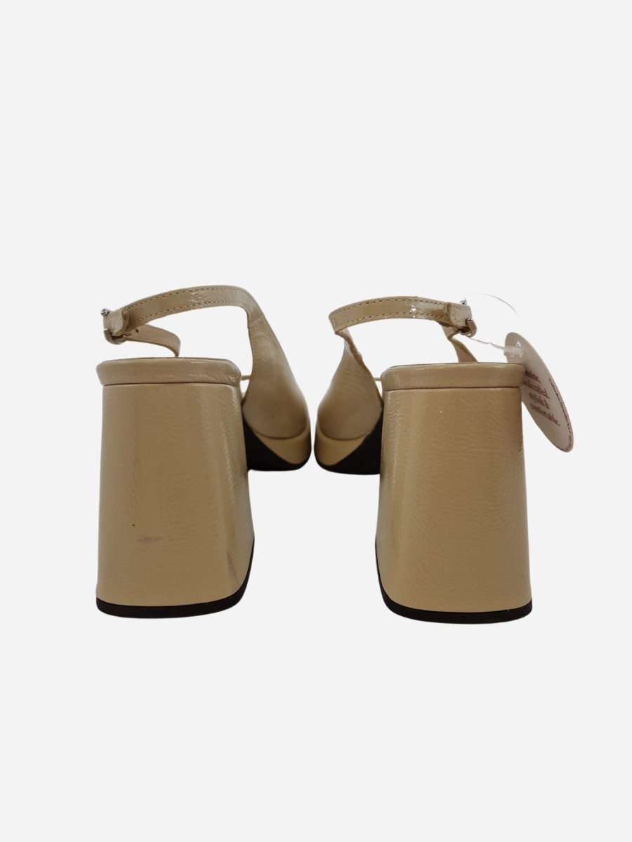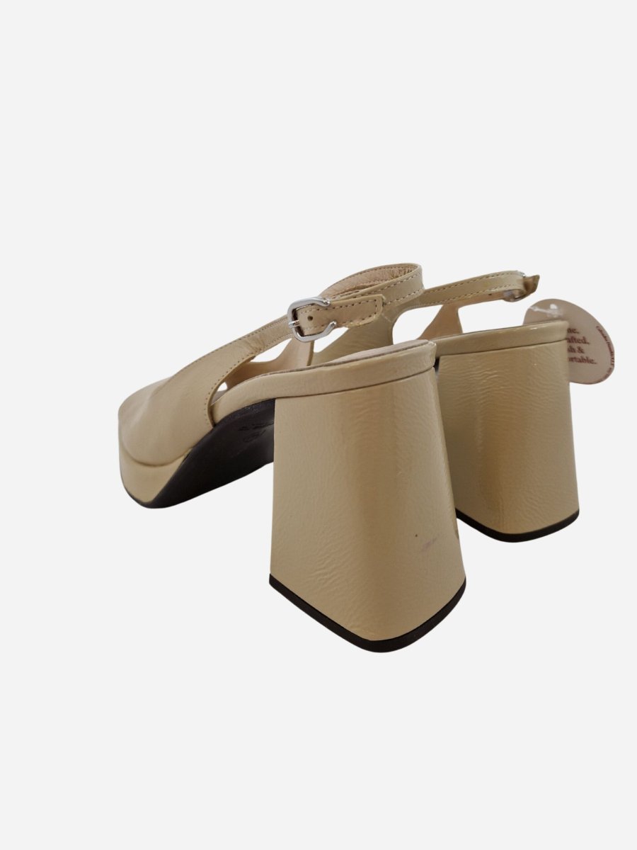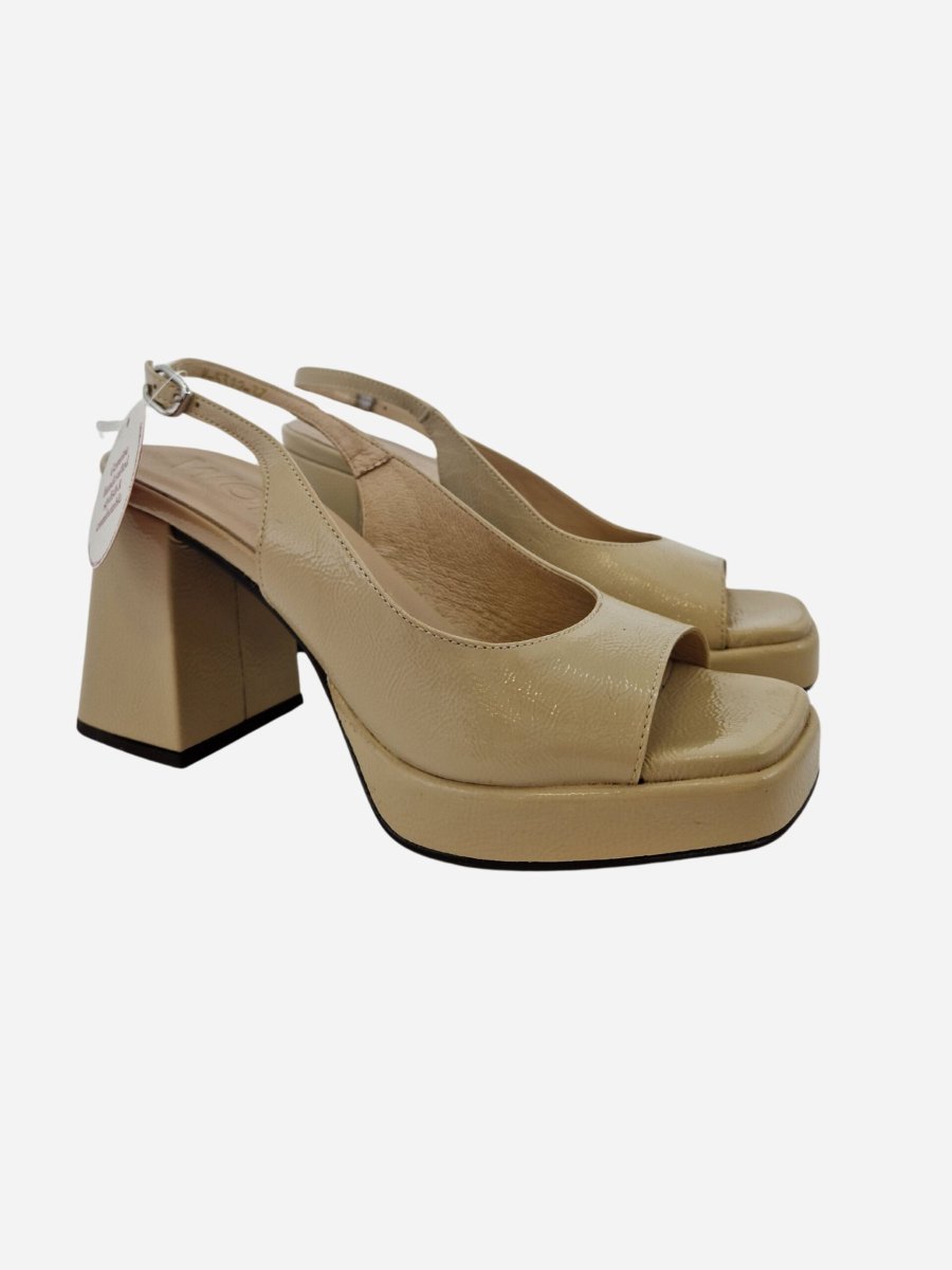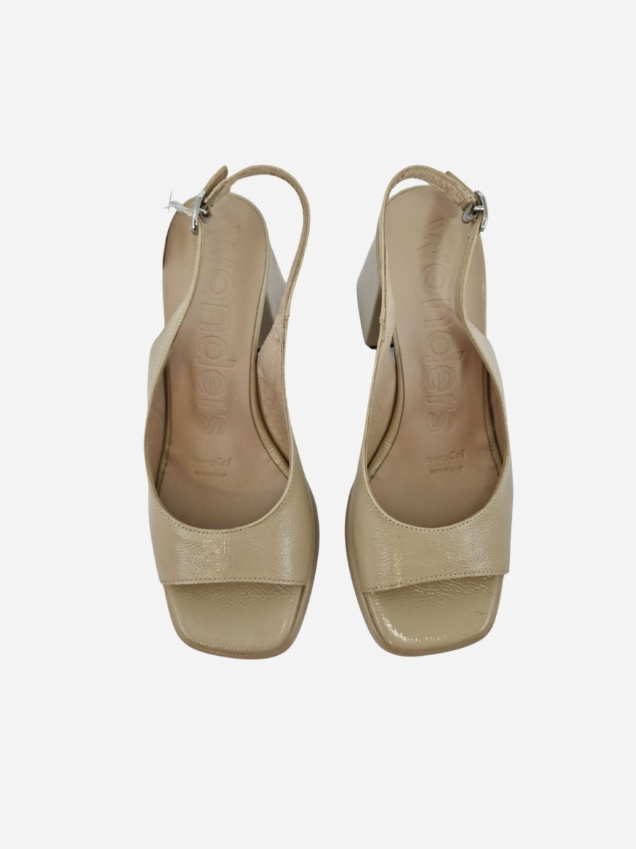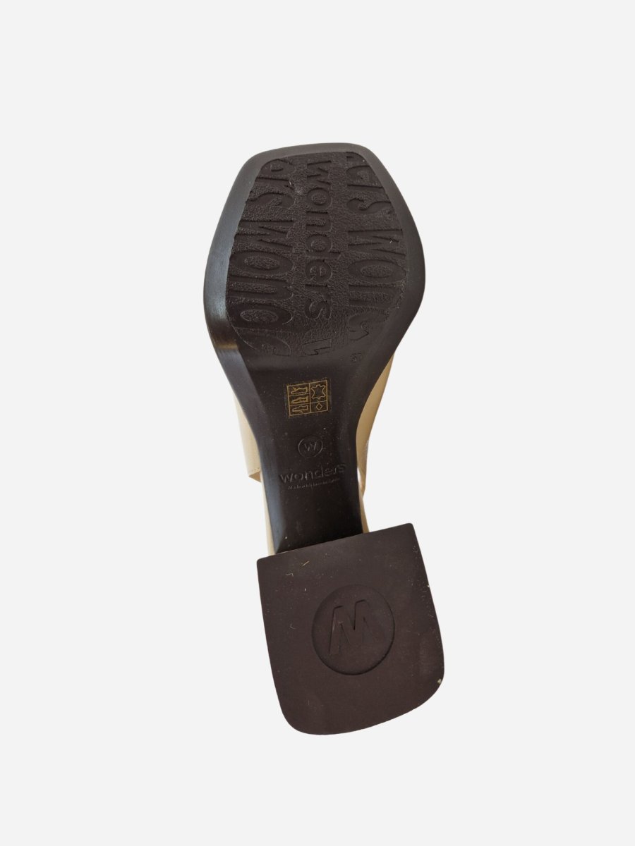 Sandalo con tacco by Wonders. Scarpe realizzate in naplak beige con suola in gomma. Comodo tacco largo di 9 cm. Scollo quadrato. Chiusura con cinturino posteriore.