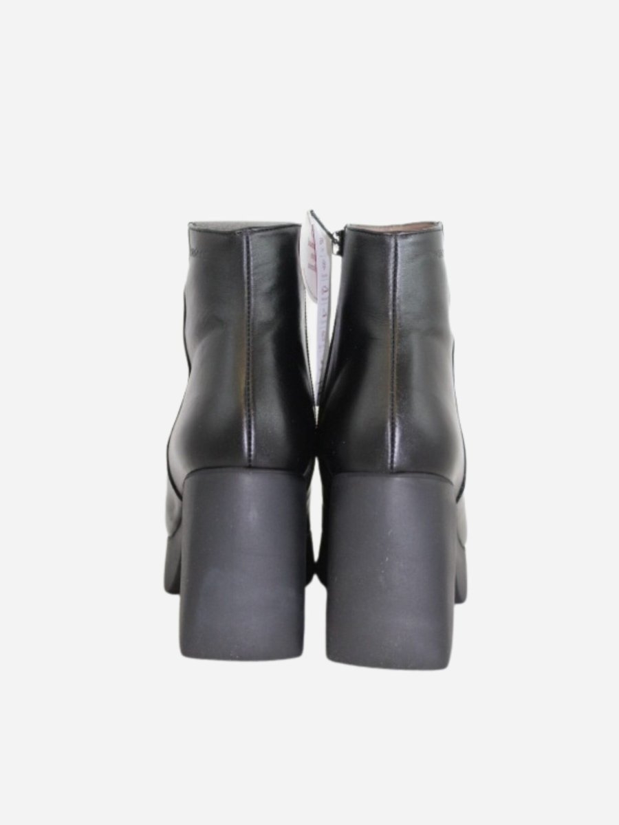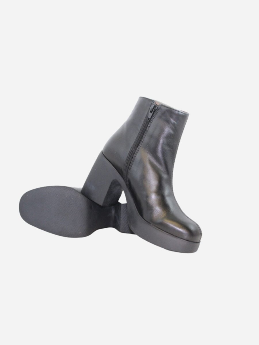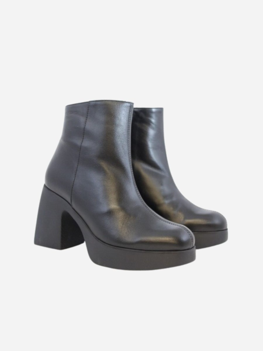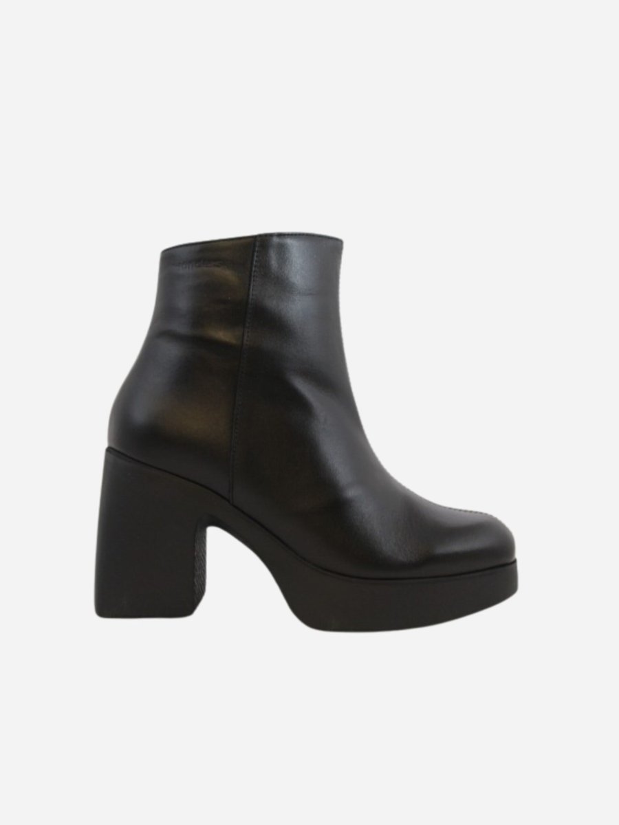 Tronchetto da donna by Wonders. Stivaletto realizzato in vera pelle nera con plateau. Tacco largo di 9 cm. Chiusura con cerniera laterale.